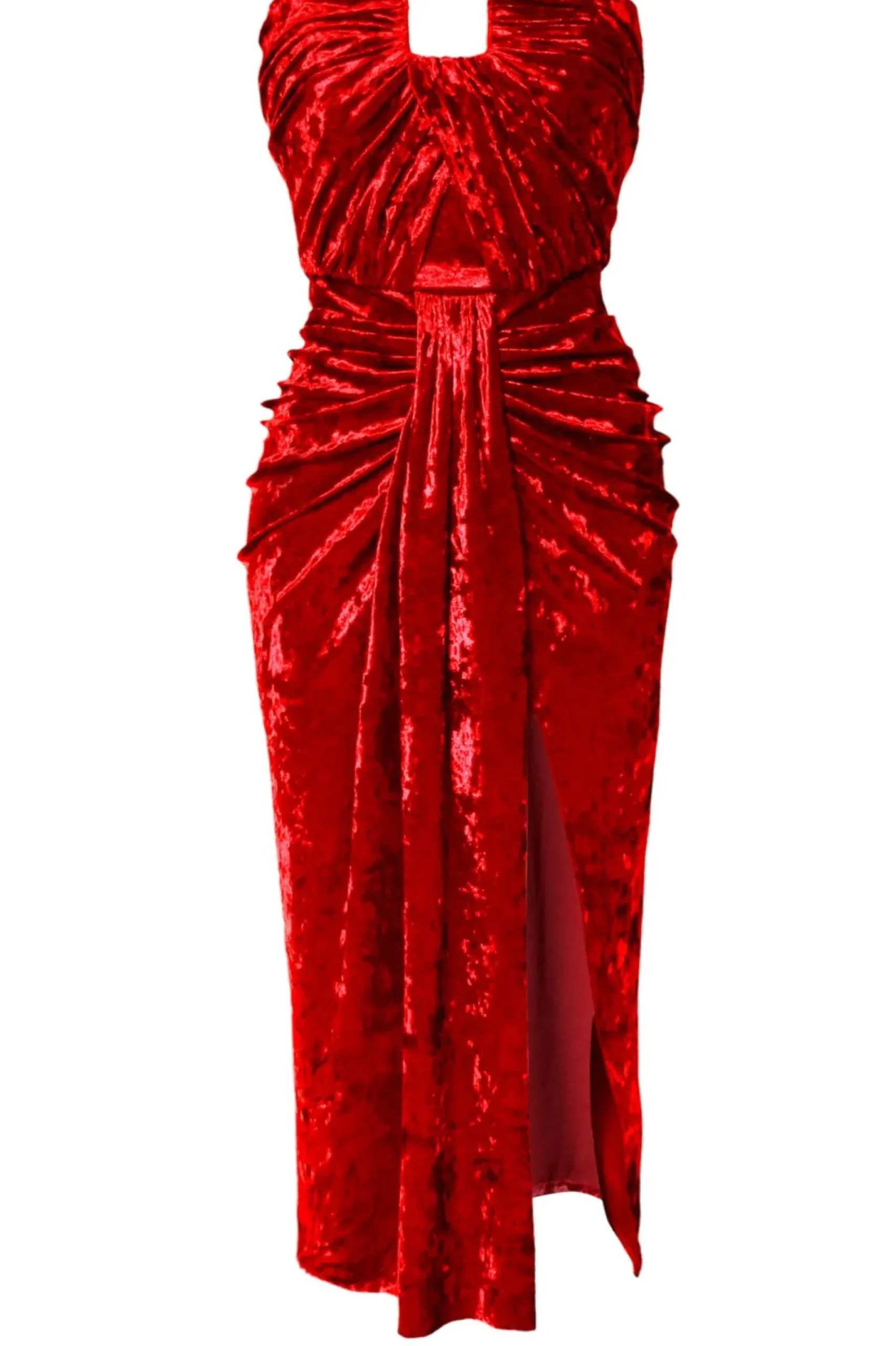 Zmyslowa Sukienka Midi Uszyta Z „Pomietego” Lejacego Aksamitu. Gorsetowy Top O Oryginalnym Prostokatnym Kroju Podkreslajacym Dekolt. Wysokie Rozciecie Odslaniajace Lewe Udo.