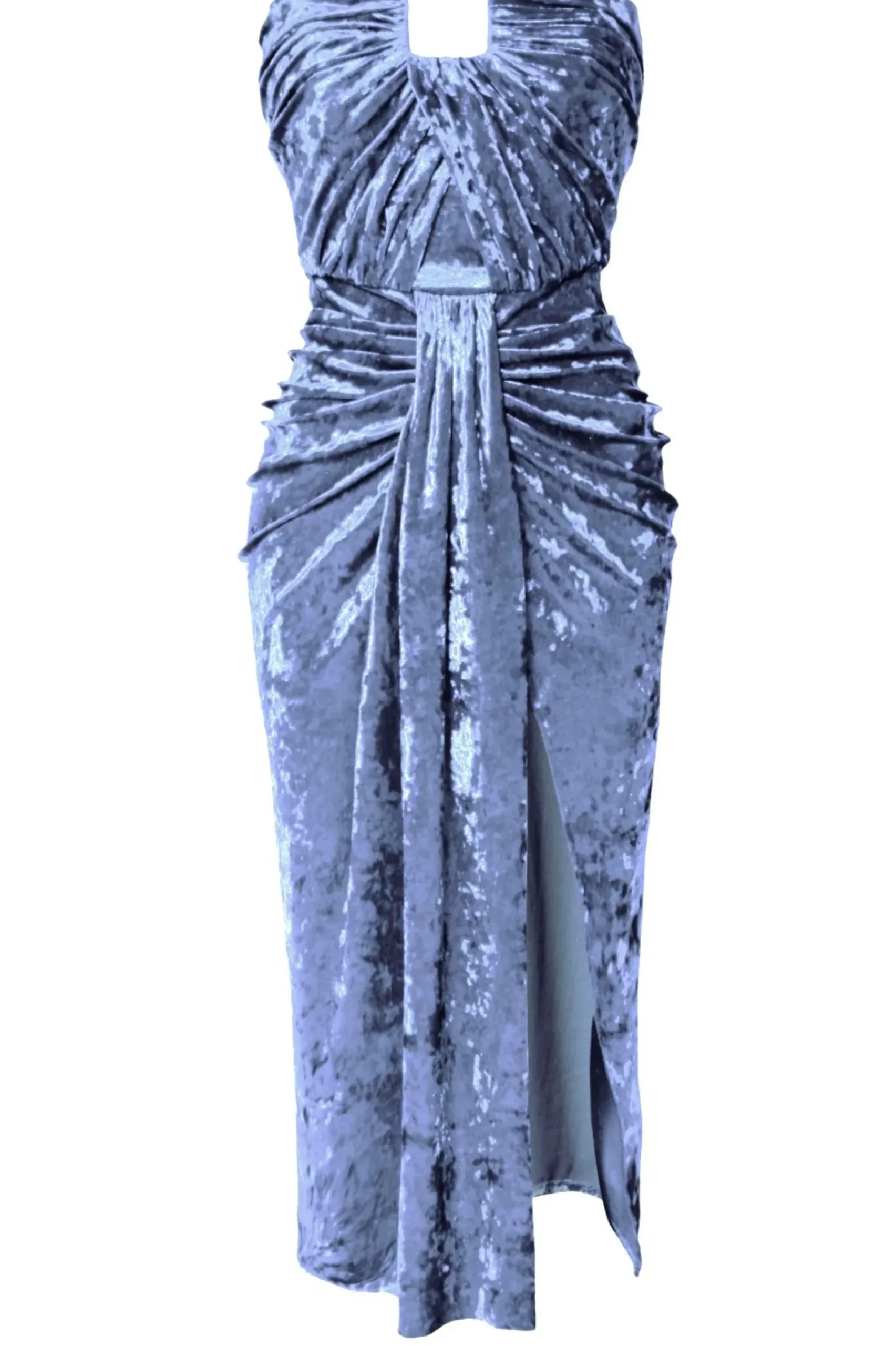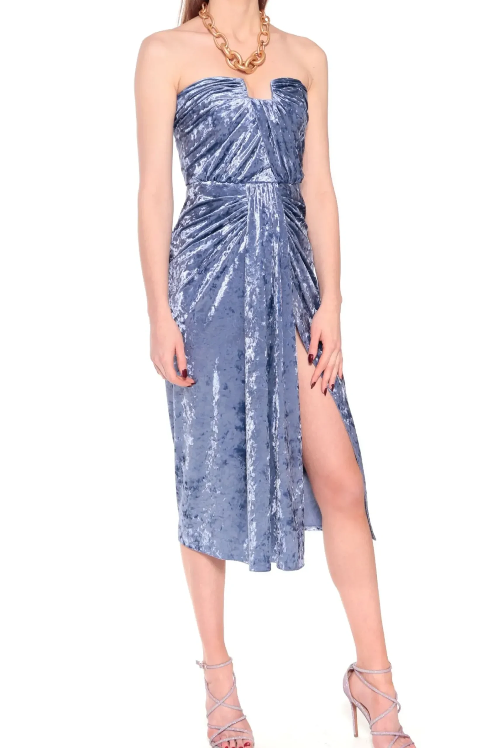 Zmyslowa Sukienka Midi Uszyta Z „Pomietego” Lejacego Aksamitu. Gorsetowy Top O Oryginalnym Prostokatnym Kroju Podkreslajacym Dekolt. Wysokie Rozciecie Odslaniajace Lewe Udo.