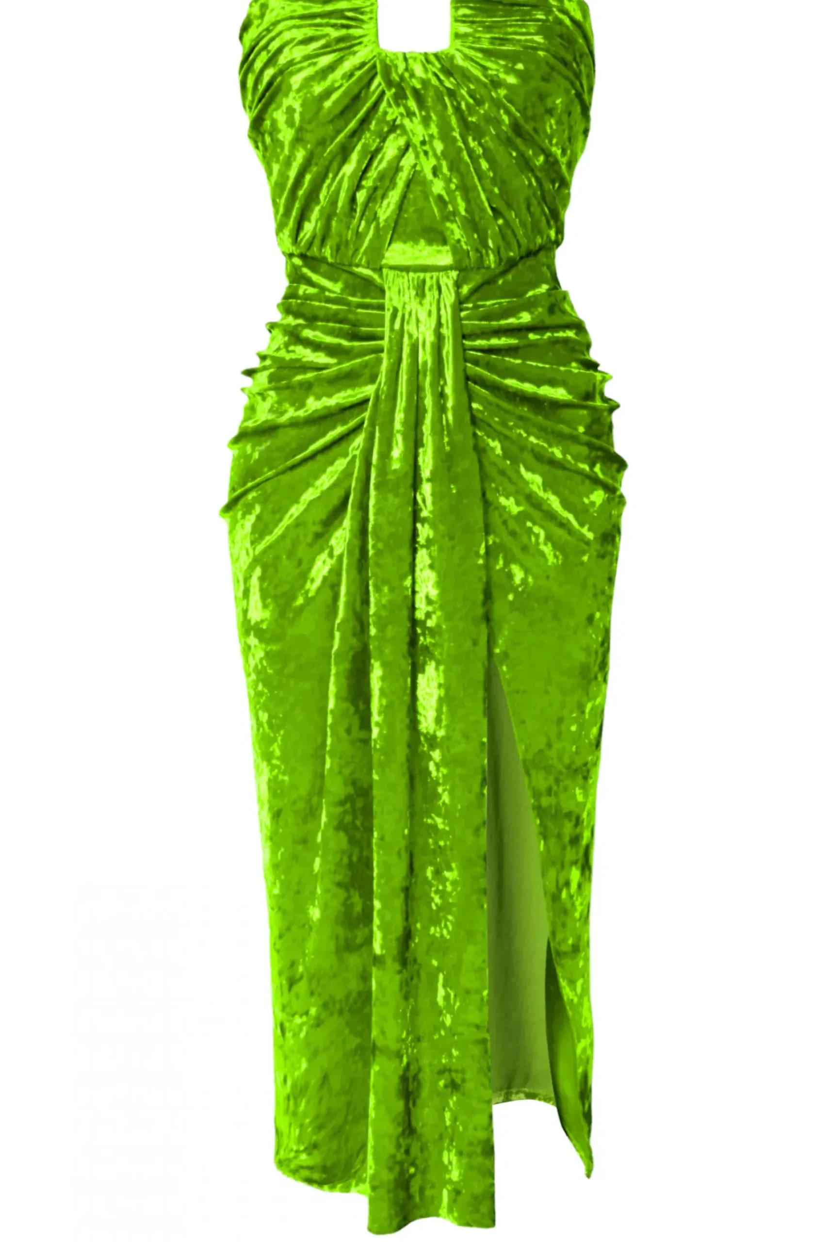 Zmyslowa Sukienka Midi Uszyta Z „Pomietego” Lejacego Aksamitu. Gorsetowy Top O Oryginalnym Prostokatnym Kroju Podkreslajacym Dekolt. Wysokie Rozciecie Odslaniajace Lewe Udo.