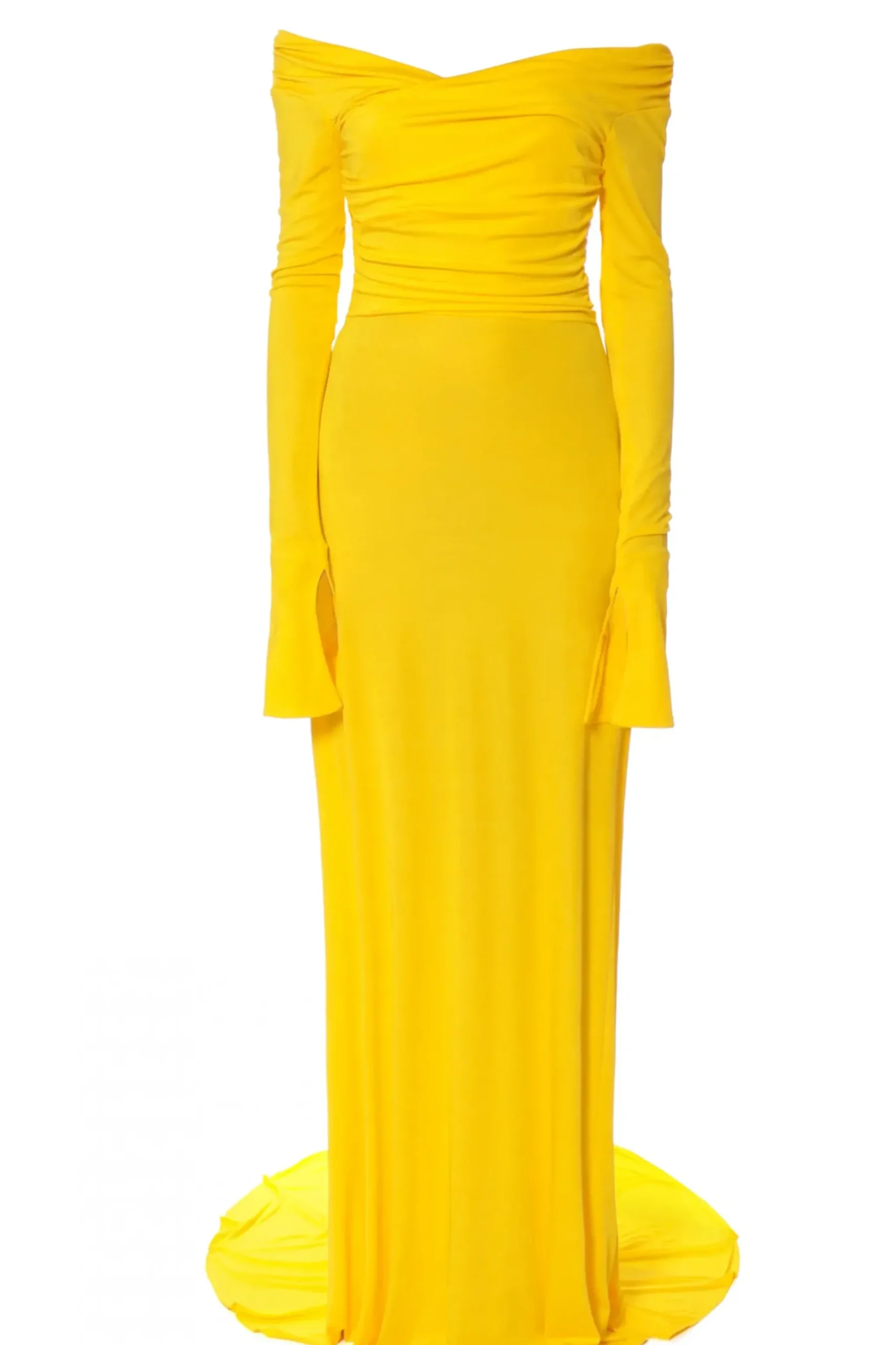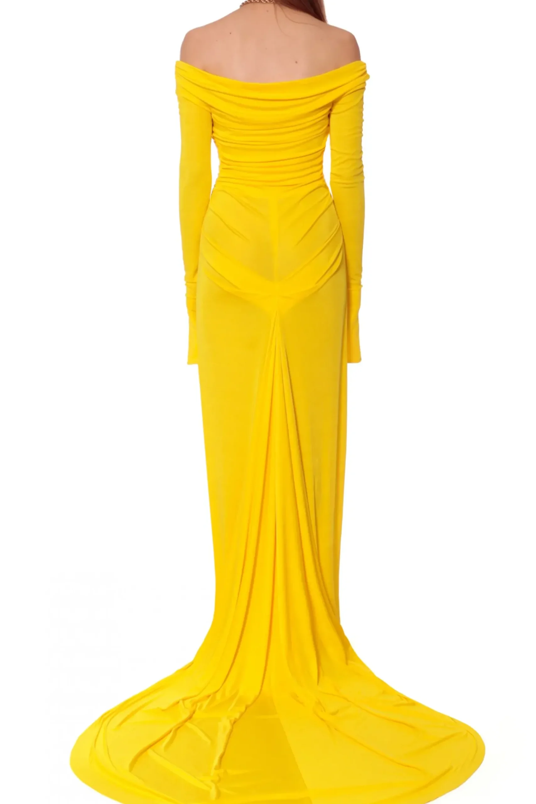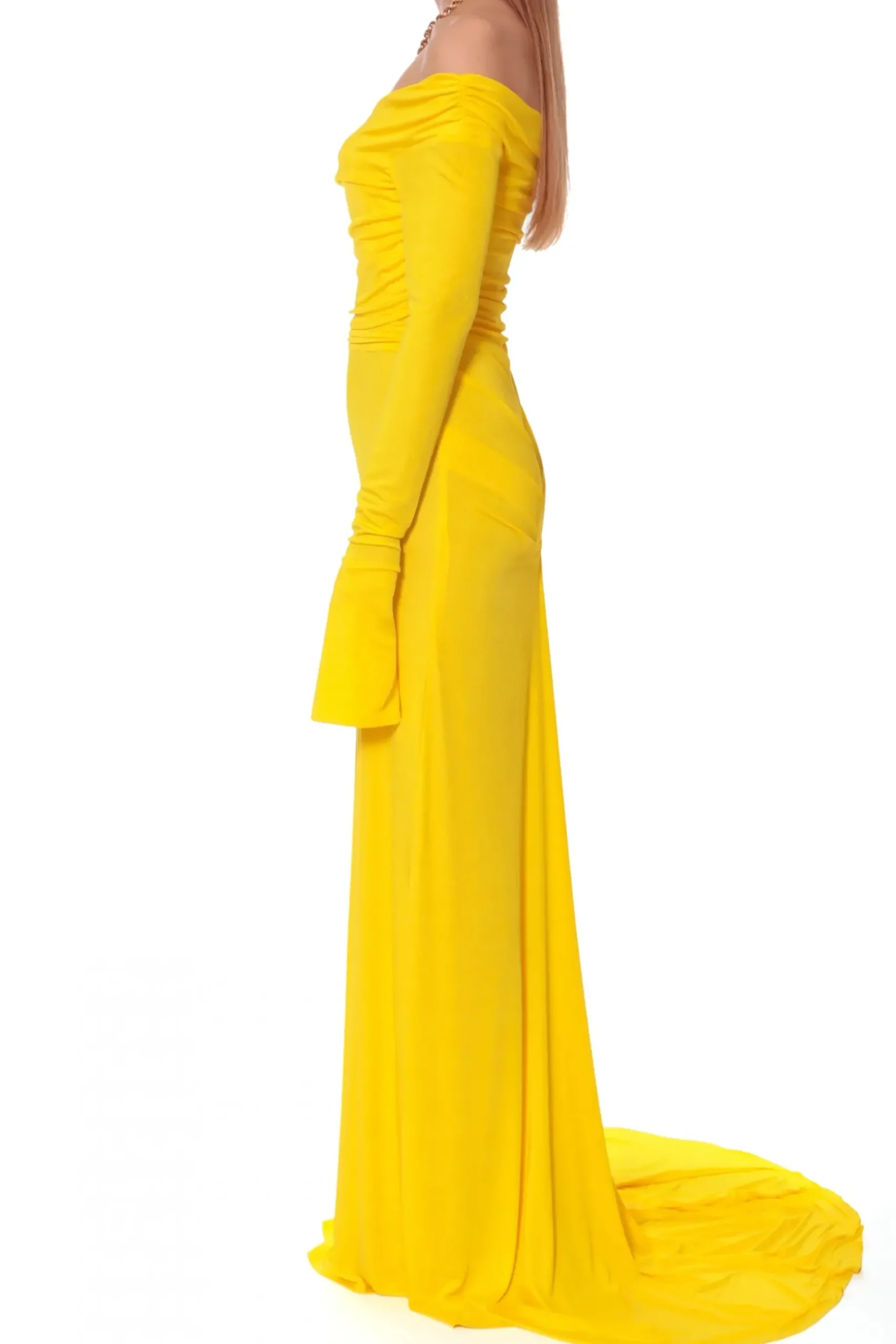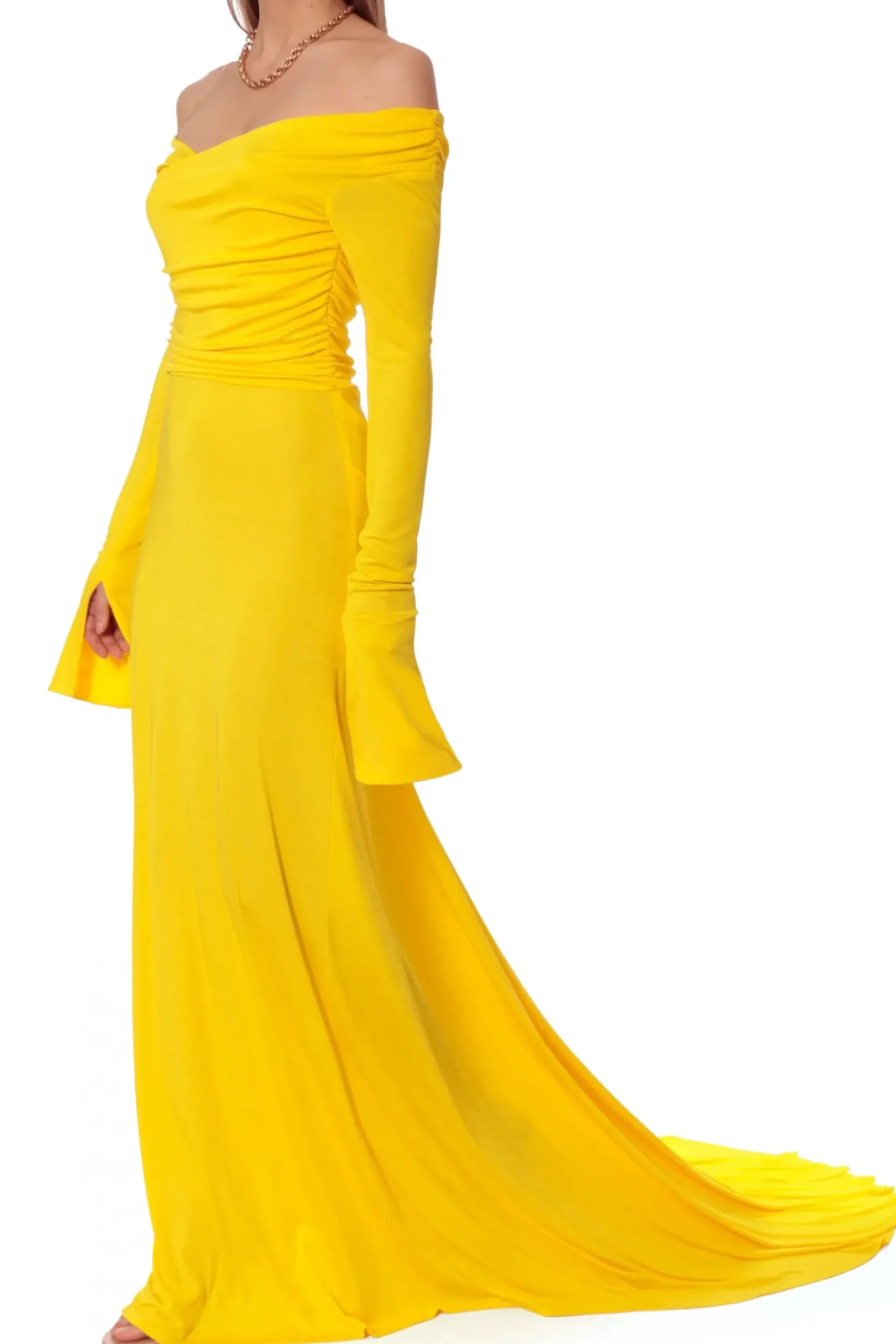 Sukienka Maxi Z Dlugim, Swobodnie Opadajacym Trenem. Dlugie Rekawy Siegajace Mocno Poza Dlonie, Delikatne Marszczenia Wokol Ramion I Tali.