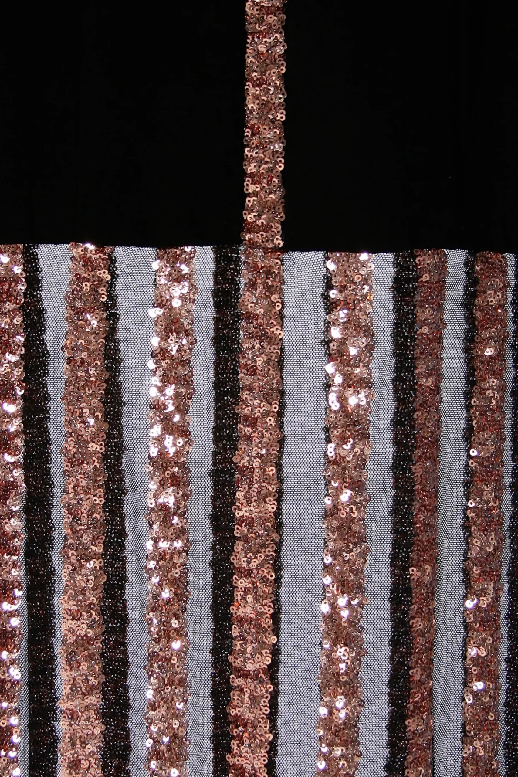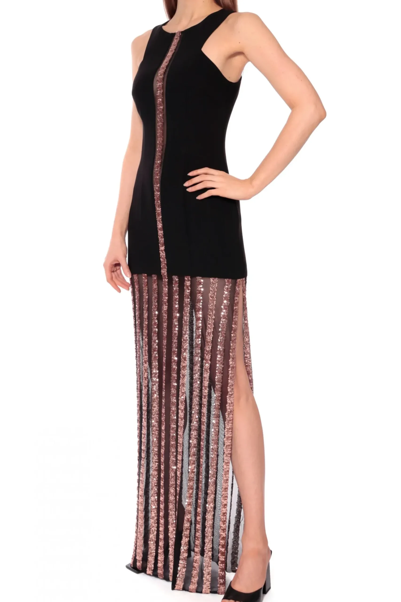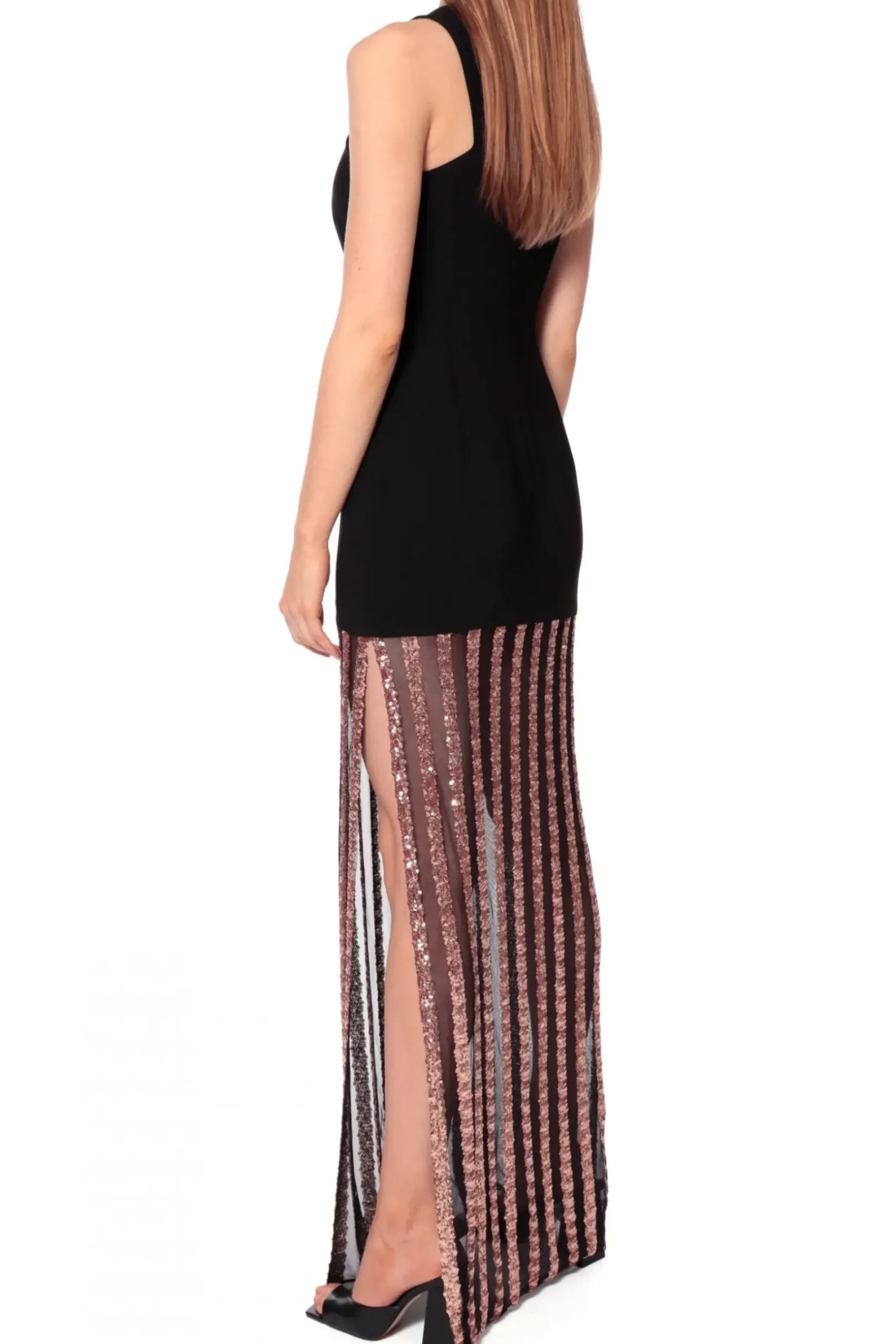 Sukienka Wieczorowa Bez Rekawow O Dopasowanym Kroju I Rozcieciem Z Boku. Zestawienie Dwoch Materialow Laczy W Sobie Dwie Dlugosci : Mini I Maxi. Gorna Czesc Sukienki Z Ciekawym Wycieciem Wokol Ramion. Dolna Czesc Uszyta Jest Z Delikatnej Siateczki Z Cekinami.
