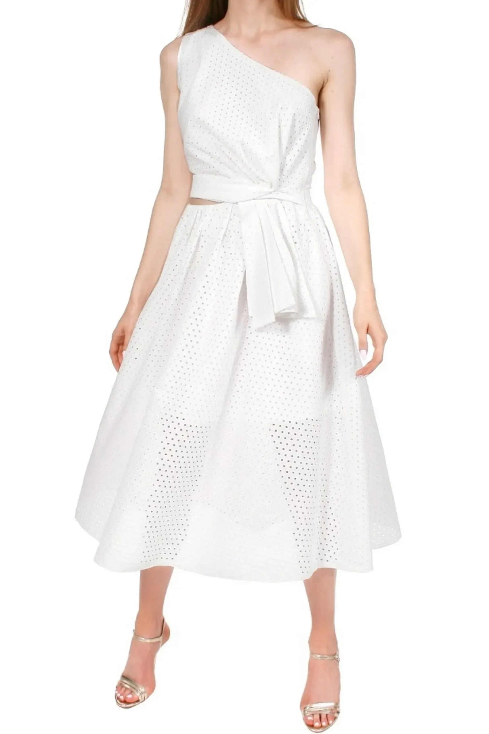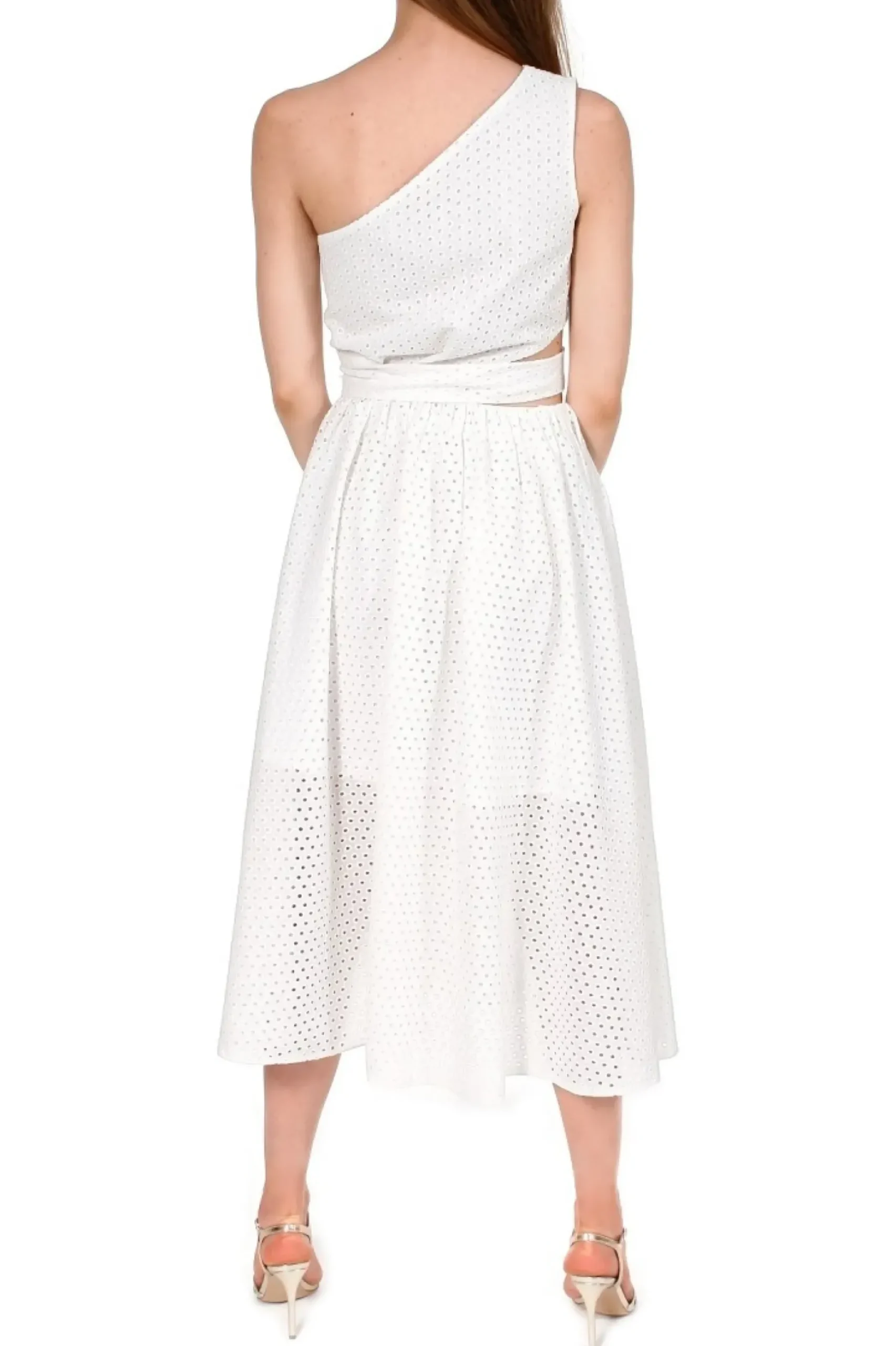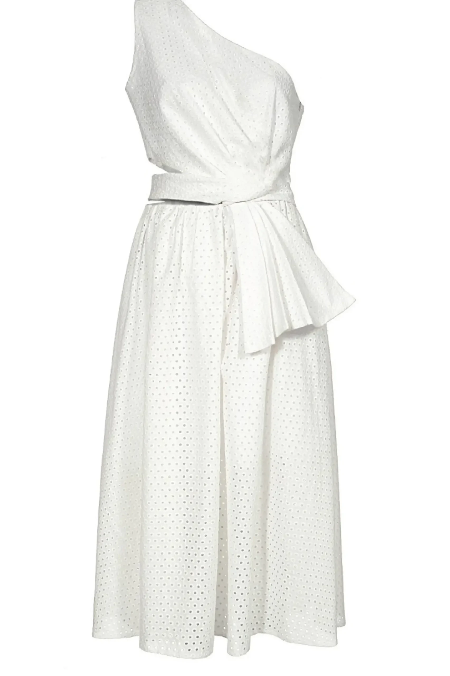 Sukienka Midi Uszyta Z Haftowanej Bawelny W Kremowym Odcieniu. Asymetryczny Kroj Odslaniajacy Jedno Ramie Oraz Fragment Talii. Drapowania, Zakladki I Marszczenie Nadaja Projektowi Rzezbiarskiej Przestrzeni. Marszczony, Rozkloszowany Dol Sukienki O Dlugosci Midi. W Szwach Bocznych Kieszenie, Zapinana Z Boku Na Zamek Blyskawiczny. Projekt Zestawiony Z Sandalami Na Szpilce Miejski Tworzy Bardzo Elegancka, Letnia Stylizacje.