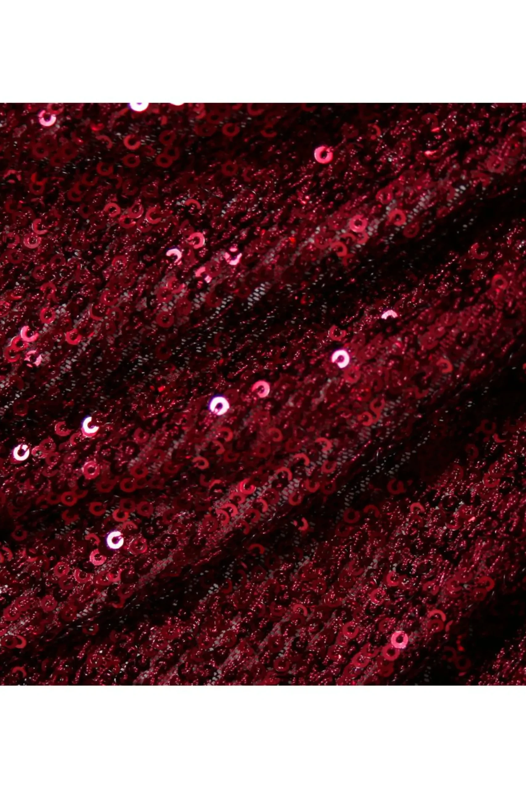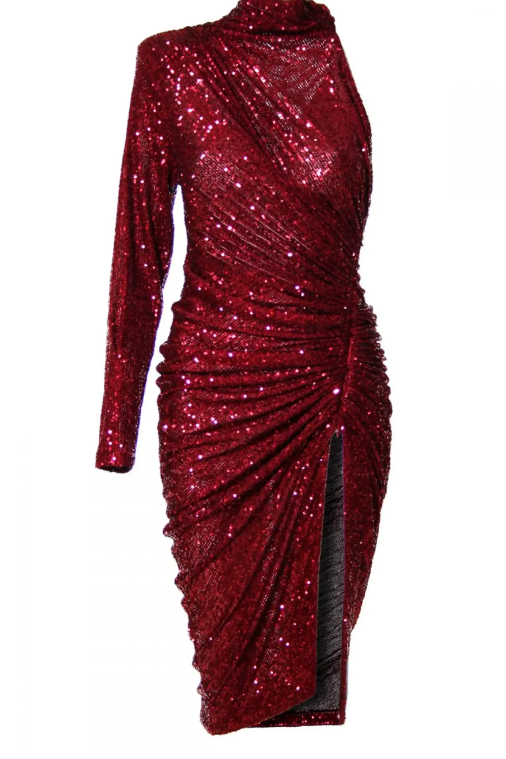 Dopasowana, Asymetryczna Sukienka Uszyta Z Elastycznego Materialu Wyszywanego Cekinami W Ciemnoburgundowym Odcieniu. Na Lewym Udzie Rozciecie Z Mozliwoscia Regulacji Jego Wysokosci Za Pomoca Zamka Blyskawicznego. Promieniste Drapowania Wokol Linii Bioder I Na Ramieniu Podkreslaja Atuty Kobiecej Sylwetki. Drapowana Stojka Zapinana Na Oblekane Szyfonem Guziki Z Petelka. Dlugi Rekaw Mocno Kontrastujacy Z Drugim Odkrytym Ramieniem. Sukienka Cekinowa Na Impreze,Wesele, Studniowke.