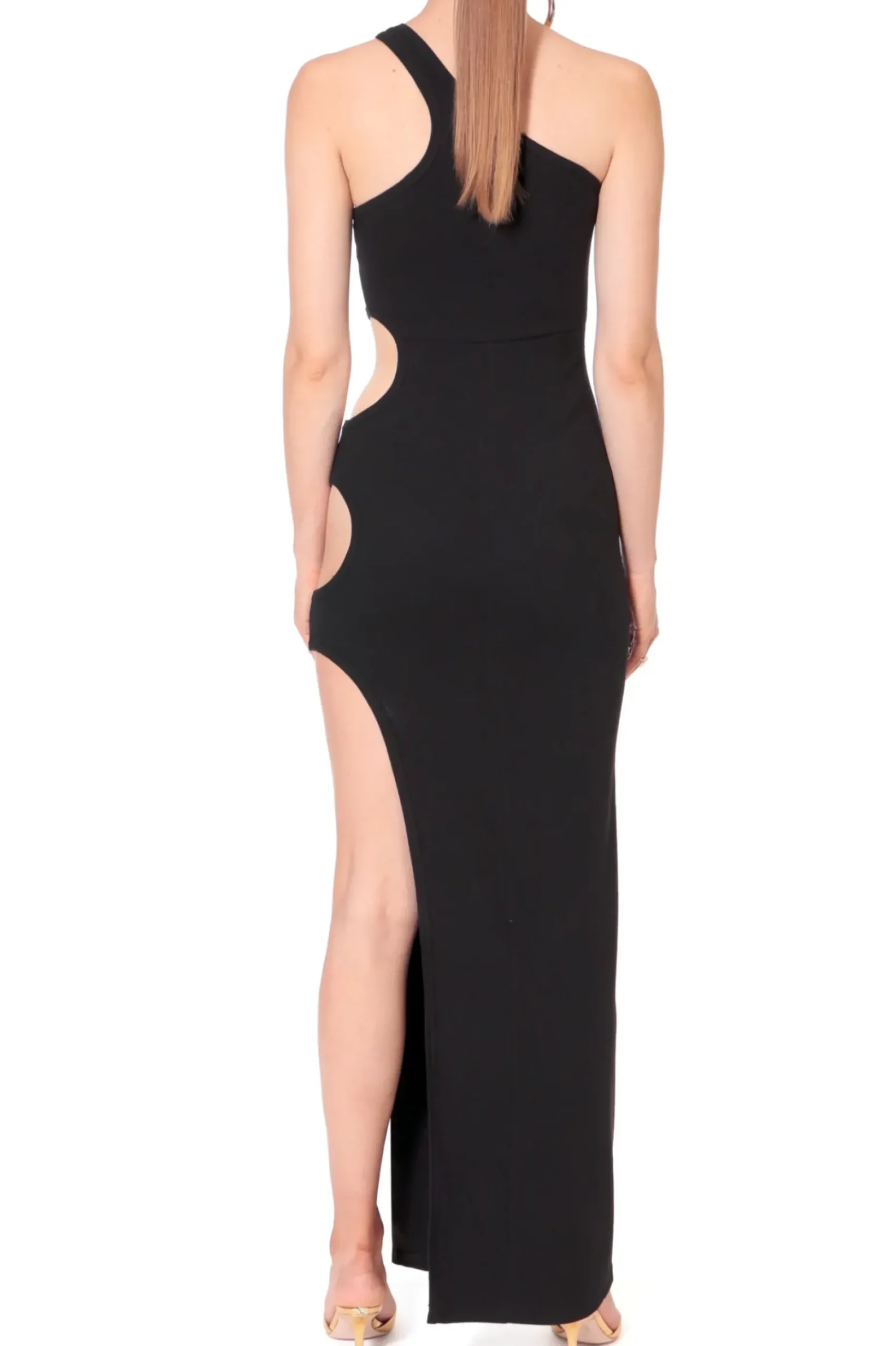 Asymetryczna Sukienka Maxi Ze Zmyslowymi Wycieciami Odslaniajacymi Czesciowo Talie I Biodro Oraz Mocno Eksponujacymi Noge.