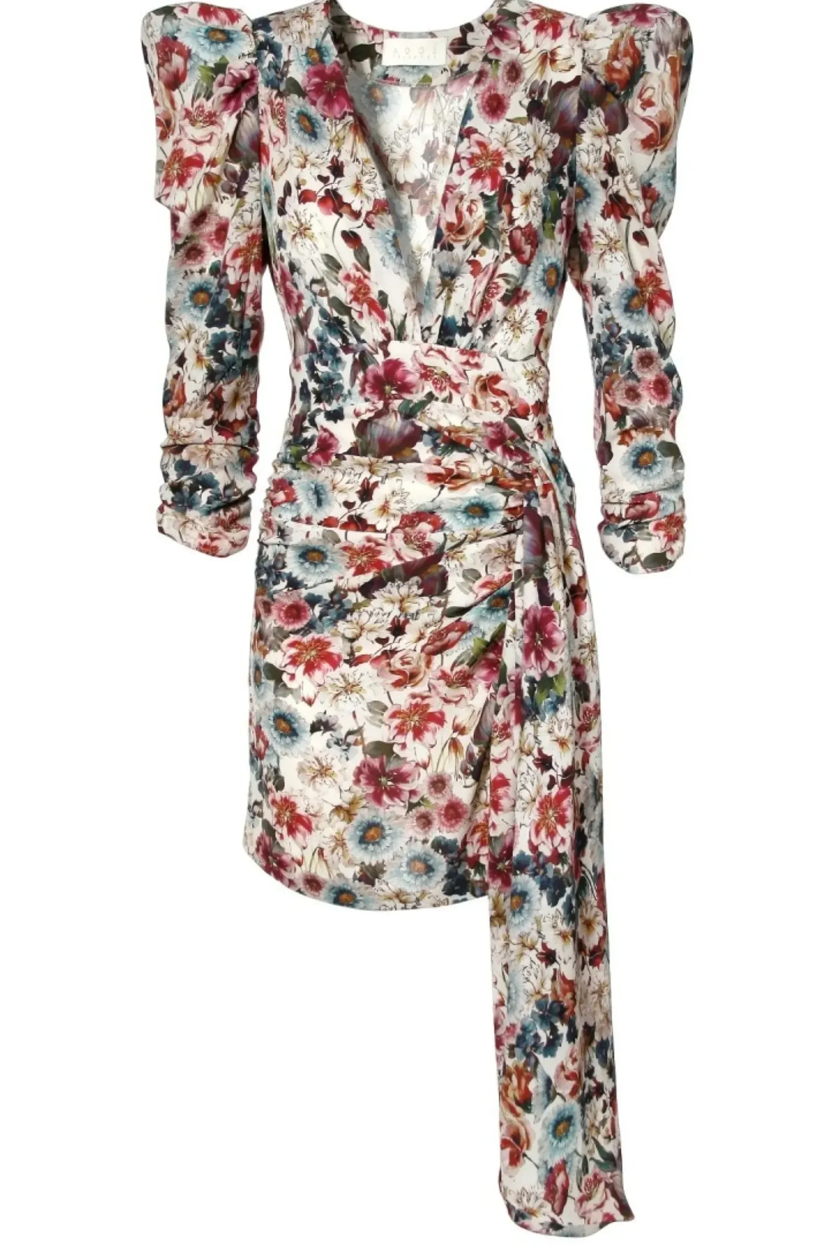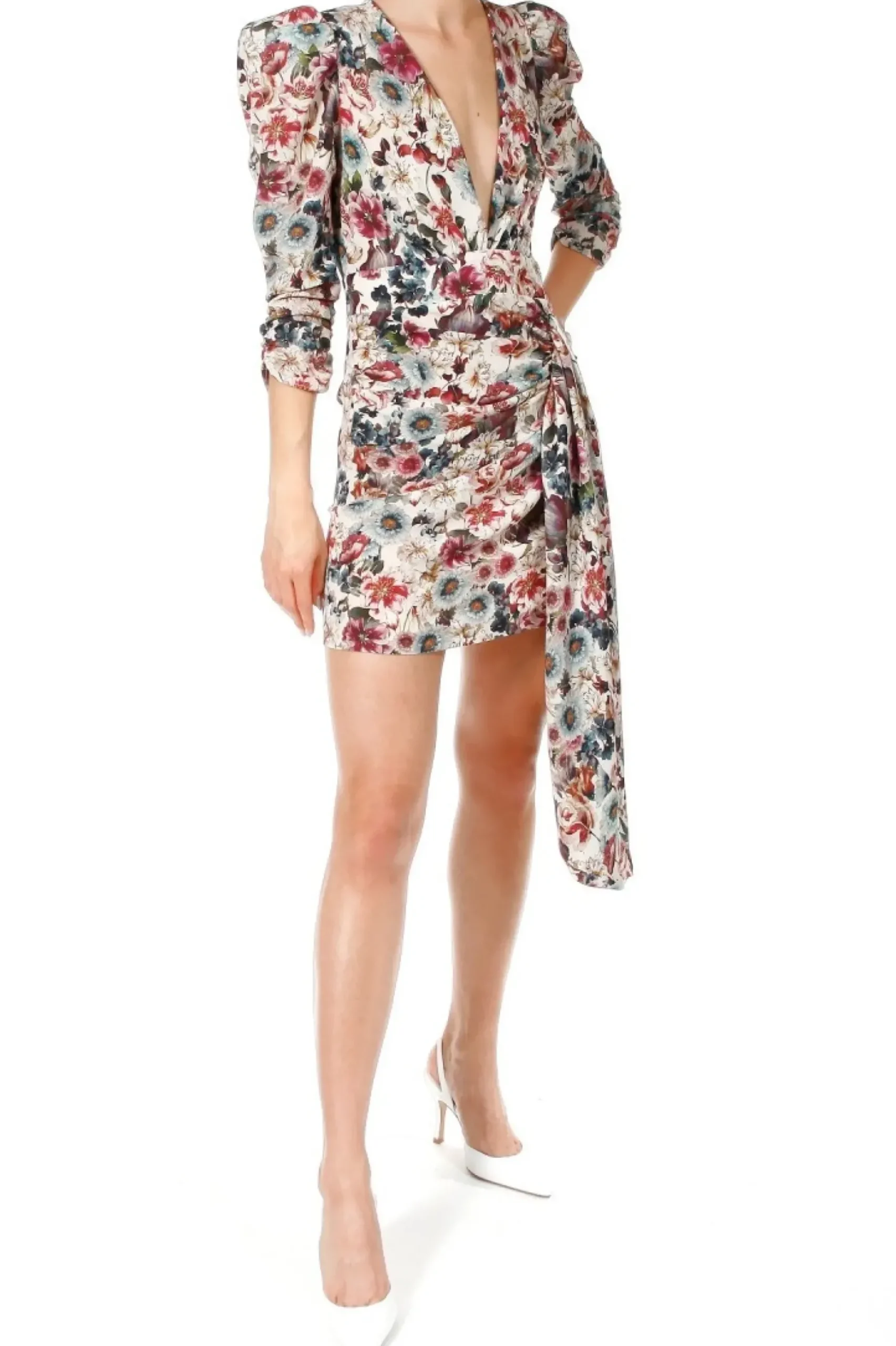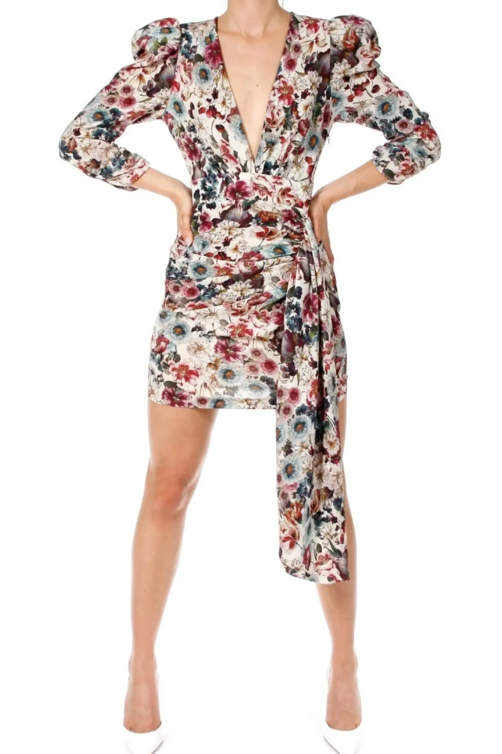 Sukienka Mini W Desen Kwiatowy Inspirowany Francuskim Impresjonizmem.Odwazny Dekolt, Bufiaste Drapowane Rekawy Z Wszyta Poduszka Nawiazuja Do Stylu Lat 80-Tych.Dol Sukienki Drapowany Na Przodzie I Ozdobiony Fantazyjnie Ukladajacym Sie Elementem.Sukienka Zapinana Jest Z Boku Na Kryty Zamek.