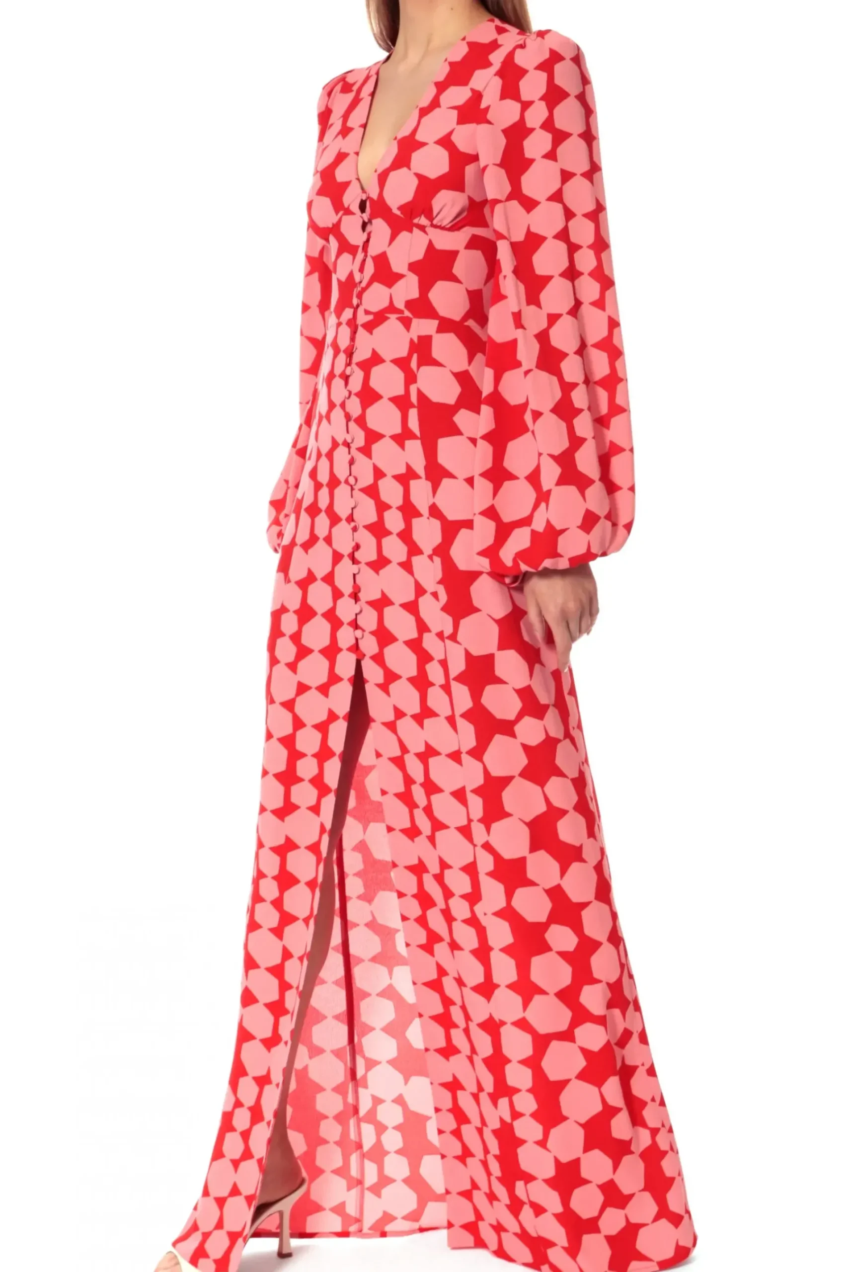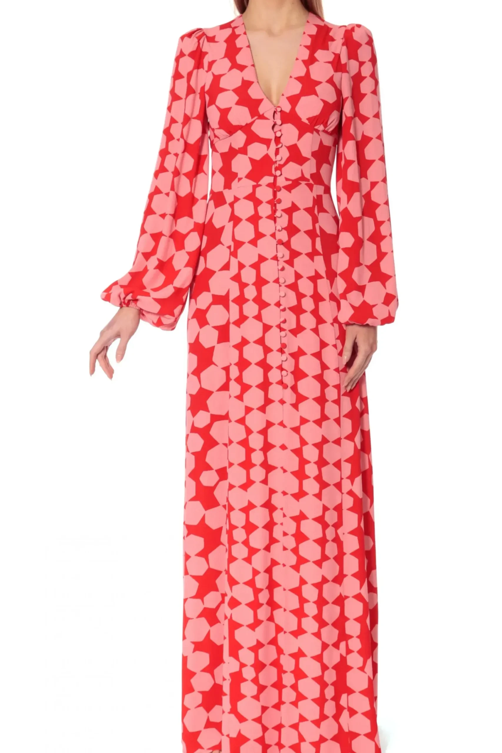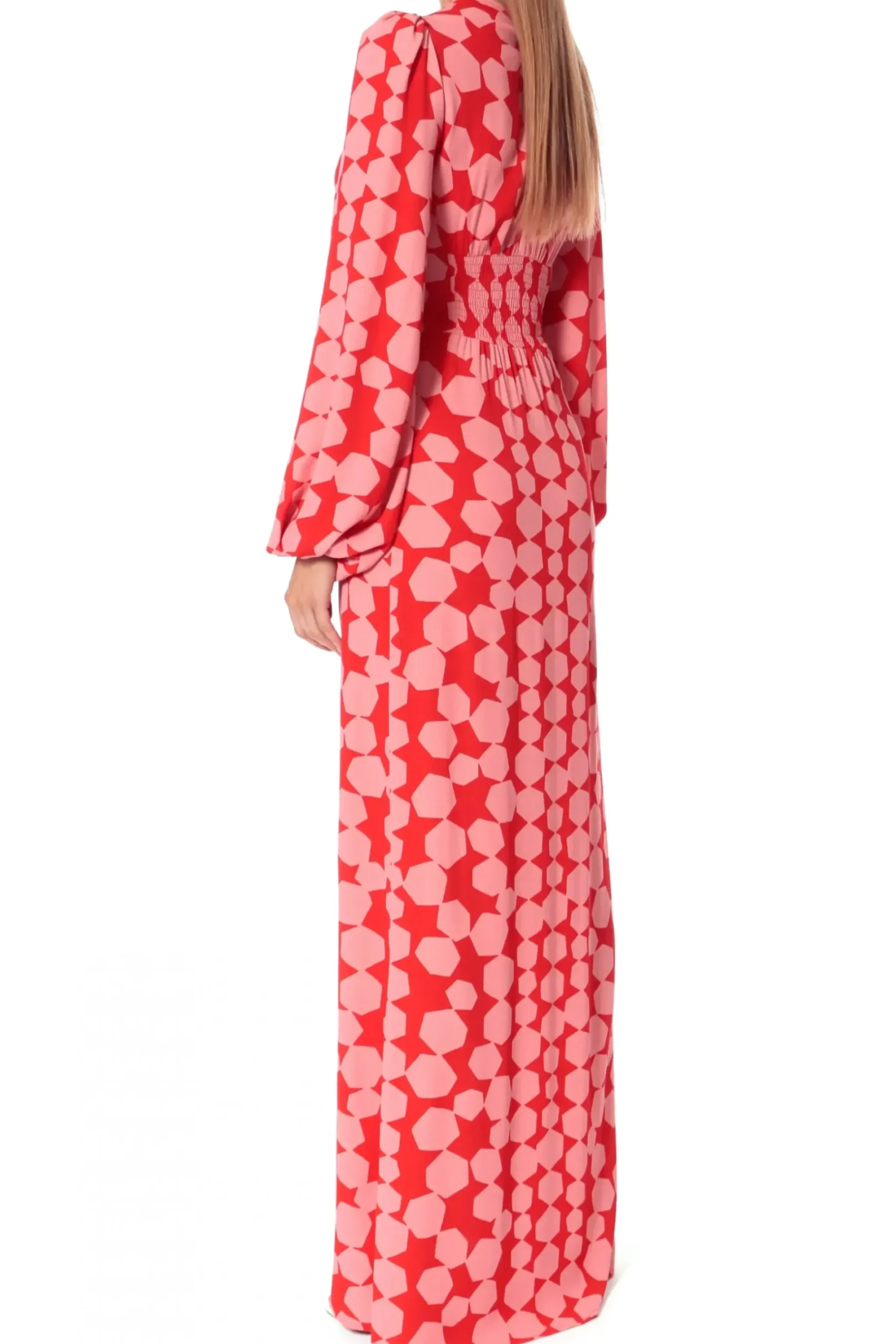 Suknia Maxi Uszyta Z Krepy Wiskozowej W Nowoczesny Desen Laczacy Odcien Rozu Z Makowa, Zywa Czerwienia.