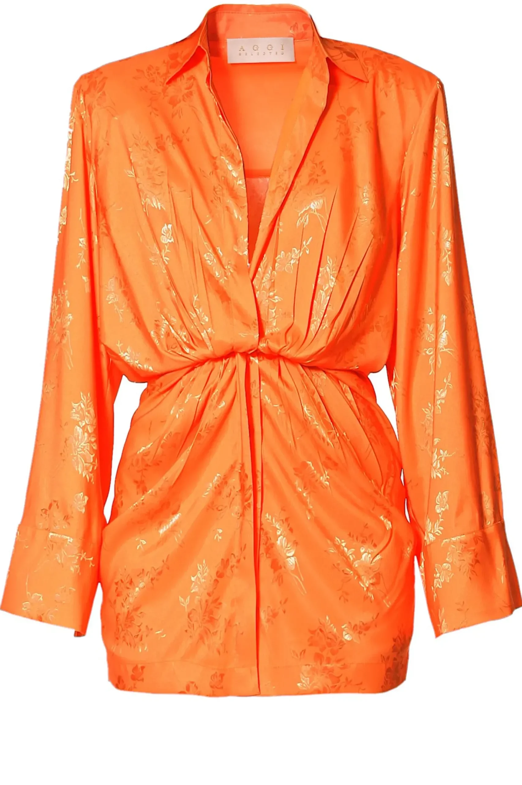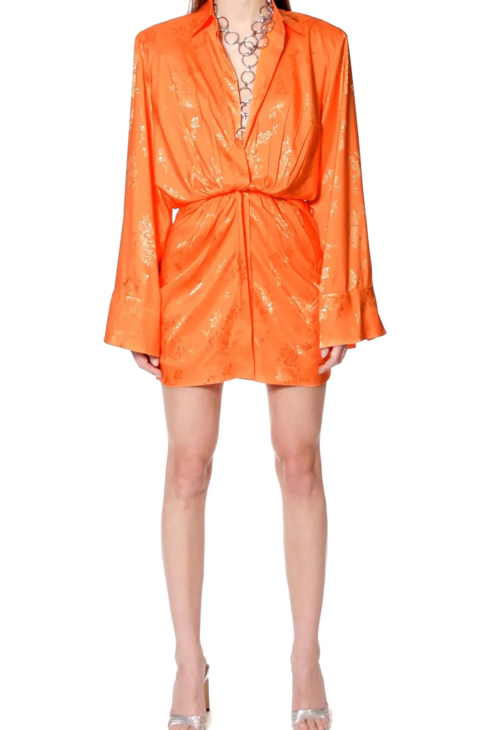 Sukienka Mini O Kroju Koszulowym Z Mocno Zaakcentowana Linia Ramion Uszyta Z Zakardowej Satyny W Drobny Kwiatowy Desen. Oversizowy Koszulowy Kroj Przelamany Promieniscie Ukladajacymi Sie Misternymi Zakladkami Kontrastuje Z Krotkim Dopasowanym Dolem. Przeskalowane Rekawy O Dlugosci Maxi Wykonczone Szerokimi Mankietami. Czesciowo Na Zorzetowej Podszewce.