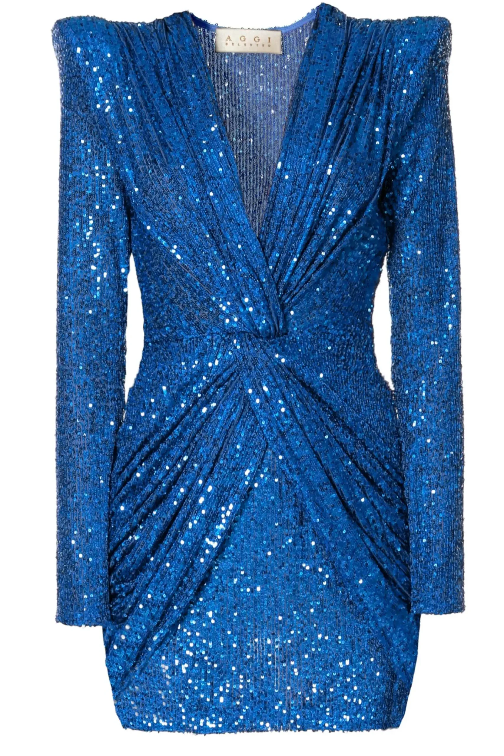 Wieczorowo-Koktajlowa Sukienka Mini Wyszywana Polyskujacymi, Drobnymi Cekinami W Intensywnym Kobaltowym Kolorze. Mocno Zarysowana, Futurystyczna Linia Ramion, Gleboki Dekolt, Bogate Drapowania I Efektowny Supel W Talii Skladaja Sie Na Spektakularny Charakter Projektu. Sukienka Cekinowa Na Wieczorne Wyjscie, Noc Sylwestrowa, Wesele.