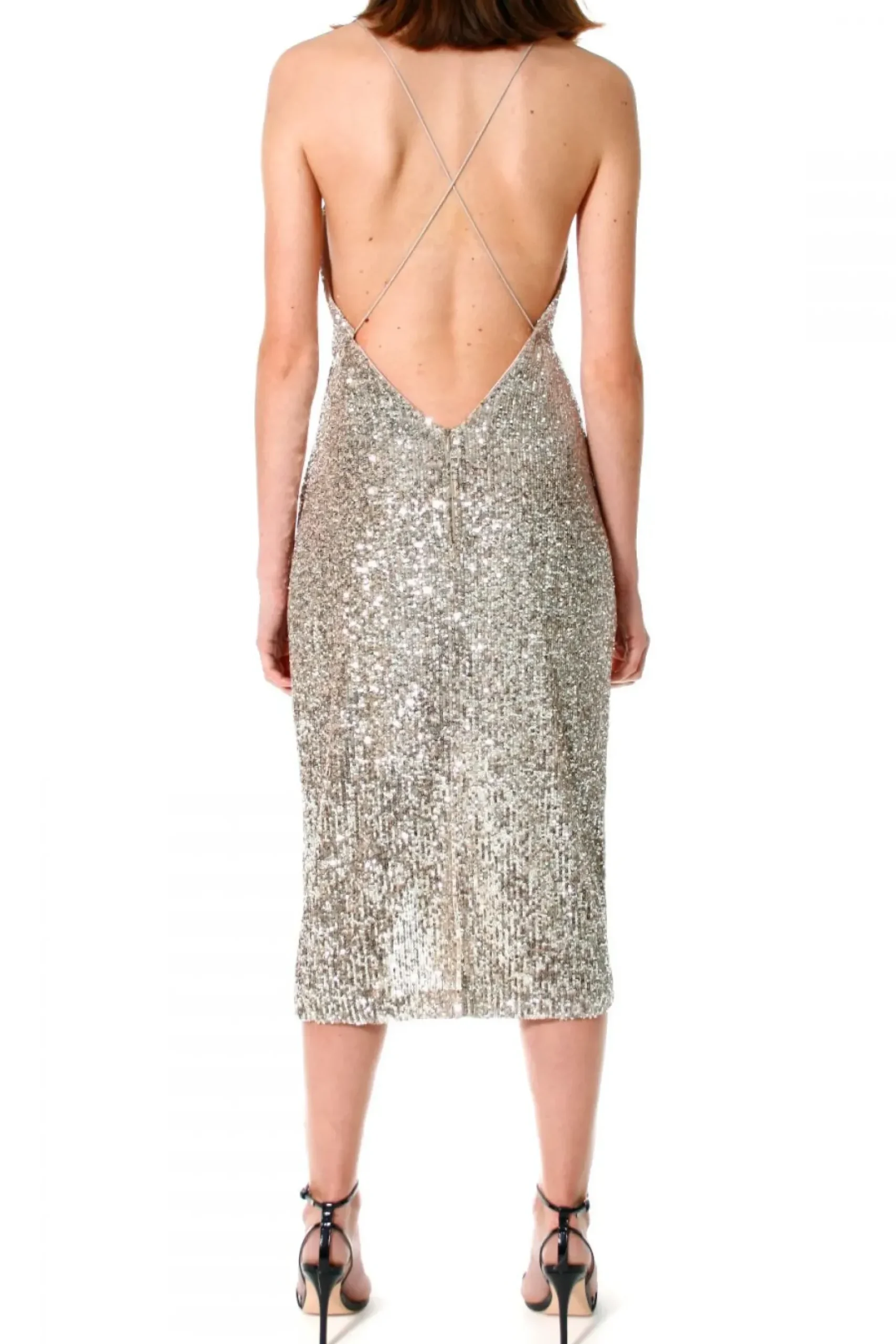 Sukienka Midi Wyszywana Drobnymi Polyskujacymi Cekinami. Dekolt Z Drapowaniem Ukladajacym Sie W Miekka Fale.