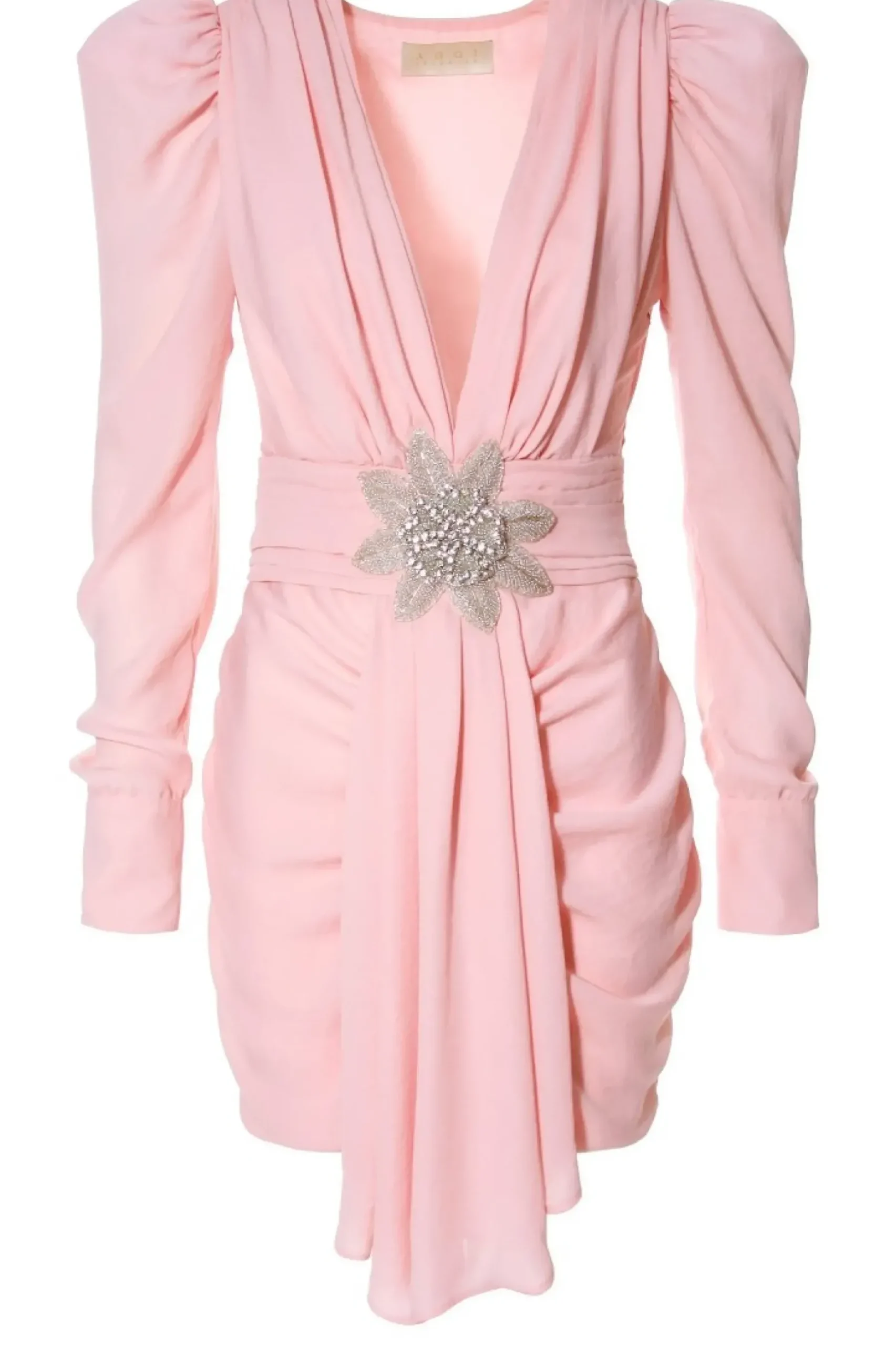 Sukienka Mini Uszyta Z Krepy Szyfonowej. Gleboki, Zdecydowany Dekolt. W Talii Wszyty Szeroki, Mocno Drapowany Pas Ozdobiony Duza Aplikacja Misternie Wykonana Ze Szklanych Koralikow. Dlugie, Bufiaste Rekawy Zakonczone Szerokim Mankietem Zapinanym Na Malutkie Oblekane Guziki Z Petelka. Dol Sukienki Dopasowany, Z Marszczeniami Na Przodzie I Ozdobnym Dluzszym Od Sukienki Elementem. Z Boku Wszyty Zamek Blyskawiczny Dobierz Do Niej Sandaly Na Wysokiej Szpilce Lub Wieczorowe Ozdobne Klapki.