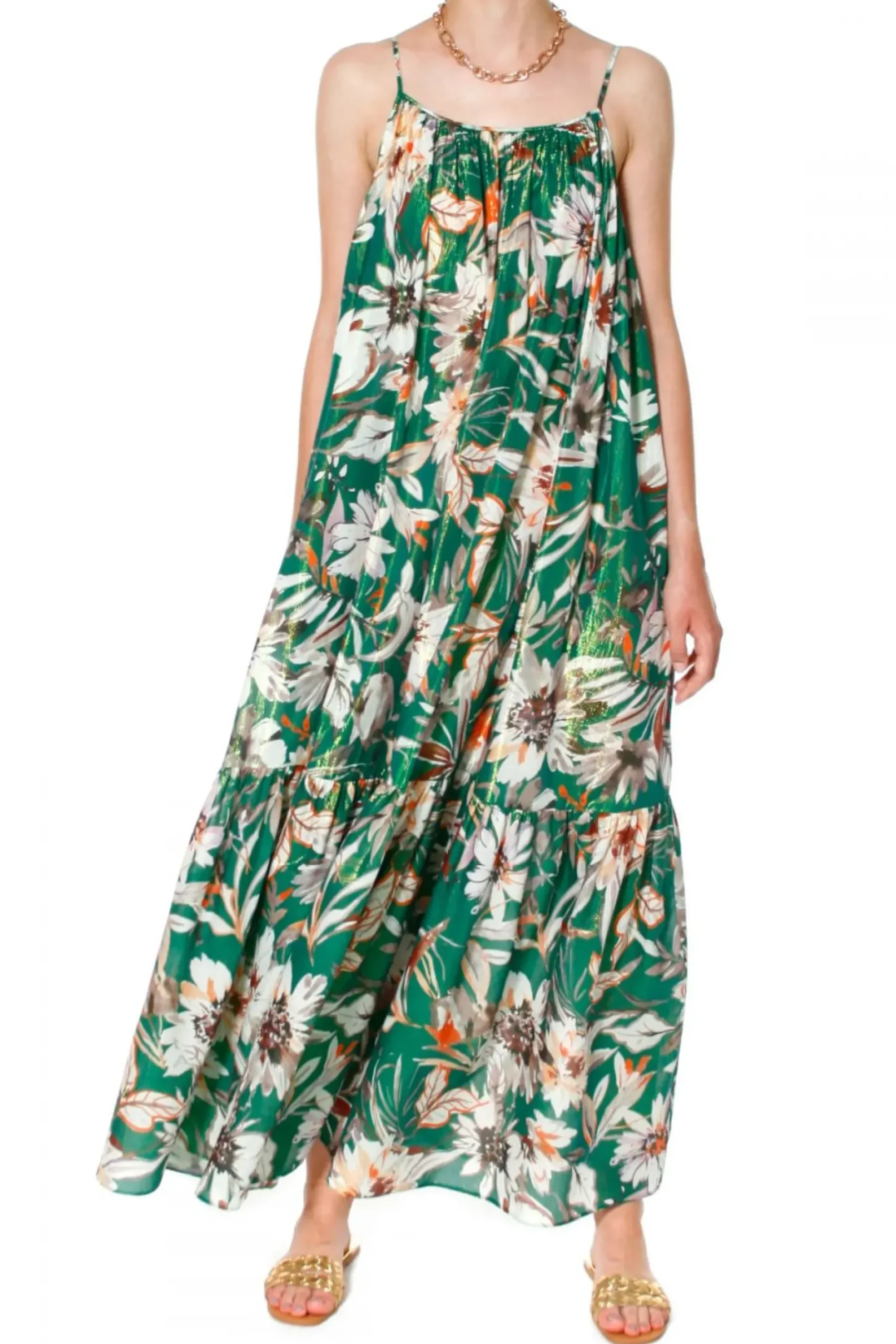 Suknia Maxi W Stylu Boho Uszyta Z Delikatnego Batystu Z Dodatkiem Miekkiej Nici Metalicznej, Ktora Gesto Wpleciona Subtelnie Odbija Swiatlo I Nadaje Tkaninie Szlachetnego Perlowo-Zlotego Polysku. Przeskalowana Przestrzenna Forma „Zawieszona” Na Cieniutkich Ramiaczkach Typu Makaroniki. Bogato Marszczona Falbana I Malarski Desen Kwiatowy Tworza Spektakularny Efekt. Obszerna, Kilkumetrowa Powierzchnia Batystu Tajemniczo Okrywa Sylwetke Pozostajac Jednoczesnie W Mocnym Kontrascie Z Gleboko I Zmyslowo Odslonietymi Plecami. W Upalne Dni Zaloz Do Niej Klapki, Zloty Lancuch I Slomkowa Fedore. W Chlodniejsze Letnie Dni Polacz Suknie Z Dzinsowa Kurtka I Sneakersami.