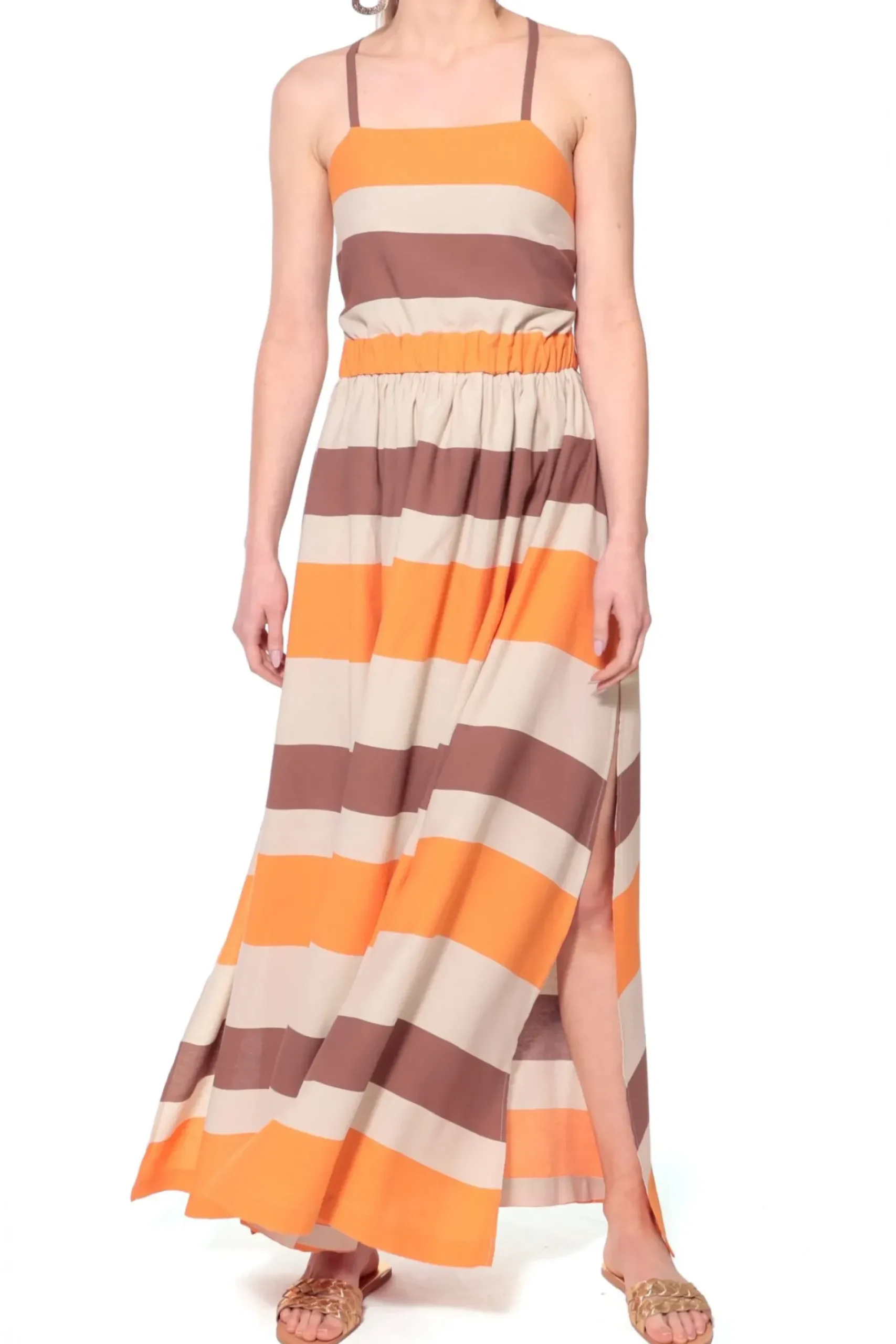 Letnia Suknia Maxi W Szerokie Pasy W Klimacie Wloskiej Riwiery.Zmyslowo Odkryte Plecy Ze Sznurowaniami.Delikatna, Minimalistyczna Gora Sukienki W Zestawieniu Z Obfitym Dolem Z Glebokimi Rozcieciami Nadaje Sylwetce Posagowosci.