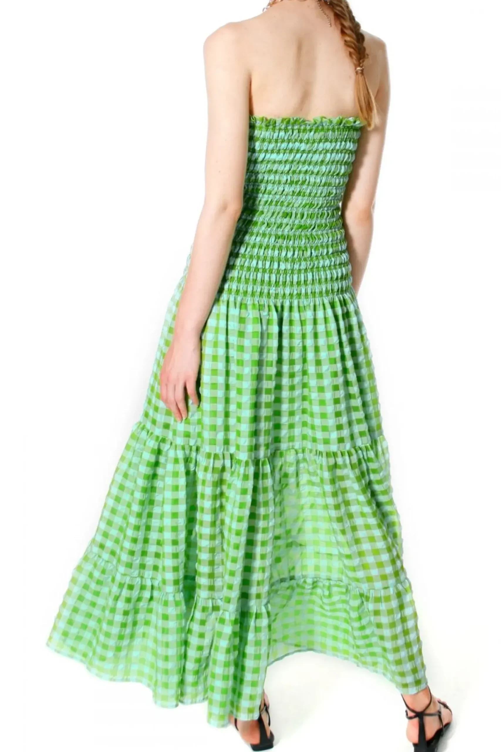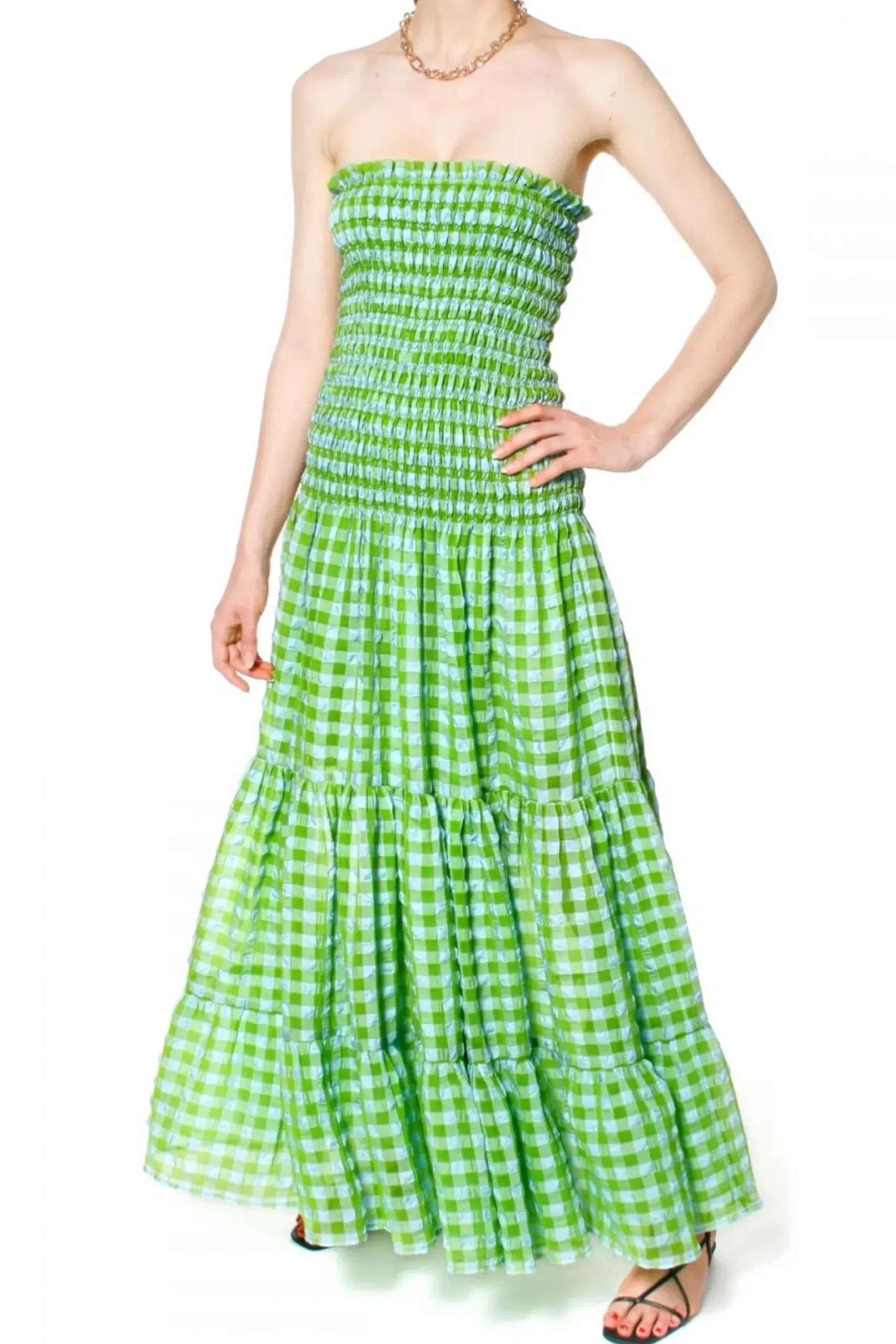 Sukienka Maxi W Kratke Vichy Inspirowana Romantycznym Stylem Riwiery Francuskiej. Uszyta Z Cienkiej, Zwiewnej Lekko Gniecionej Tkaniny. Linia Kobiecej Sylwetki Pieknie Podkreslona Gesto Marszczonymi Delikatnymi Gumeczkami. U Dolu Obfite Falbany Miekko Ukladajace Sie Podczas Ruchu. Nos Ja Ze Slomkowym Kapeluszem, Duzymi Kolczykami Oraz Dobierz Do Niej Sznurowane Sandalki Lub Bardziej Sportowe Espadryle Na Sznurkowej Podeszwie.