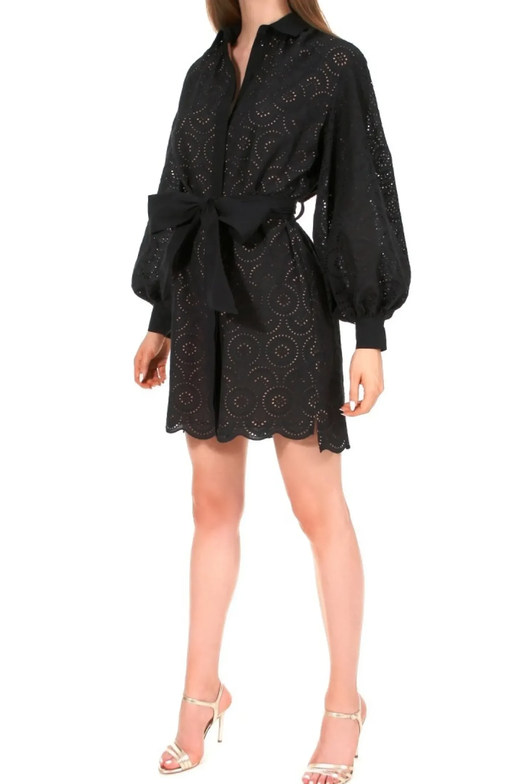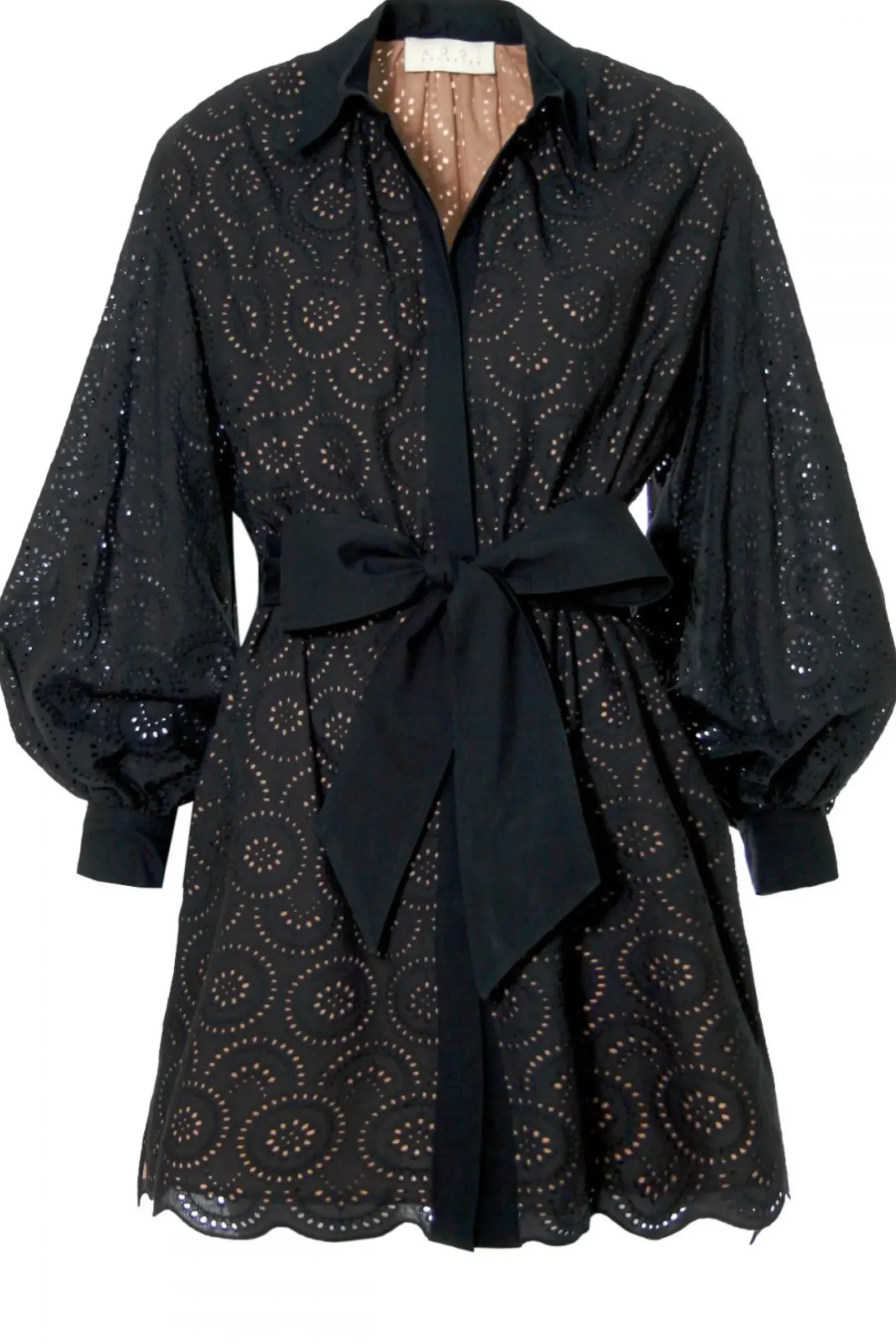 Sukienka O Kroju Luznej Koszuli Uszyta Z Haftowanej Bawelny. Dlugie, Przeswitujace Rekawy O Objetosci Xxl Bogato Marszczone Przy Mankietach. Maly, Ostro Zakonczony Kolnierzyk, Talia Przewiazywana Szerokim Paskiem Typu Szarfa, W Szwach Bocznych Ukryte Kieszenie.