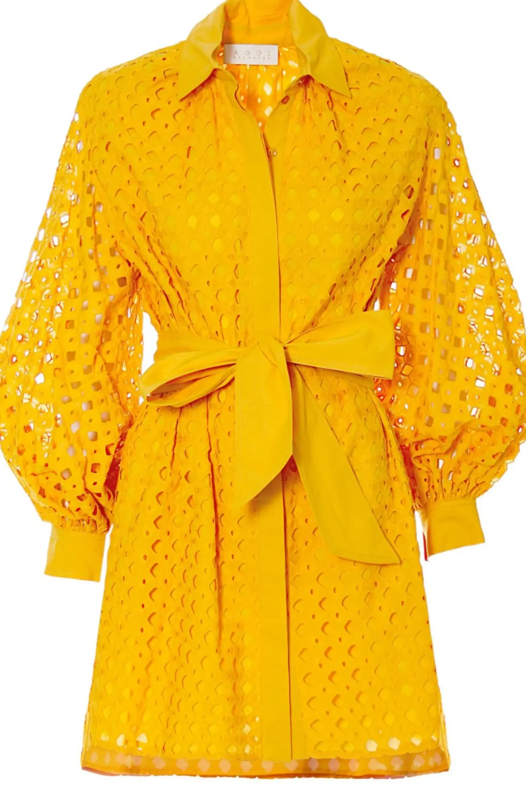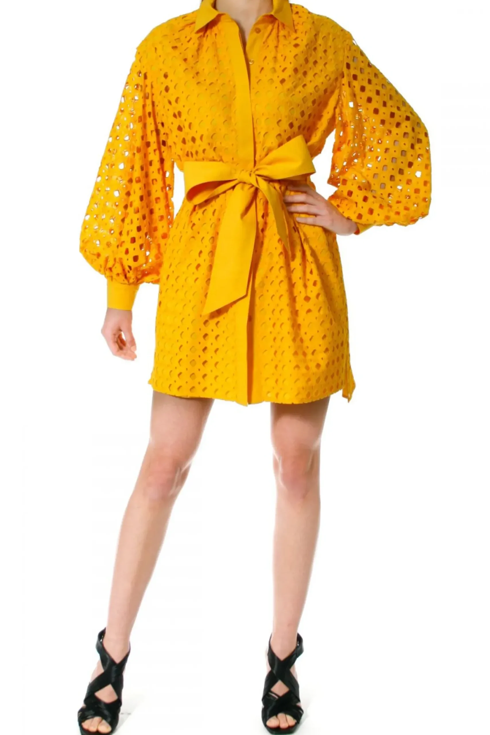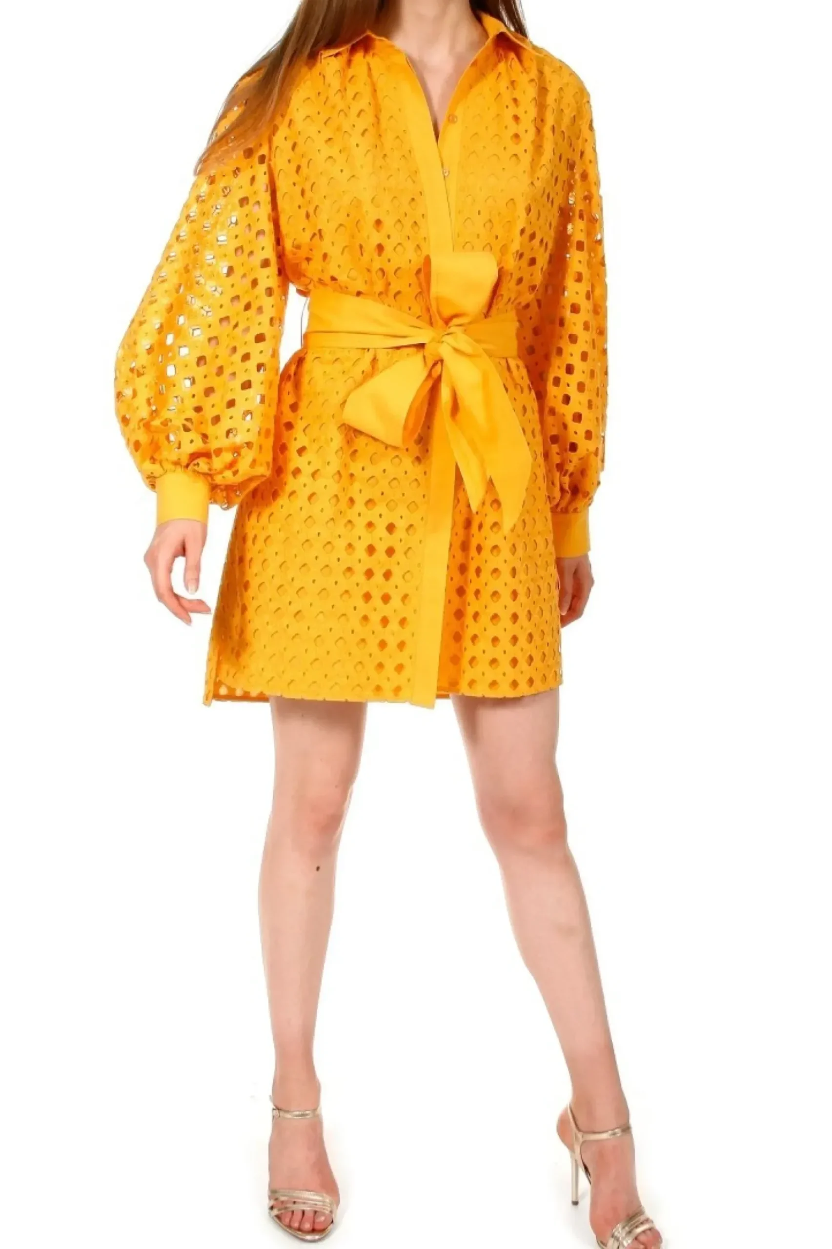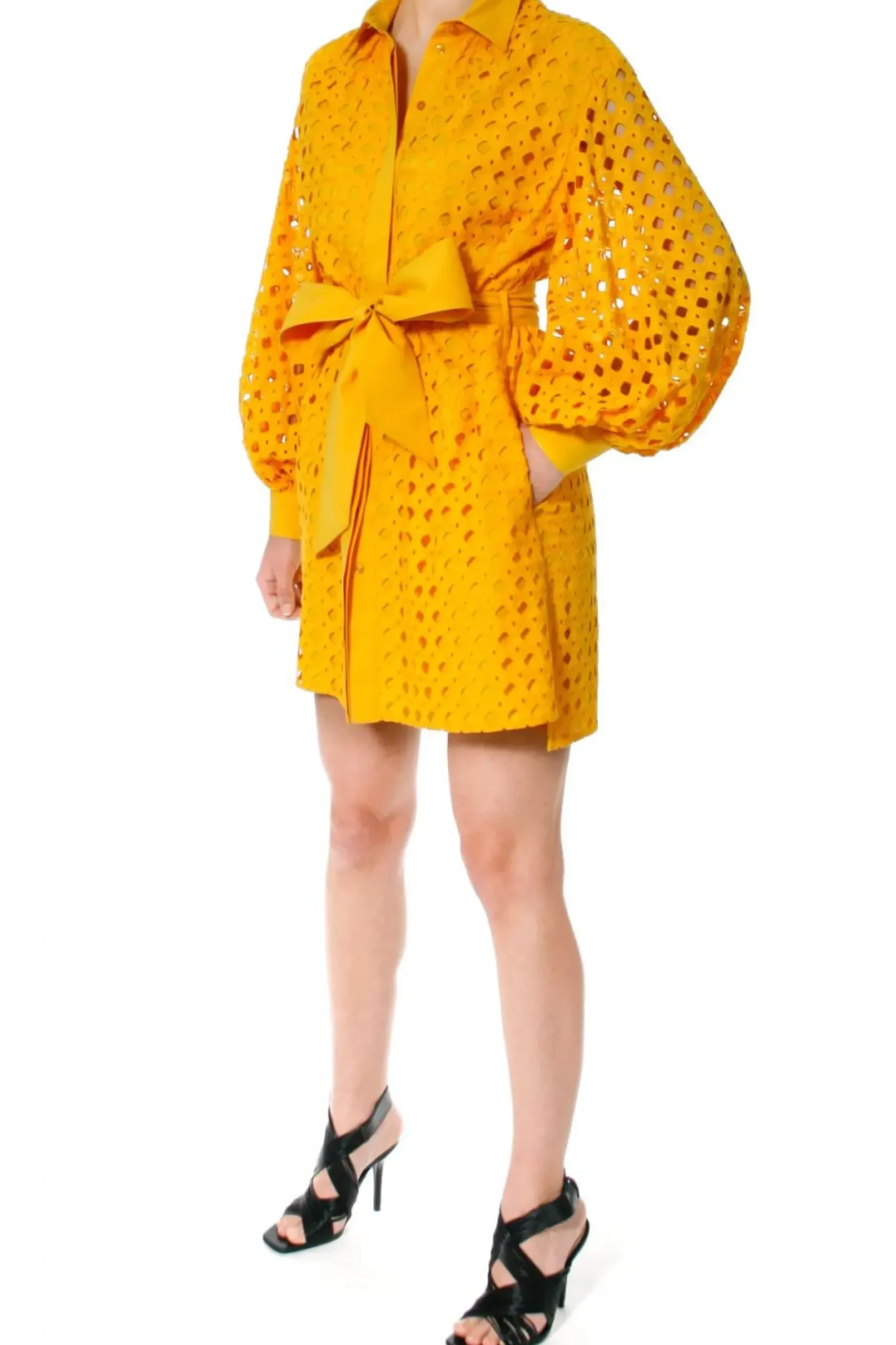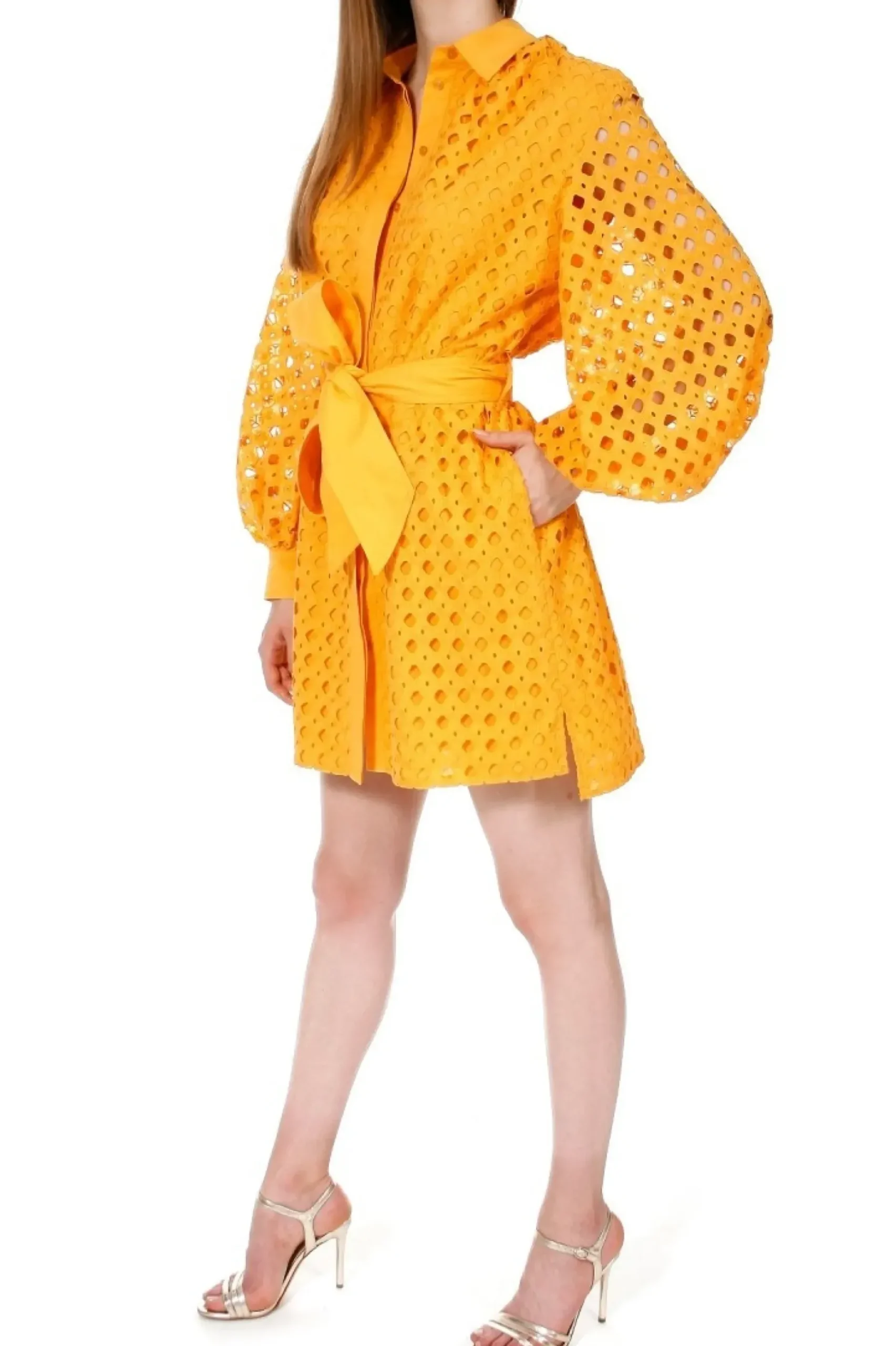 Sukienka O Kroju Luznej Koszuli Uszyta Z Haftowanej Bawelny. Dlugie, Przeswitujace Rekawy O Objetosci Xxl Bogato Marszczone Przy Mankietach. Maly, Ostro Zakonczony Kolnierzyk, Talia Przewiazywana Szerokim Paskiem Typu Szarfa, W Szwach Bocznych Ukryte Kieszenie.