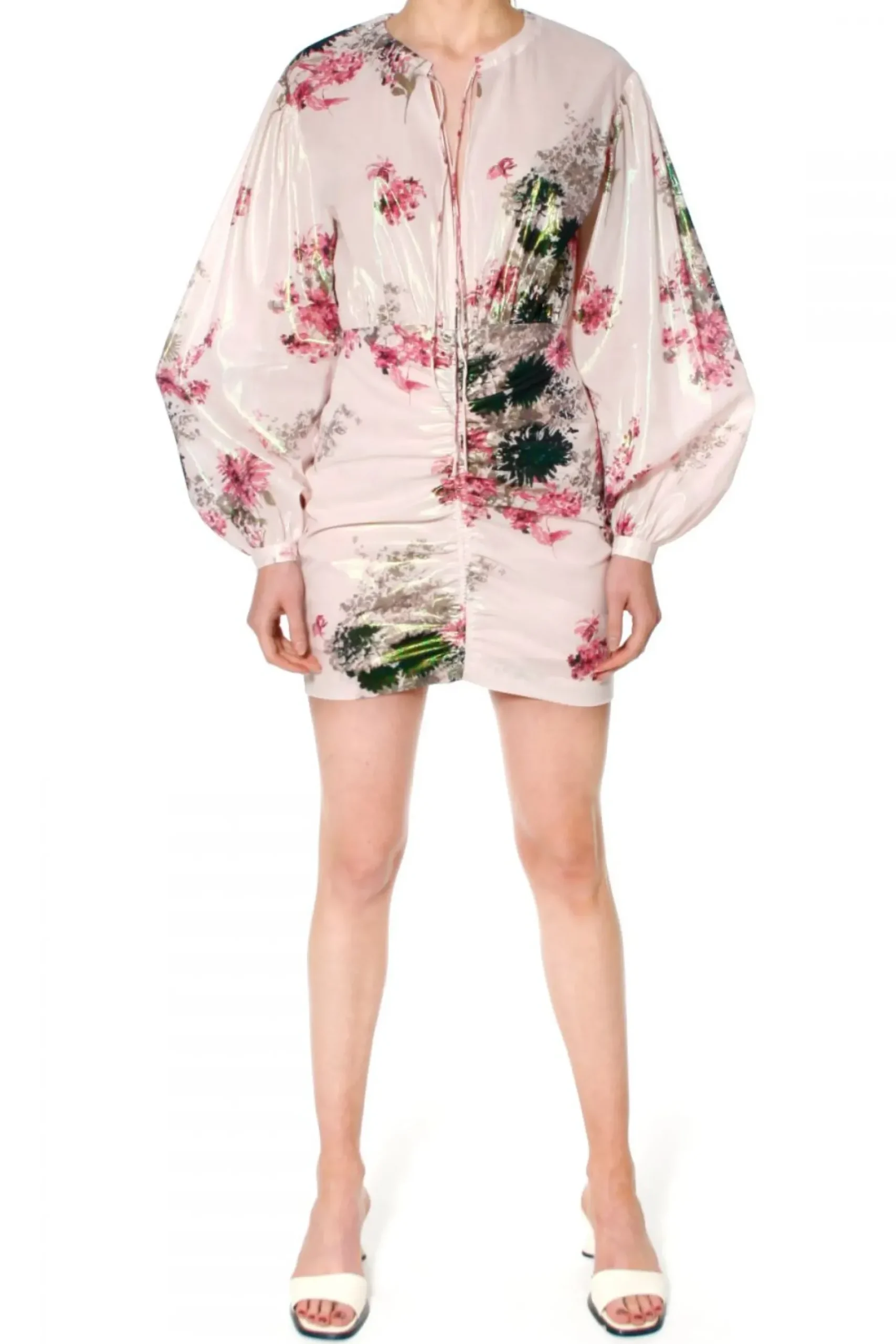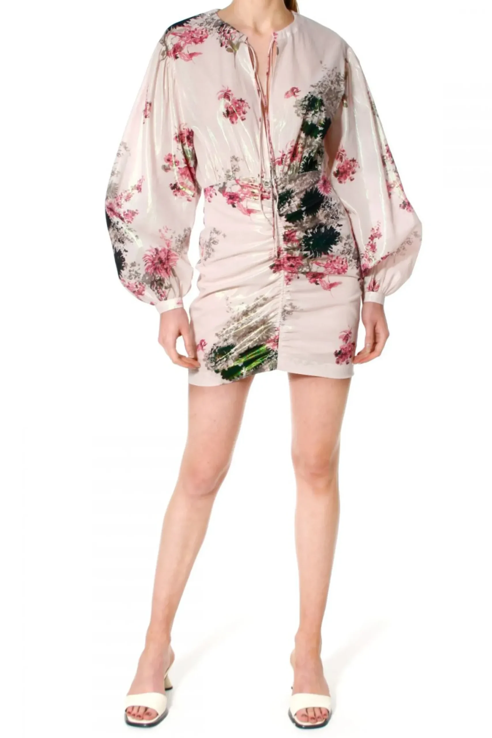 Sukienka Wykonana Z Delikatnego Batystu Z Dodatkiem Miekkiej Nici Metalicznej, Ktora Gesto Wpleciona Subtelnie Odbija Swiatlo I Nadaje Tkaninie Szlachetnego Perlowego Polysku. Okragly Dekolt Wiazany Na Dwa Regulowane Troczki-Makaroniki Pozwala Na Noszenie Na Dwa Sposoby – Wysoko Zawiazany Pod Szyja Lub Swobodnie, Pozwalajac Na Delikatne I Zmyslowe Rozchylanie Sie Waskiego Pekniecia Siegajacego Do Pasa. Obnizona Linia Ramion Z Przeskalowanymi, Obszernymi Rekawami Zebranymi W Waski Mankiet Przy Nadgarstku Co Tworzy Efektowna, Balonowa „Nadmuchana” Przestrzen. Lekko Luzniejsza Gora Sukienki Przymarszczona I Zebrana W Talii. Dol Sukienki O Dlugosci Mini Drapowany Z Przodu I Z Tylu Wspaniale Podkreslajacy Kobieca Linie Bioder I Posladki. Z Boku Zapinana Na Kryty Zamek Blyskawiczny, W Dolnej Czesci Na Podszewce.