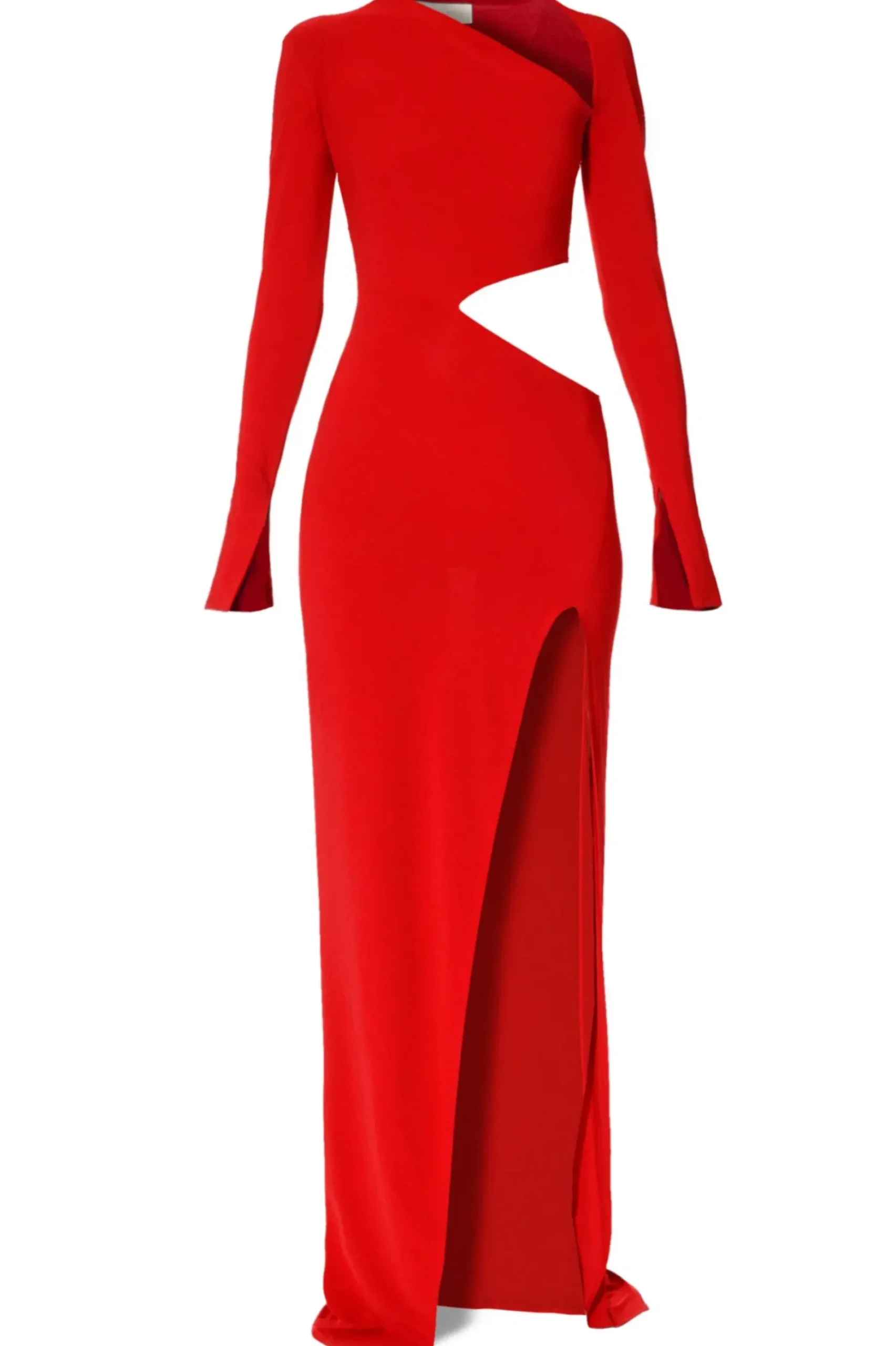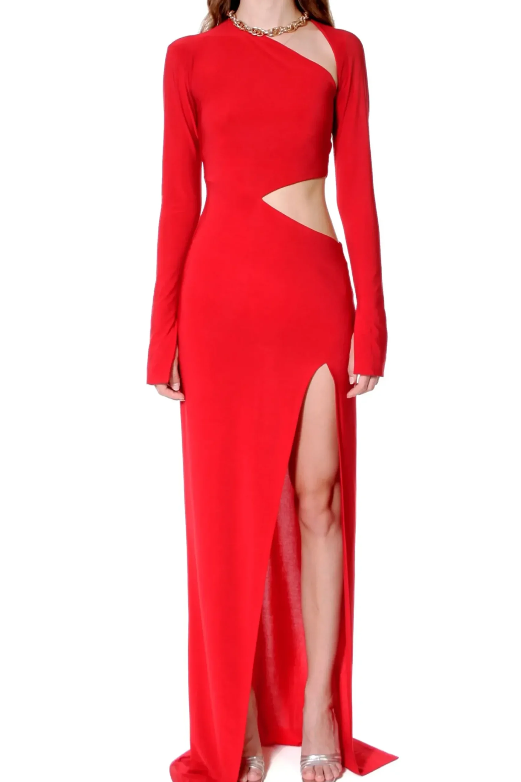 Suknia Maxi Z Asymetrycznym Dekoltem I Zmyslowym Wycieciem Odslaniajacym Talie. Uszyta Z Delikatnego, Lejacego I Jedwabistego W Dotyku Materialu Z Dodatkiem Elastanu W Kolorze Nasyconej Czerwieni. Wysokie Rozciecie Na Lewym Udzie. Bardzo Dlugie Rekawy Z Peknieciami.