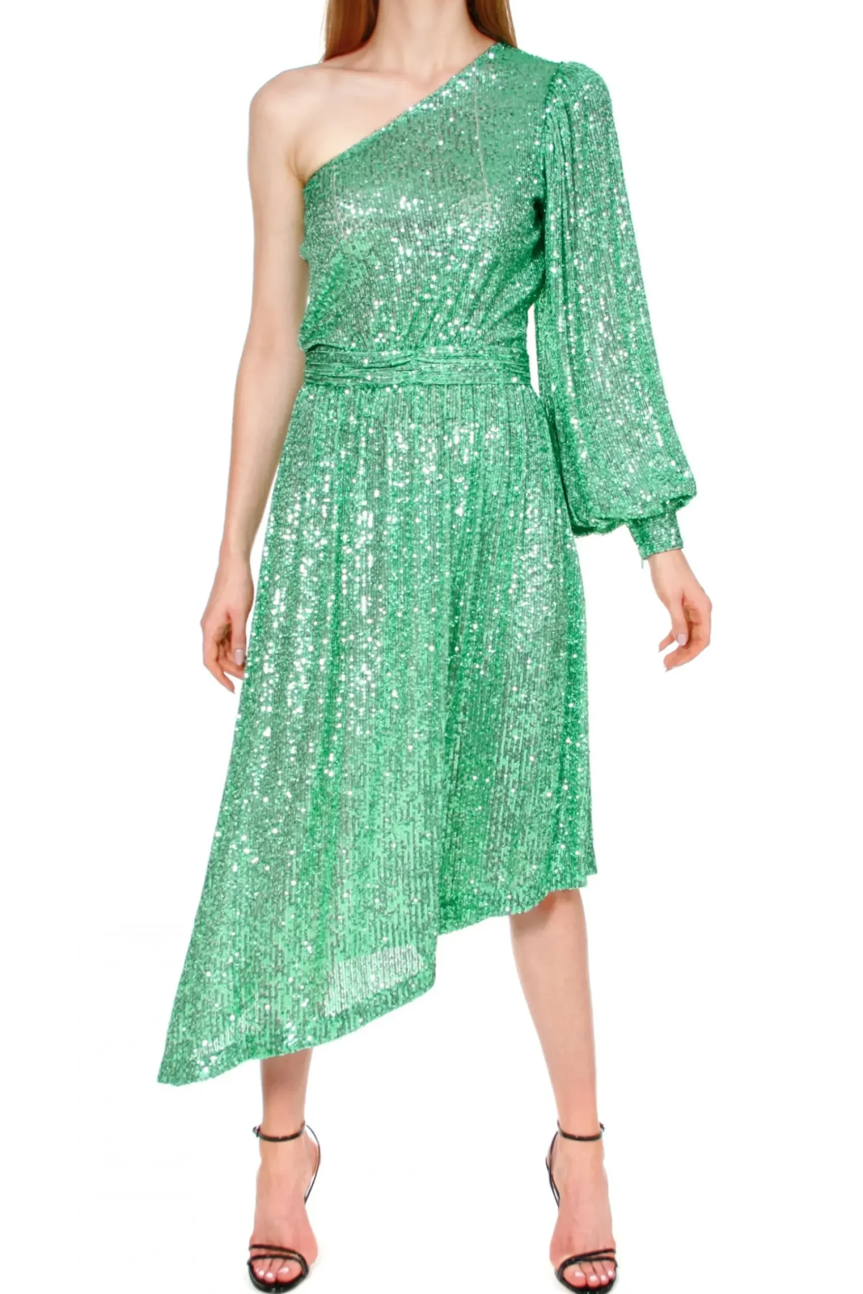 Koktajlowo-Wieczorowa Sukienka Midi Wyszywana Drobnymi, Polyskujacymi Cekinami. Projekt Z Mocno Zaakcentowana Asymetria – Dlugi, Obfity Rekaw Z Bufka I Dla Przeciwwagi Odsloniete Ramie. Talia Podkreslona Wszytym Drapowanym Paskiem. Trapezowy, Asymetryczny, Lekko Marszczony W Talii Dol Sukienki Oscylujacy W Granicach Dlugosci Midi Doskonale Dopelnia Proporcji Sylwetki I Wysmukla Ja. Zapinana Z Boku Na Zamek Blyskawiczny.