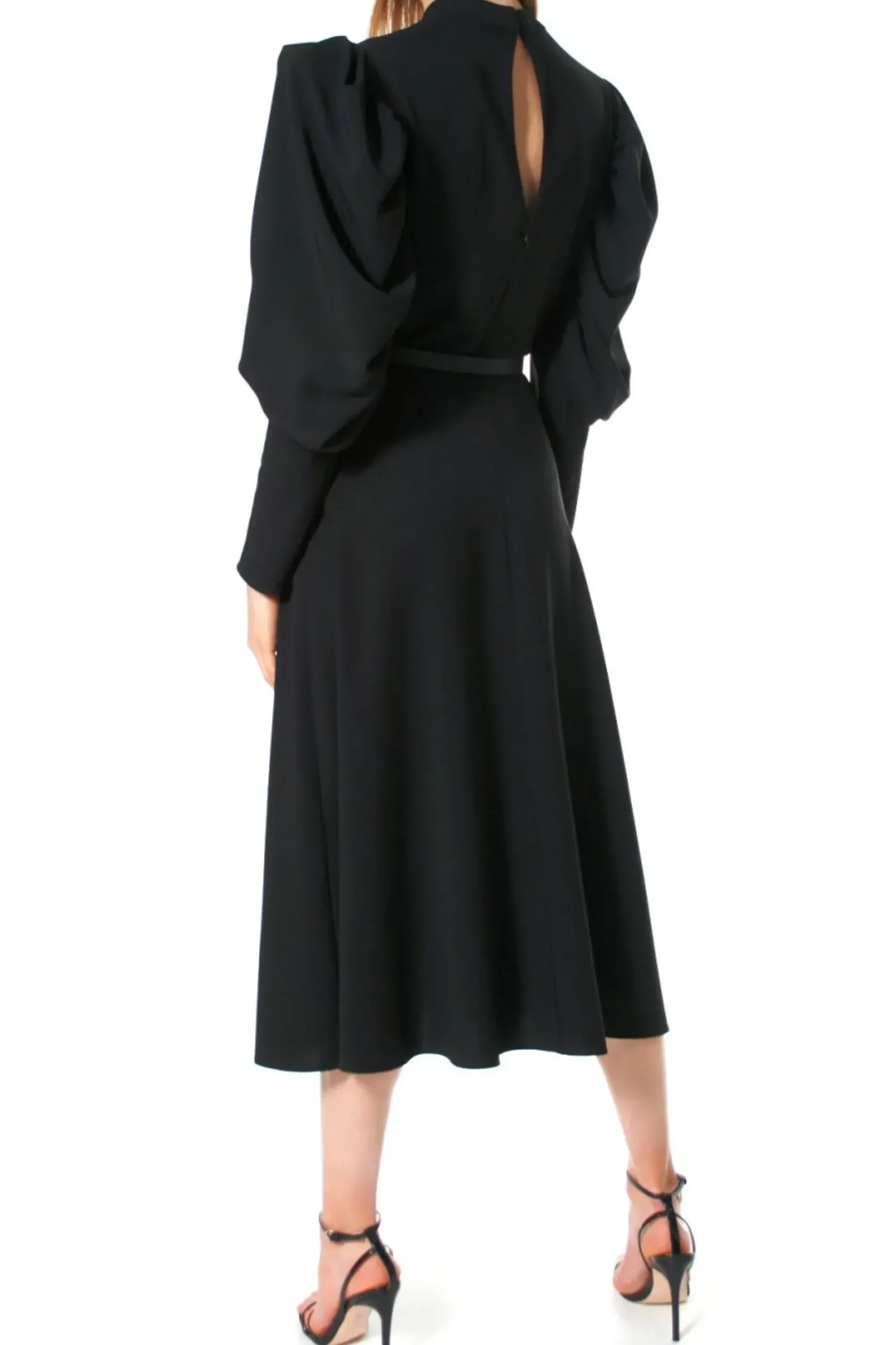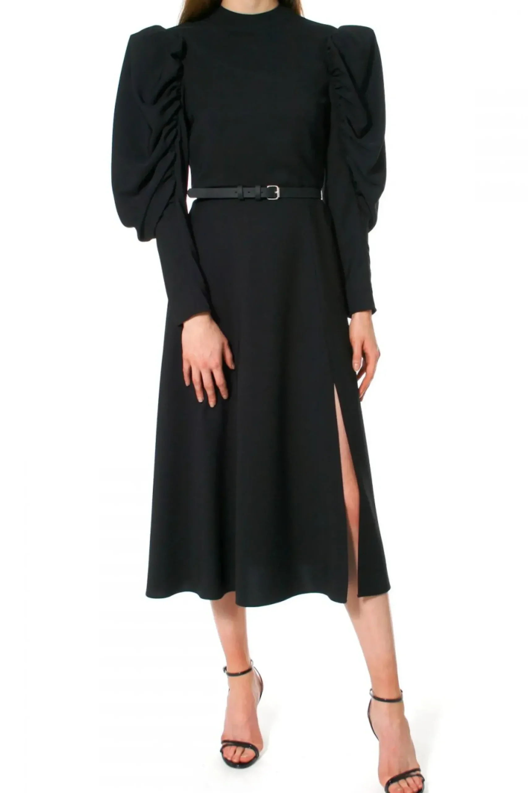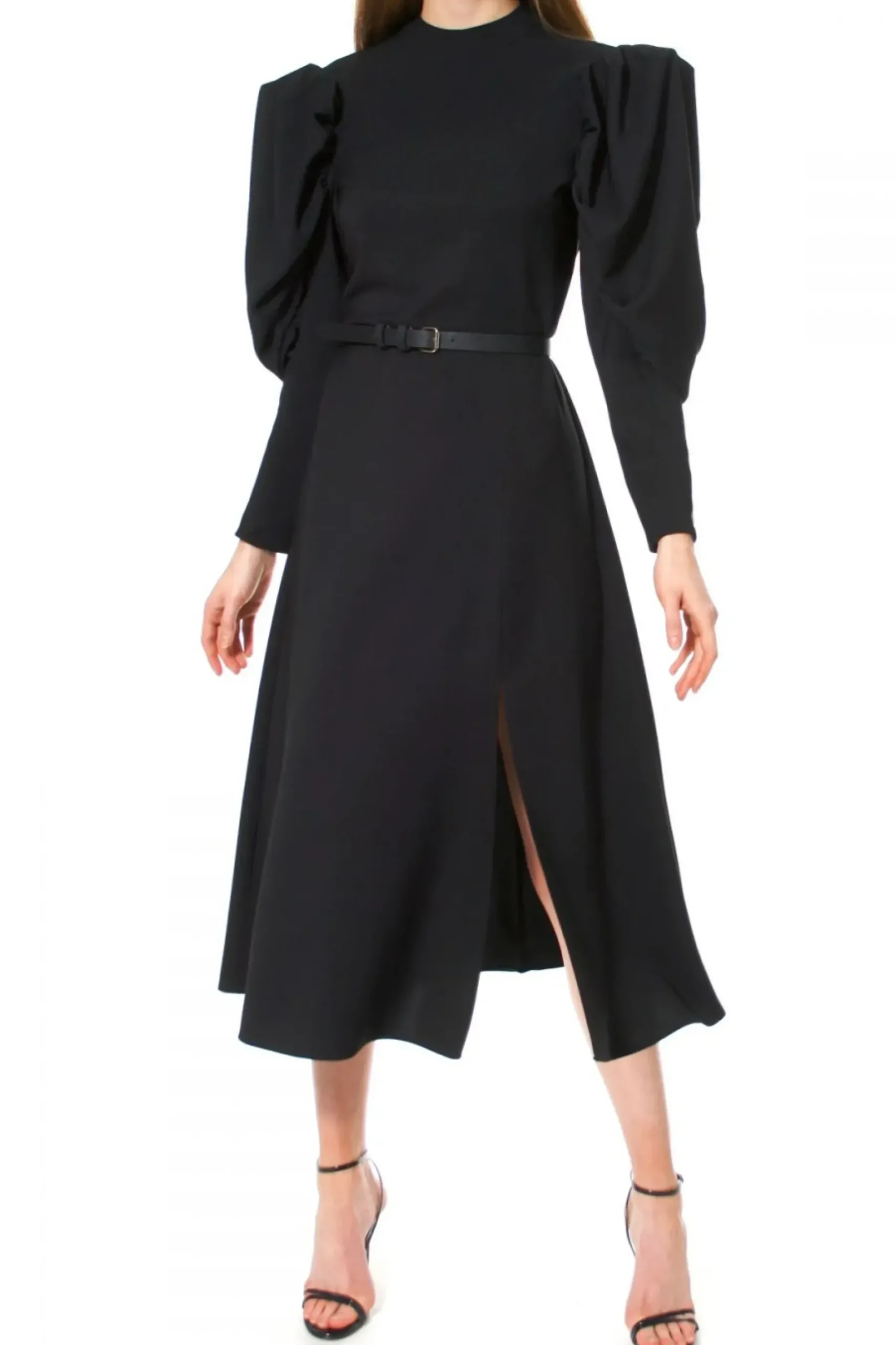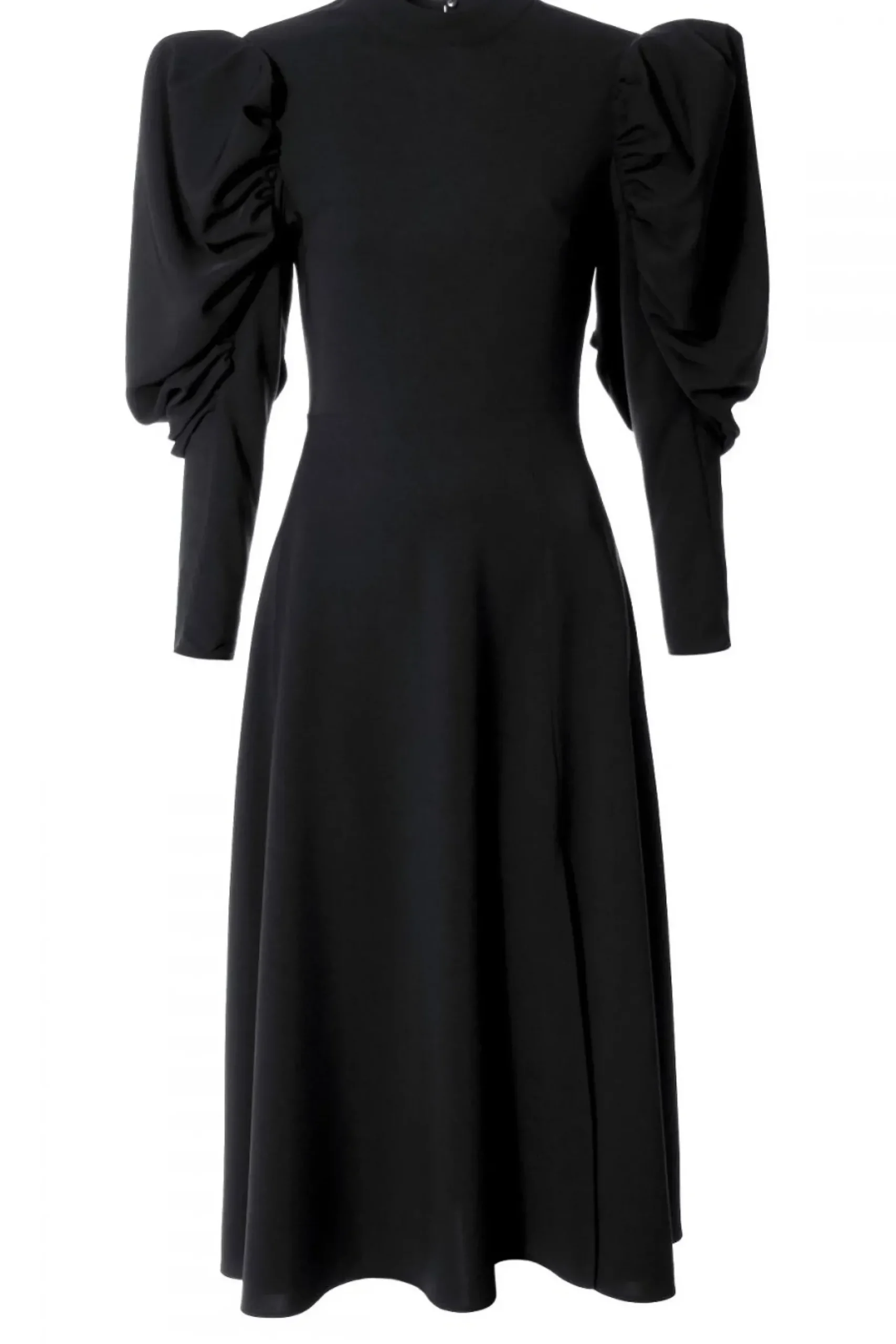Sukienka Midi Uszyta Z Miesistej, Miekko Ukladajacej Sie Tkaniny O Sredniej Grubosci Z Dodatkiem Elastanu. Dekolt Ze Stojka. Obfite, Bufiaste Rekawy Z Wszytym Skrzydelkiem. Dol Sukienki Z Klinow, Rozszerzany Z Rozcieciem Na Lewej Nodze. Sukienka Idealna Na Codzien, Do Pracy A Takze Na Impreze I Przyjecie. Sukienka Z Bufkami.
