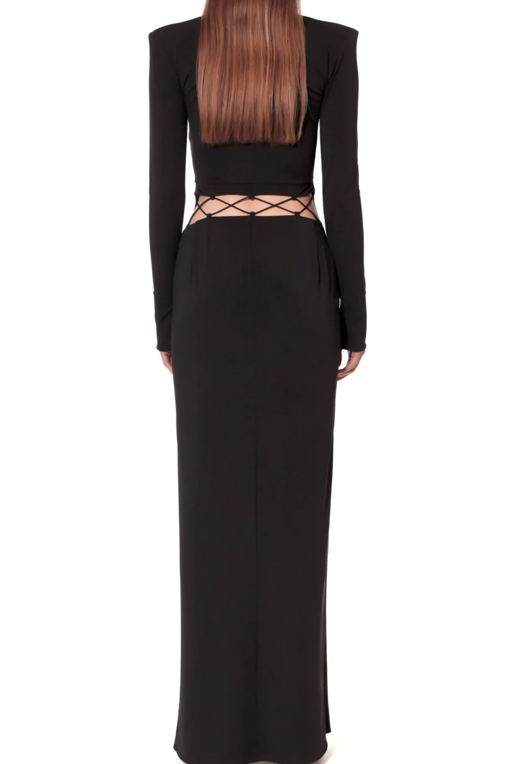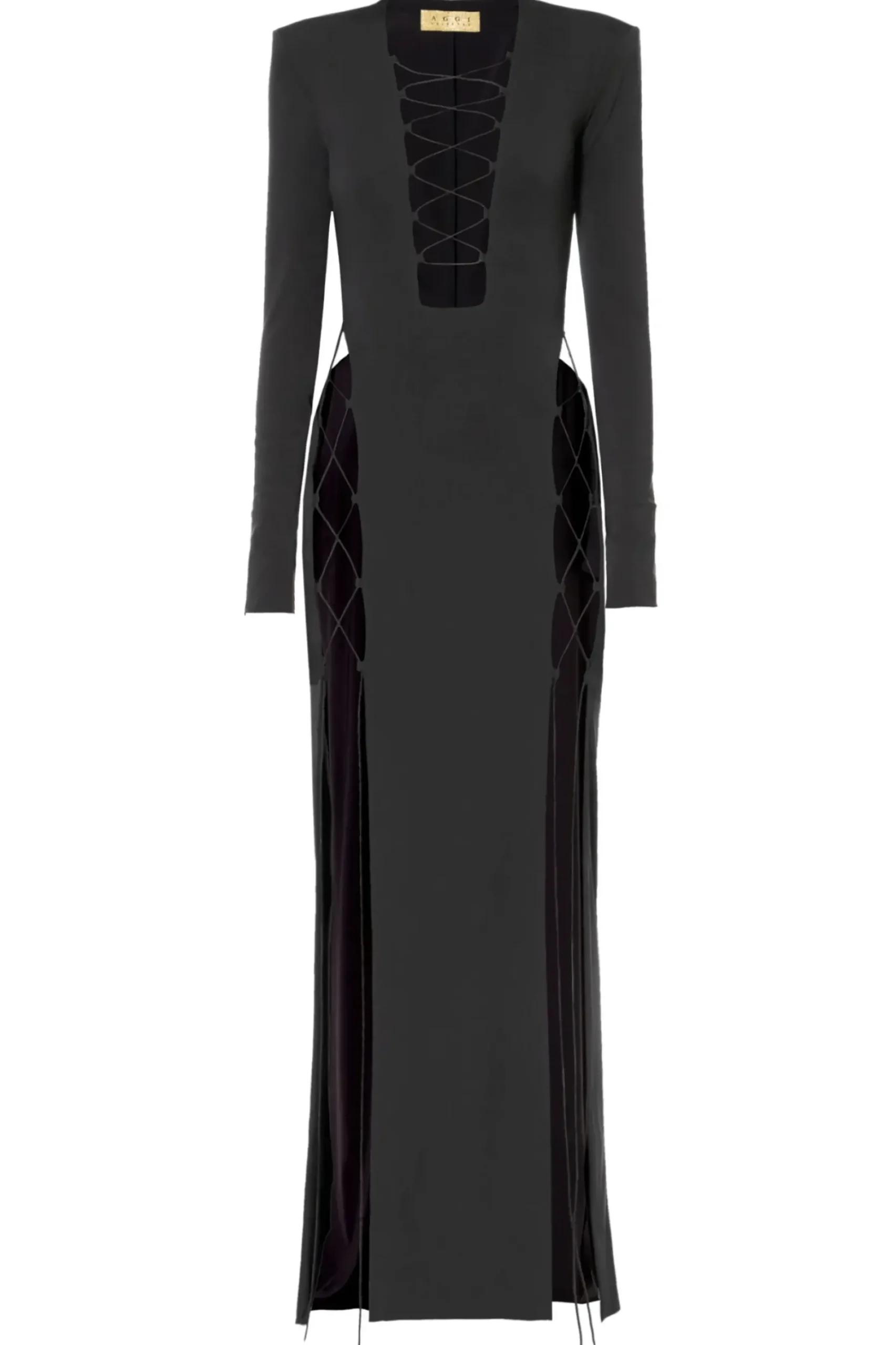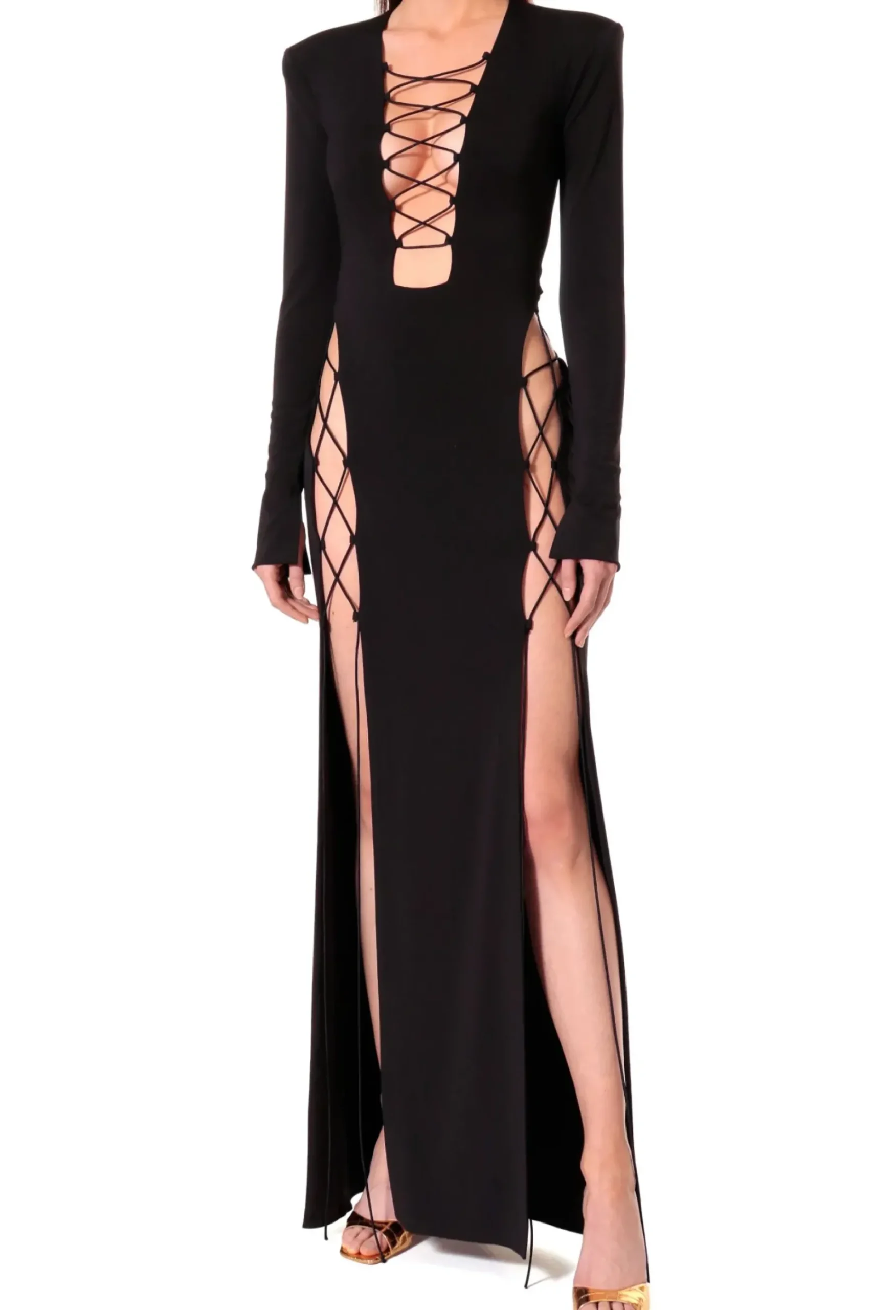 Suknia Maxi Xena Black Of Night Ze Zmyslowymi Sznurowanymi Wycieciami Na Udach I Wokol Bioder.Gleboki, Geometrycznie Zarysowany Dekolt. Zdecydowana Linia Ramion Podkreslona Malymi Poduszkami.