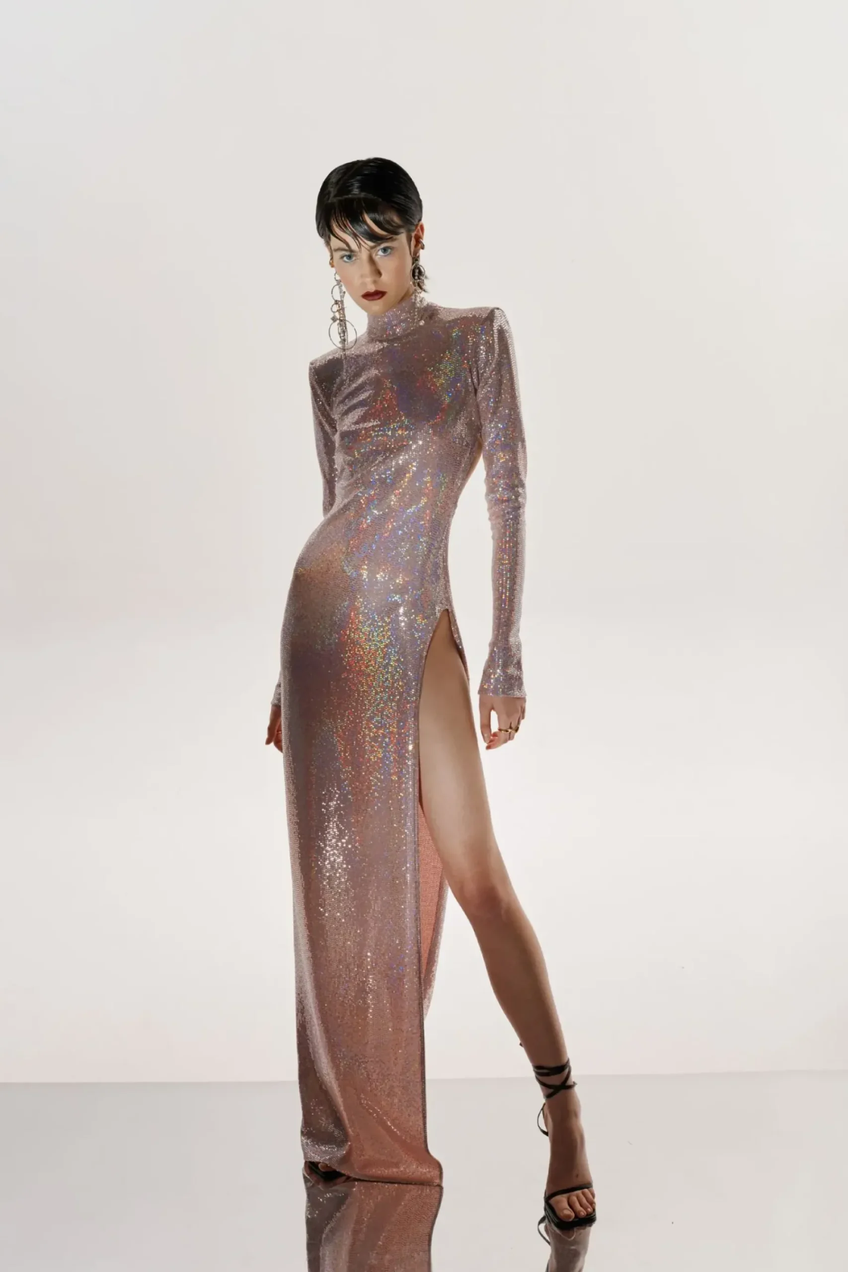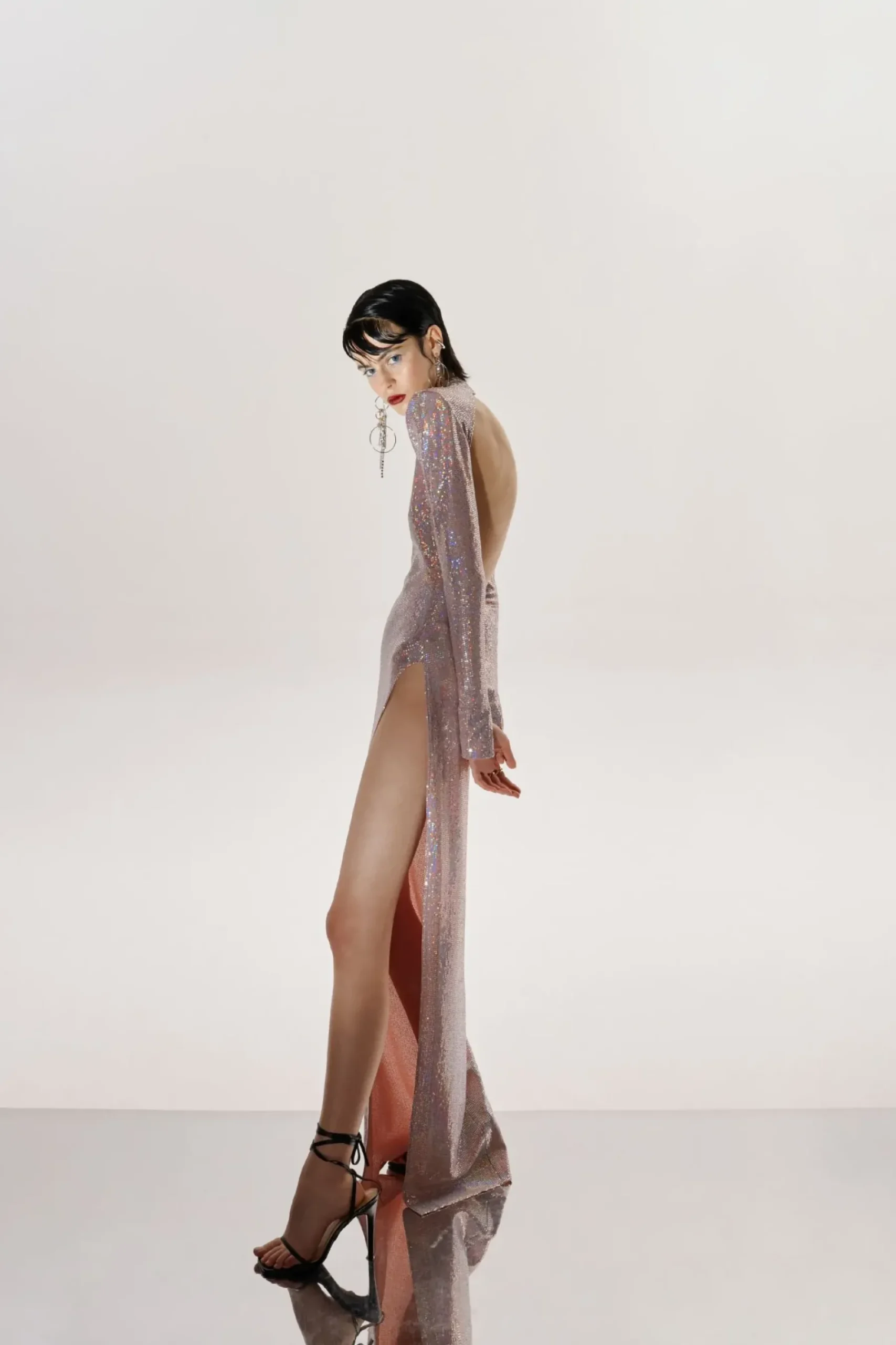 Spektakularna Suknia Maxi Z Elastycznego Materialu Z Metaliczna Nicia Pokrytego Polyskujacymi Pajetkami. Wysoko Zabudowany Dekolt Oraz Bardzo Dlugie Rekawy Z Peknieciami Pozostaja W Skrajnym Kontrascie Z Mocnym Wycieciem Na Lewym Udzie I Szalenczo Zmyslowo Odkrytymi Plecami. Linia Ramion Zaakcentowana Poduszkami, Polgolfik Zapinany Na Srebrne Zatrzaski Na Karku. Nasz Oszalamiajacy Zmysly Projekt Skomponuj Z Minimalistycznymi Sandalkami Lub Klapkami Na Szpilce.