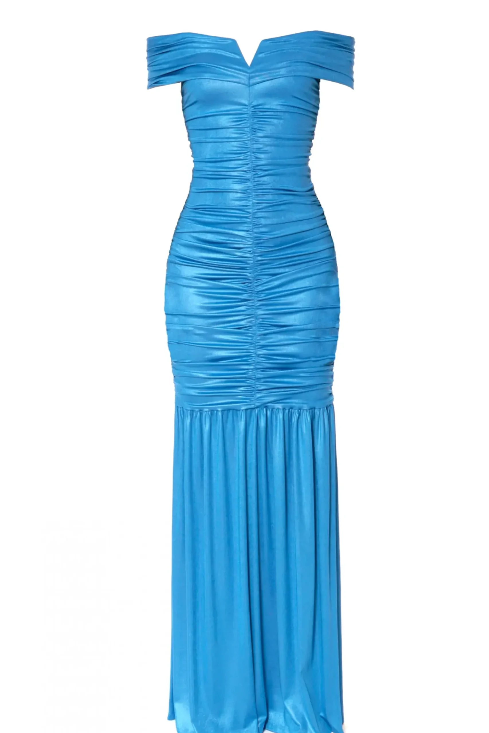 Sukienka Maxi Uszyta Z Elastycznego Materialu O Jedwabistym Chwycie I Subtelnym Perlowym Polysku. Mocno Odsloniety Dekolt Wraz Z Ramionami, Drapowania Otulajace Talie Wraz Z Obficie Marszczona Falbana Idealnie Podkreslaja Kobiece Ksztalty.