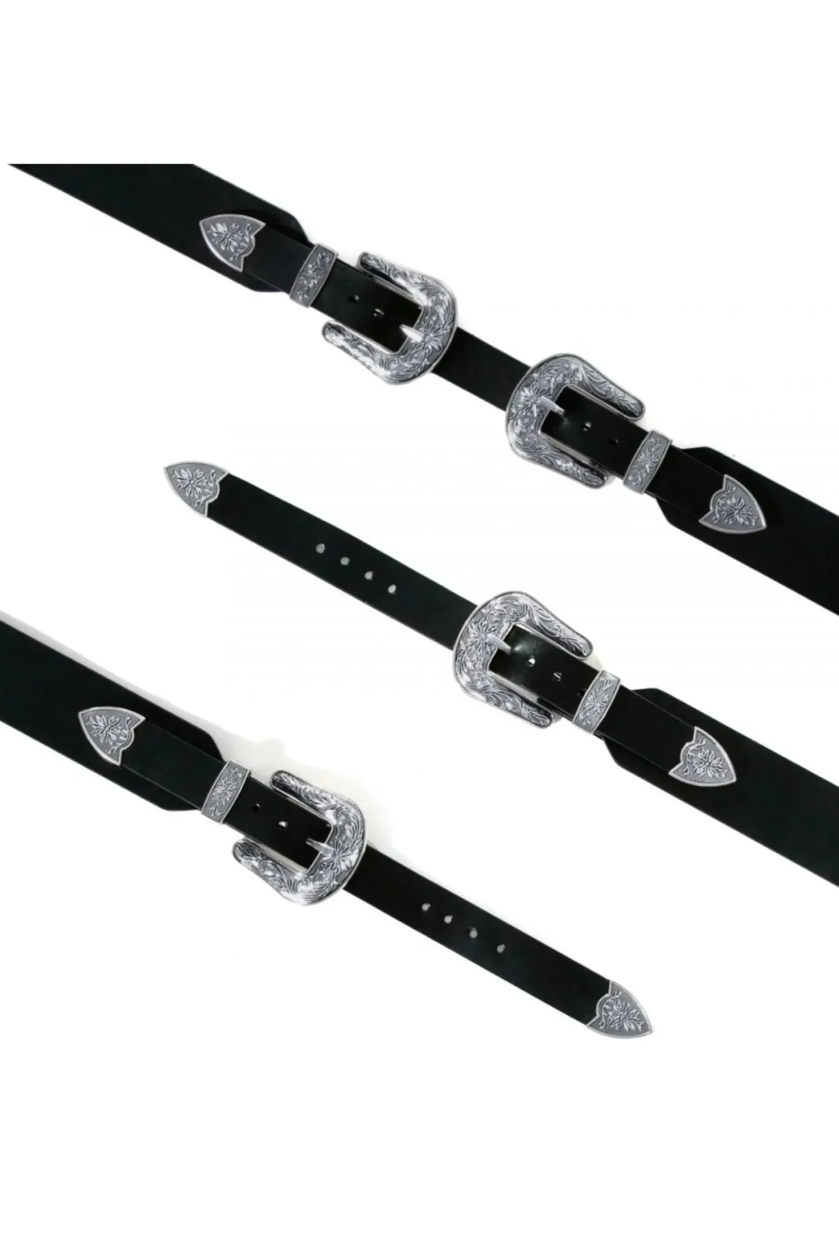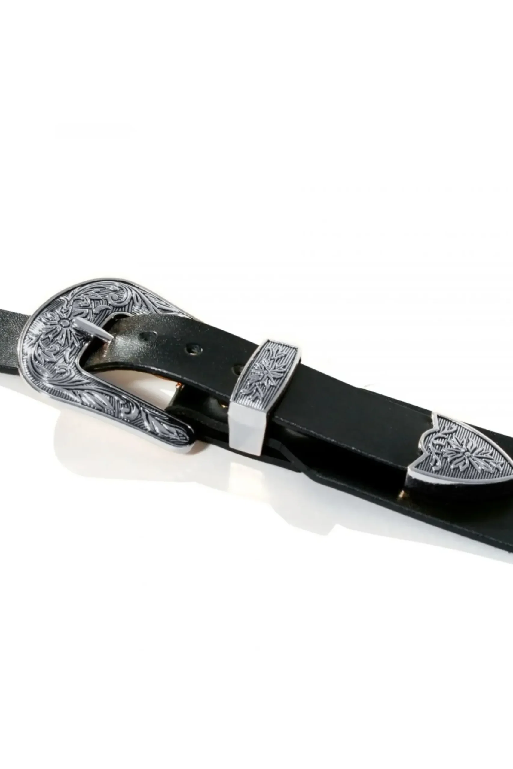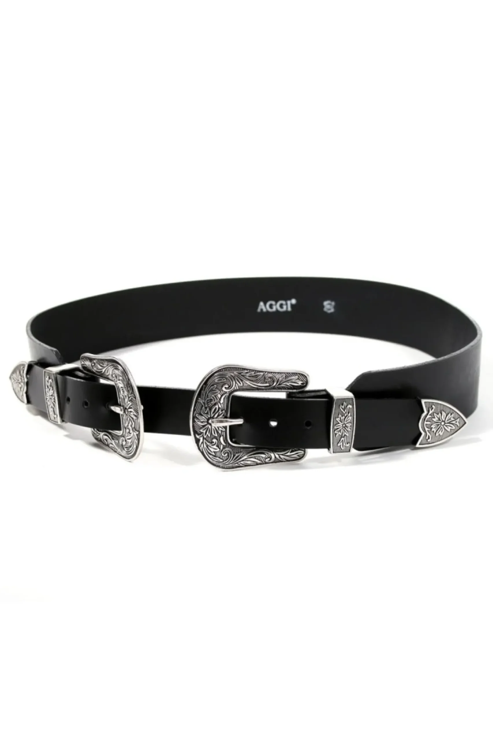 Kobieta AGGI Akcesoria Paski>Pasek Skorzany Dwie Klamerki Ornament Czarno-Srebrny