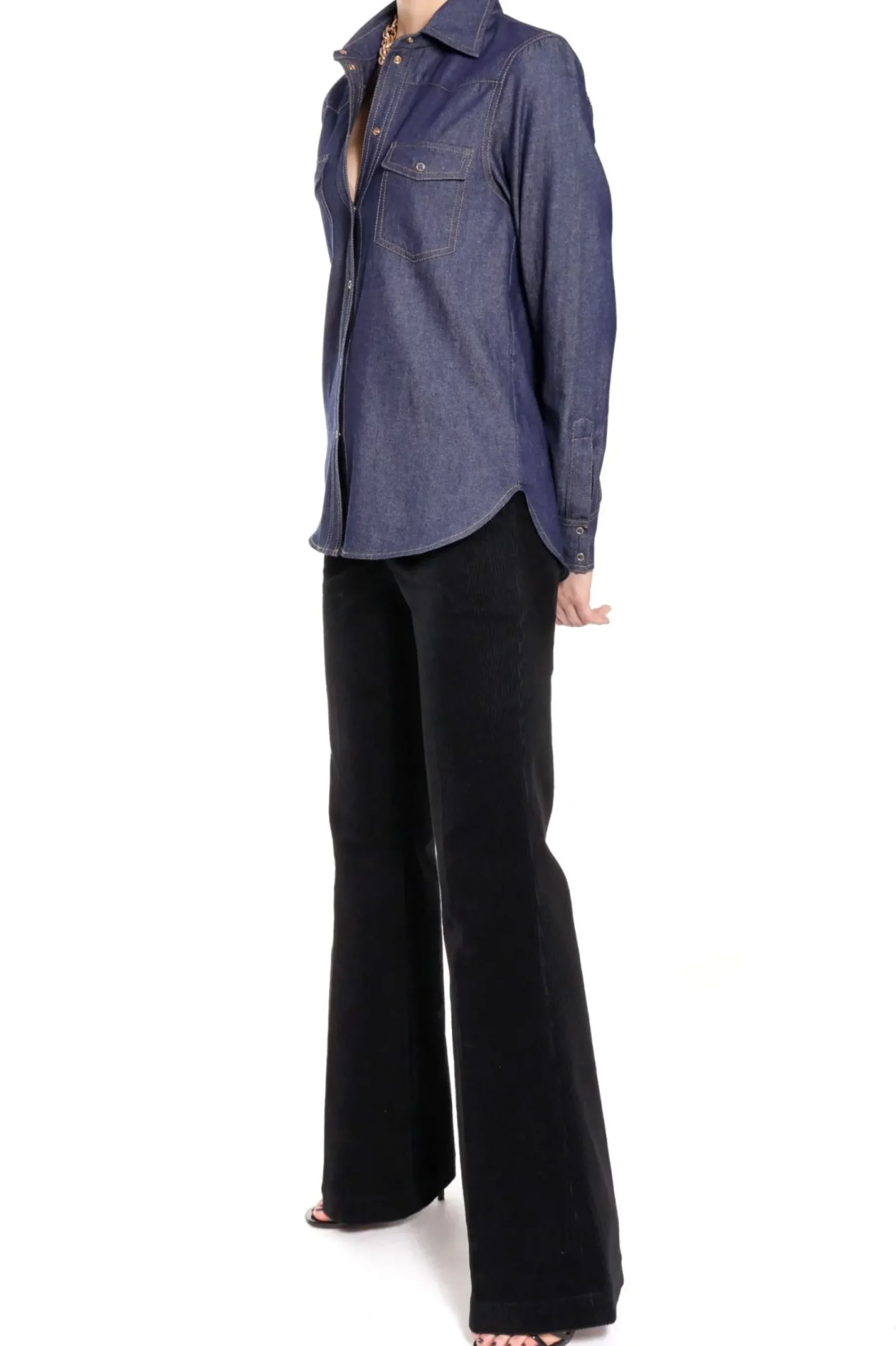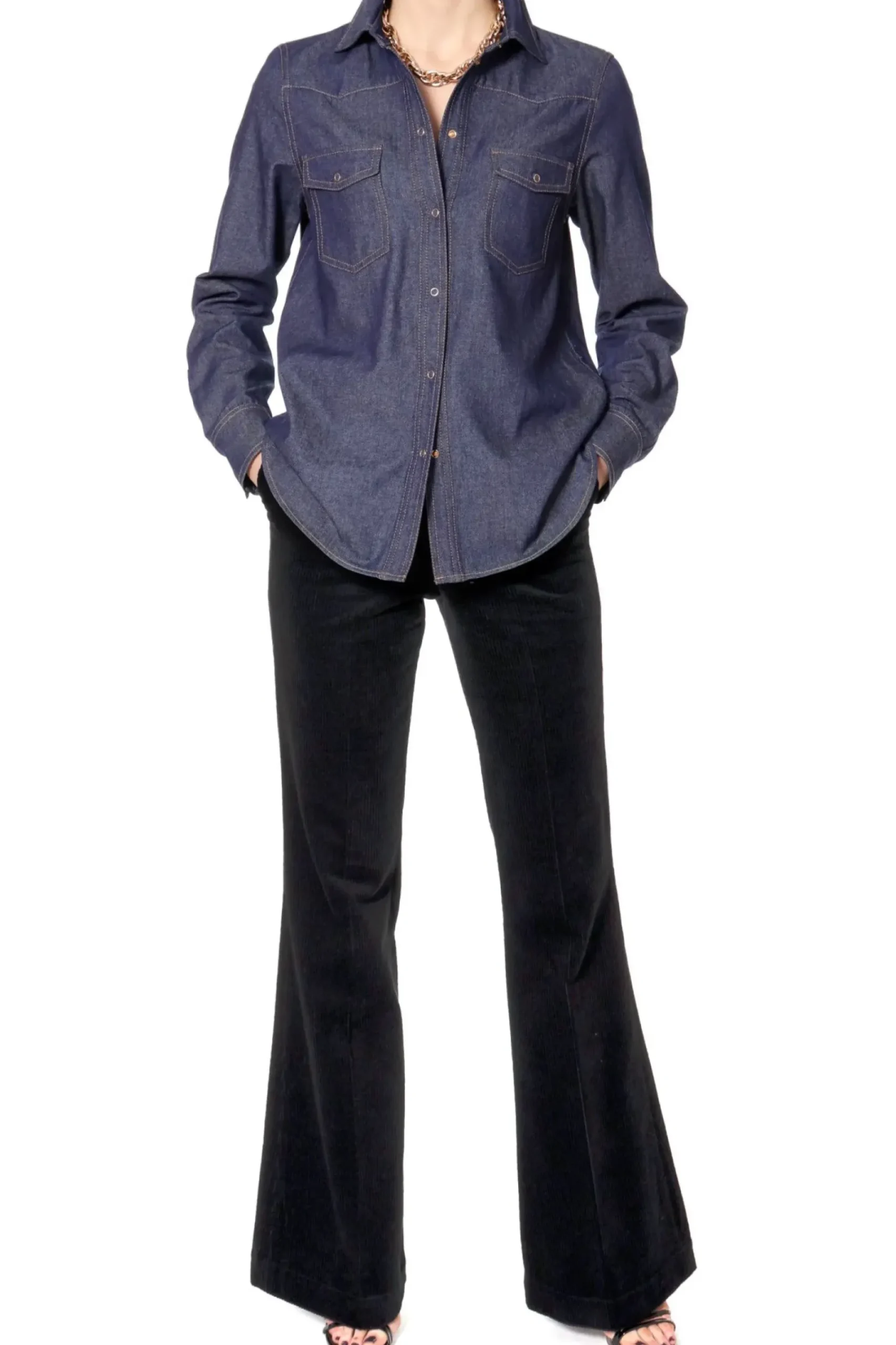 Bawelniana Koszula Jeansowa W Klasycznym, Eleganckim Odcieniu Granatu. Dekoracyjne Szwy Kontrastujace Z Ciemna Tkanina I Drobne Metalowe Napy W Kolorze Zlotym Nadaja Surowej Dzinsowej Koszuli Efektowny Wyglad. Koszula Wykonana Z Miekkiego Dzinsu O Sredniej Grubosci.
