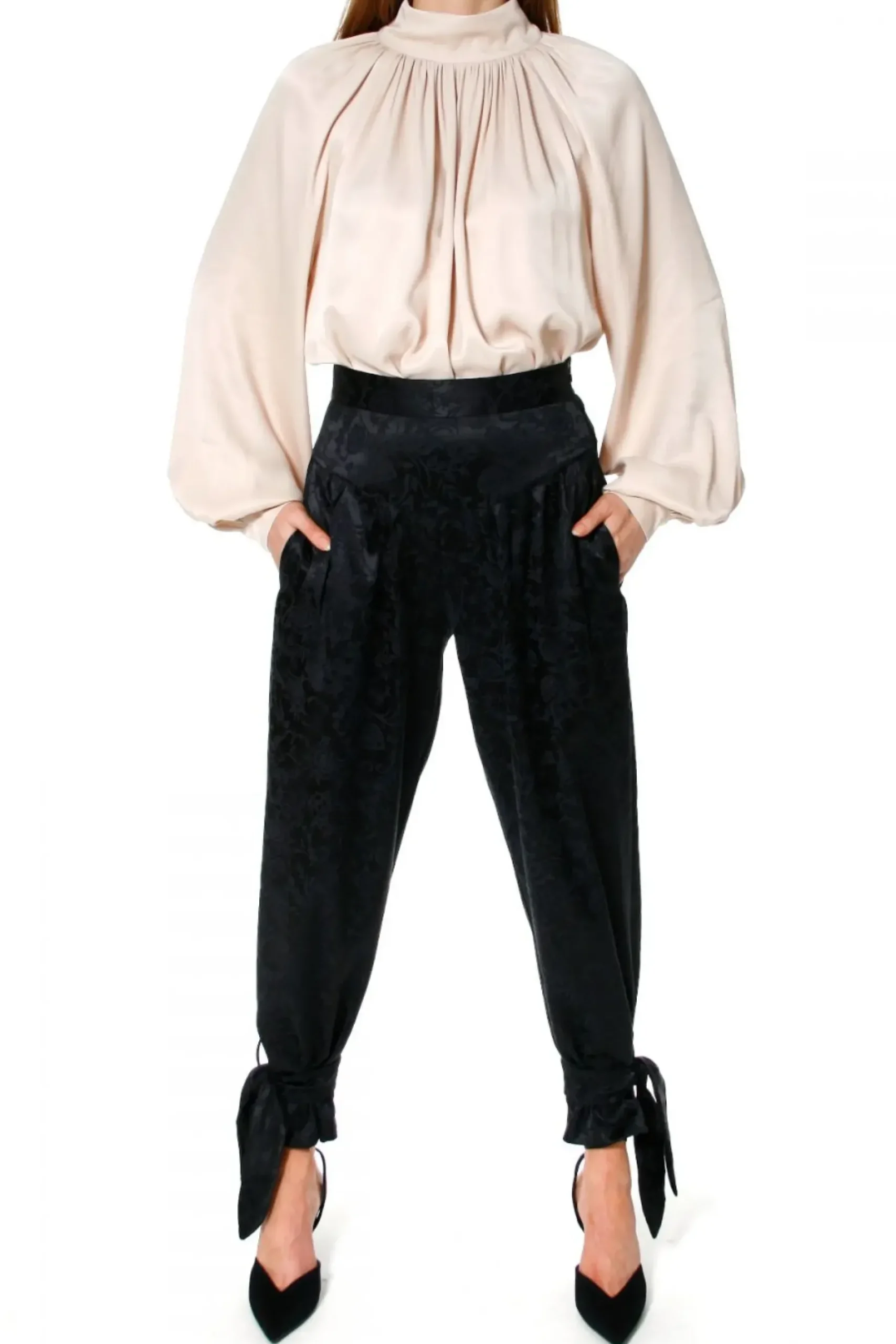 Bogate Marszczenia Wokol Dekoltu I Mankietow. Raglanowy Rekaw. Stojka I Mankiety Zapinane Na Kryte Zatrzaski W Zlotym Kolorze.