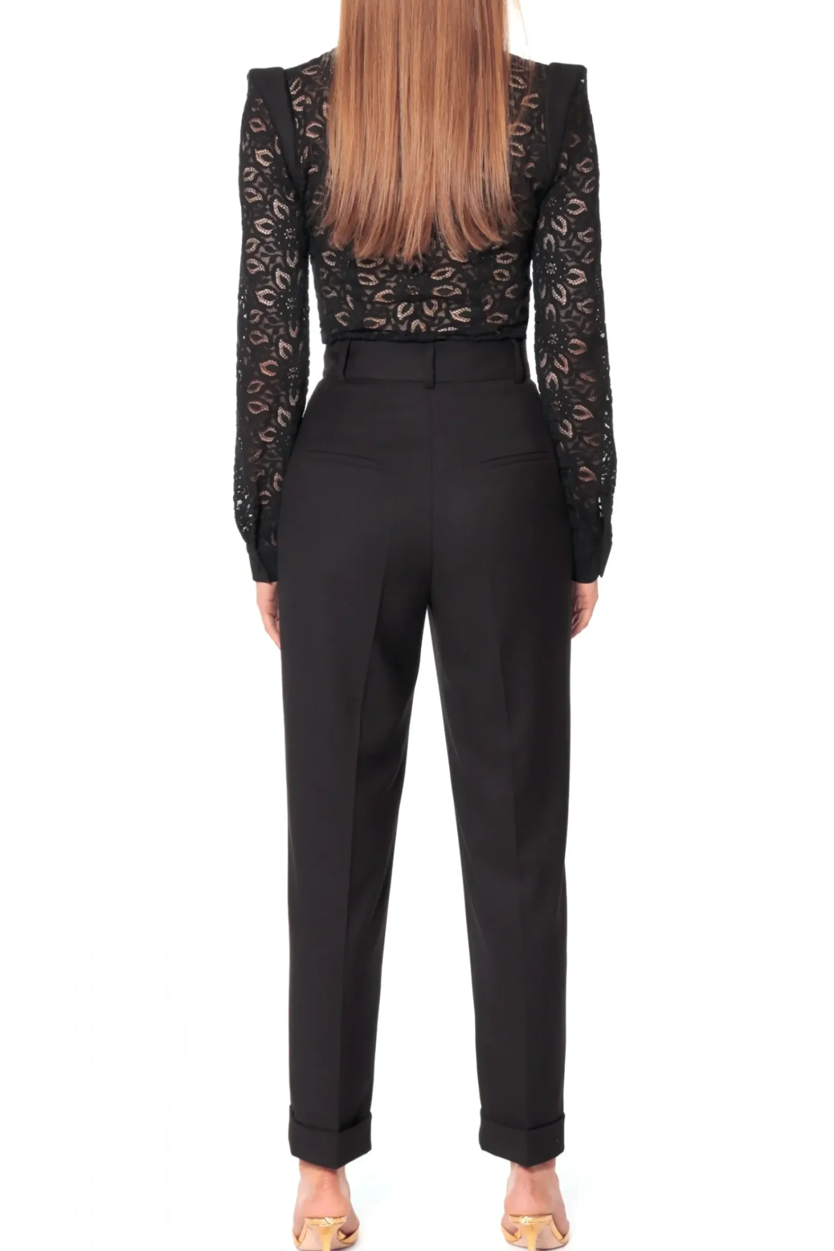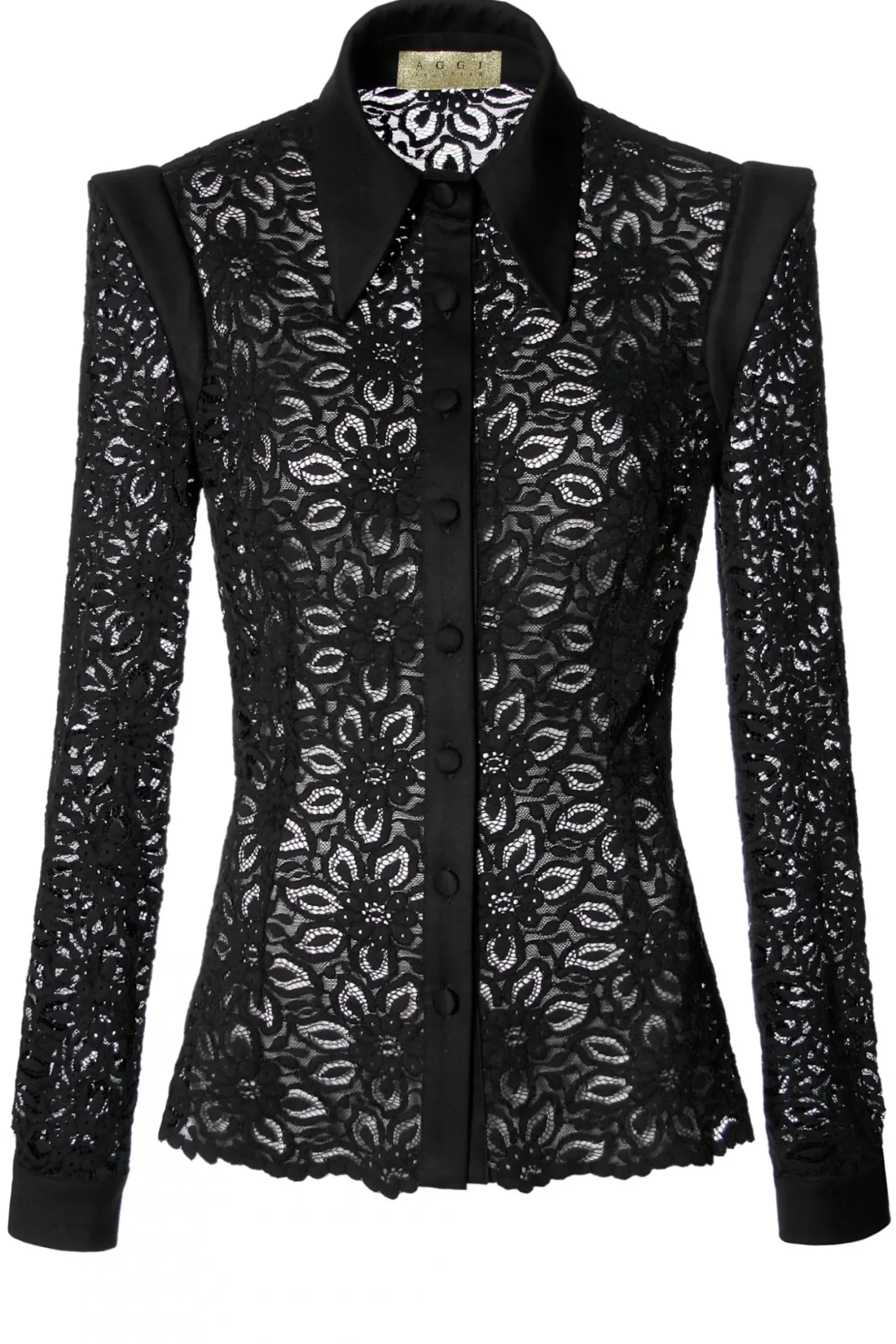 Bluzka Z Dlugimi Rekawami Wykonana Z Czarnej Koronki W Kwiaty. Kanciaste Ramiona, Szpiczasty Kolnierzyk Na Stojce I Detale Wykonane Z Gladkiej Tkaniny Wraz Z Oblekanymi Guzikami Tworza Calosc Projektu.