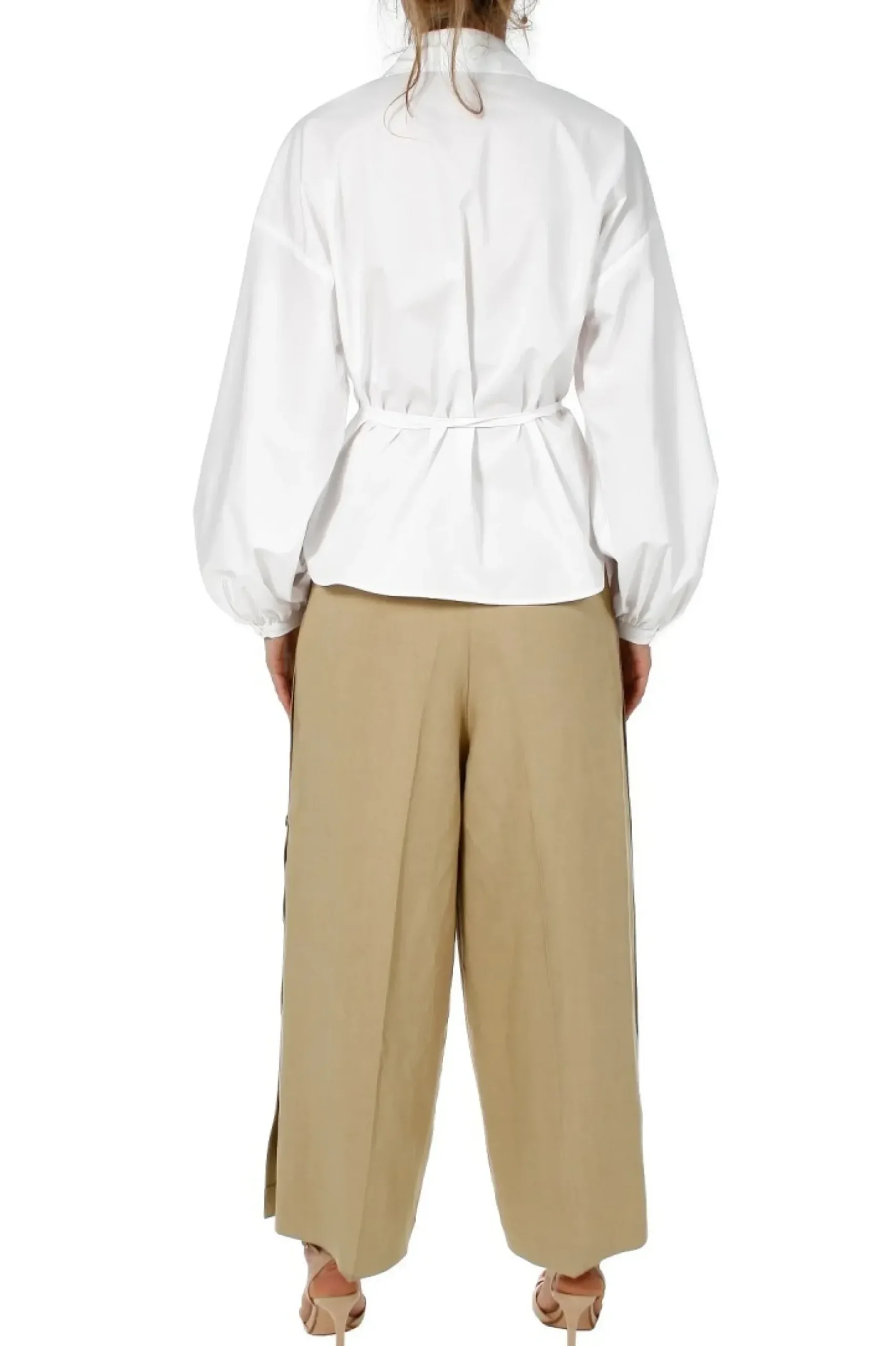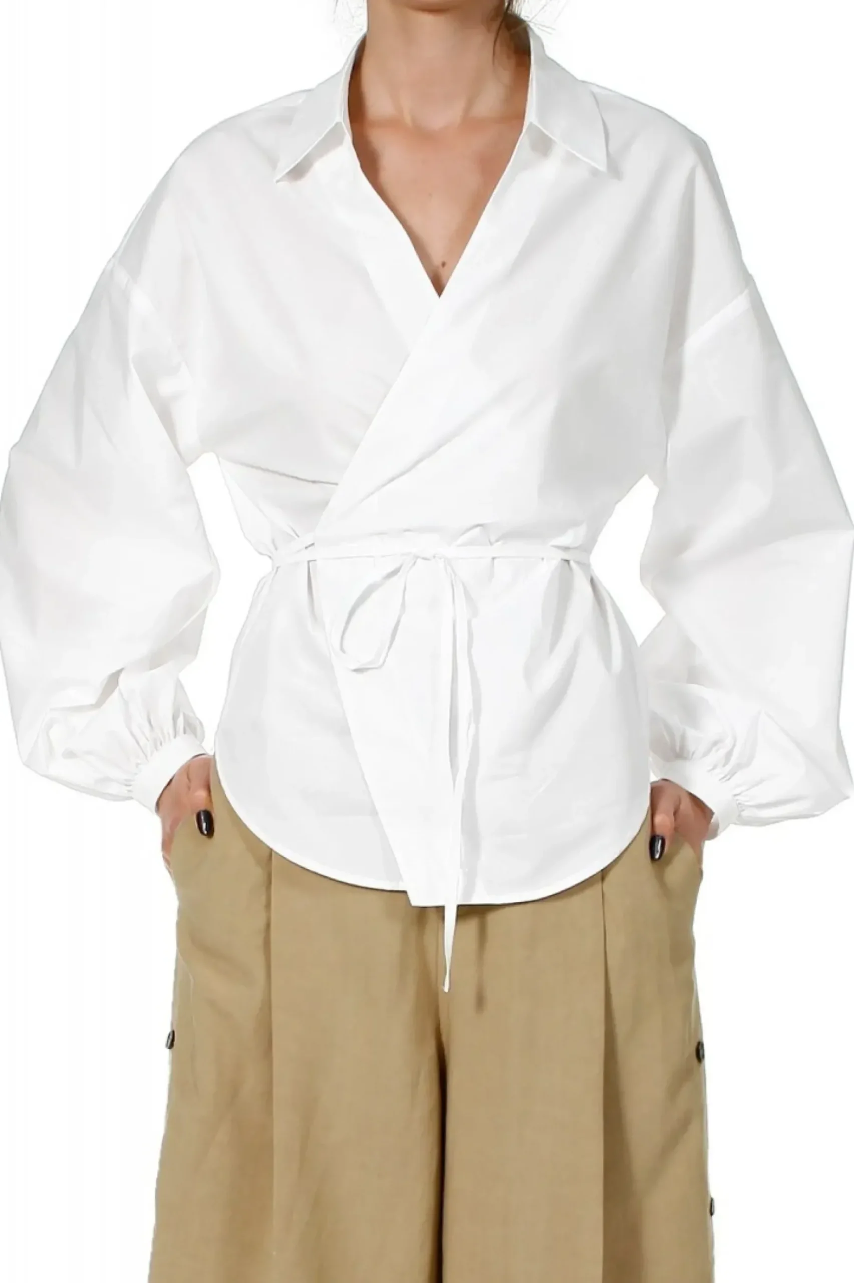 Kopertowa Bluzka Koszulowa Z Dekoltem W Szpic. Projekt Zostal Uszyty Ze 100% Bawelny O Nieco Sztywniejszym, „Papierowym” Chwycie Dzieki Czemu Fason Utrzymuje Przestrzenny Efekt.