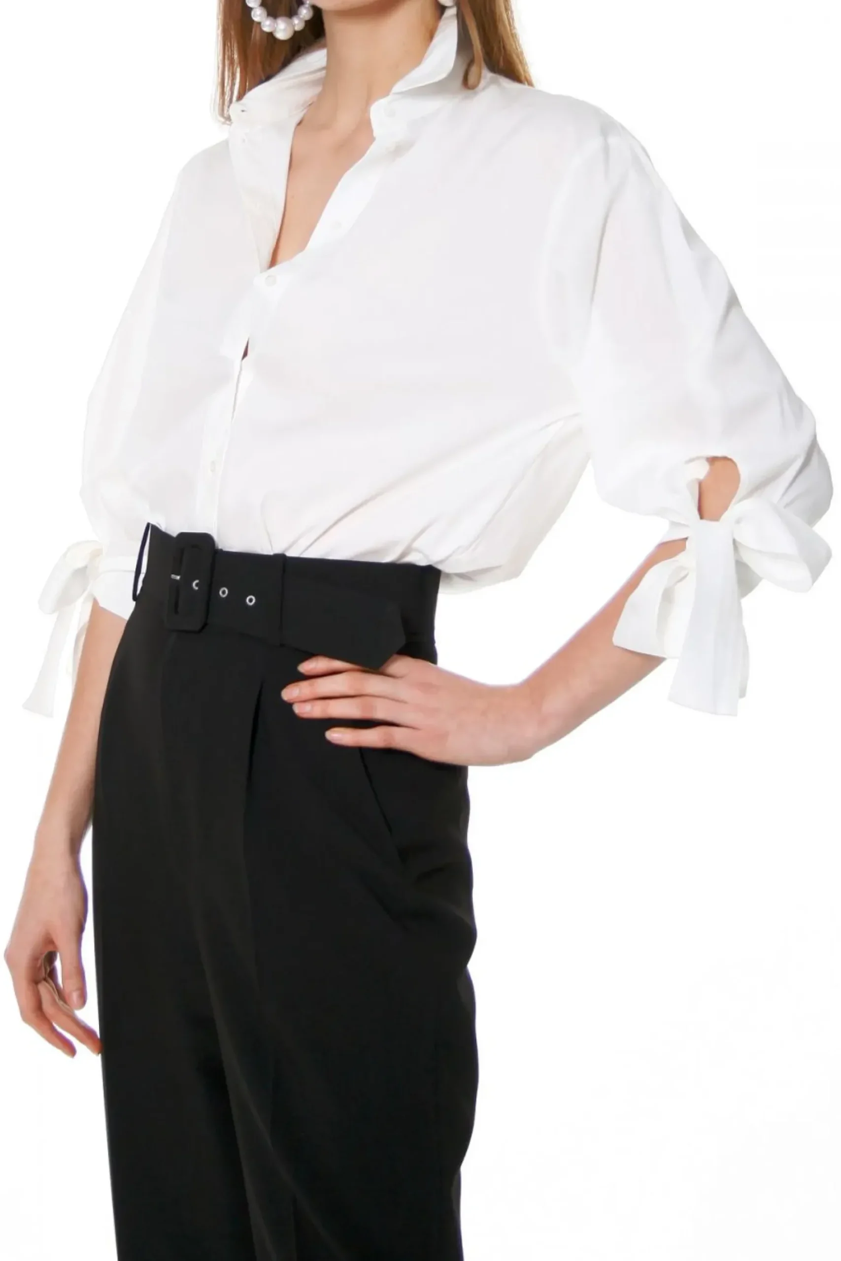 Klasyczny Fason Przelamany Ciekawymi Rekawami O Dlugosci 3/4 Zebranymi W Mankiety Wiazane Na Supel Z Kokarda.