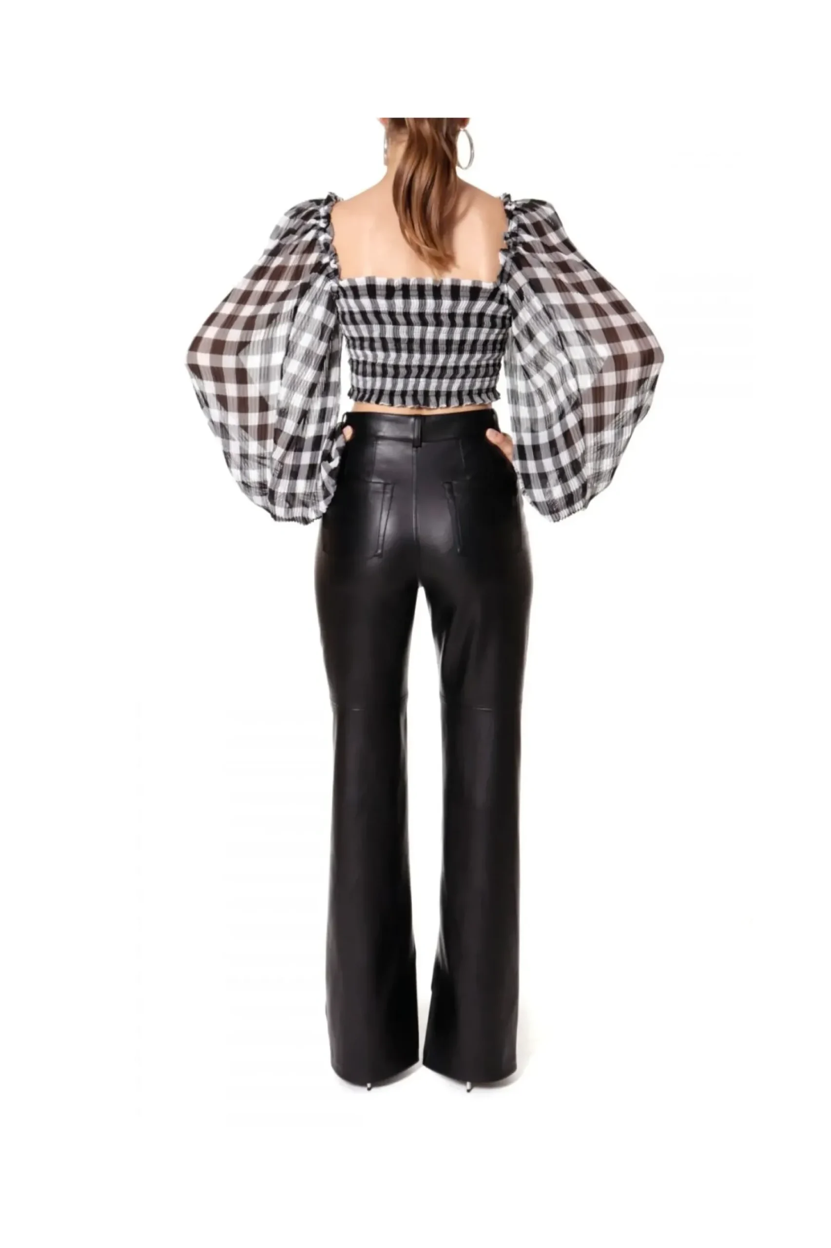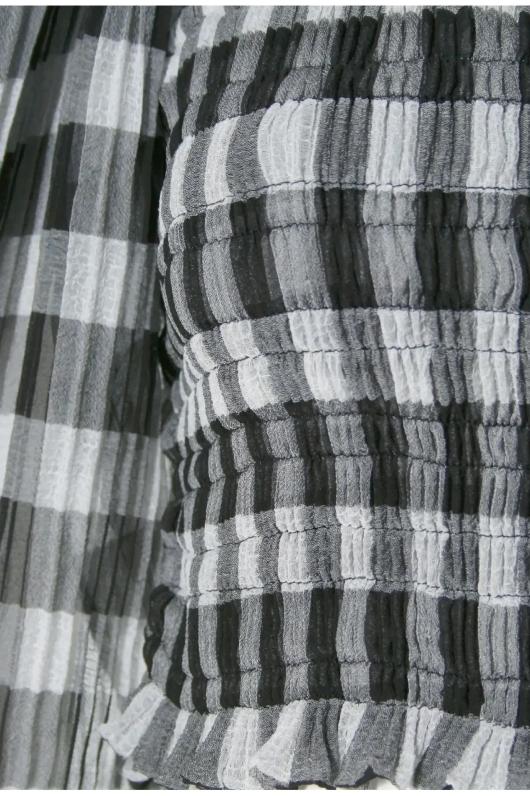 Efektowny Top Uszyty Z Delikatnej Szyfonowej Krepy W Kratke Vichy. Dopasowany Gesto Marszczonymi Delikatnymi Gumkami. Plisowane, Przeskalowane W Formie, Bufiaste Rekawy Tworza Spektakularny Efekt Projektu.