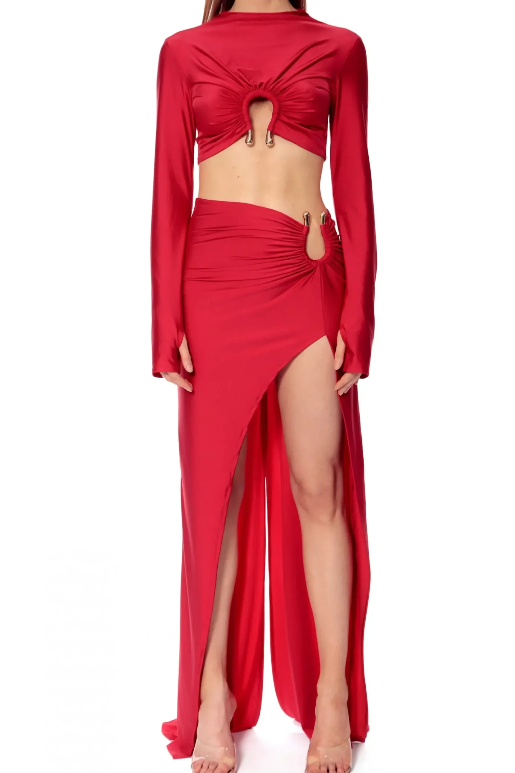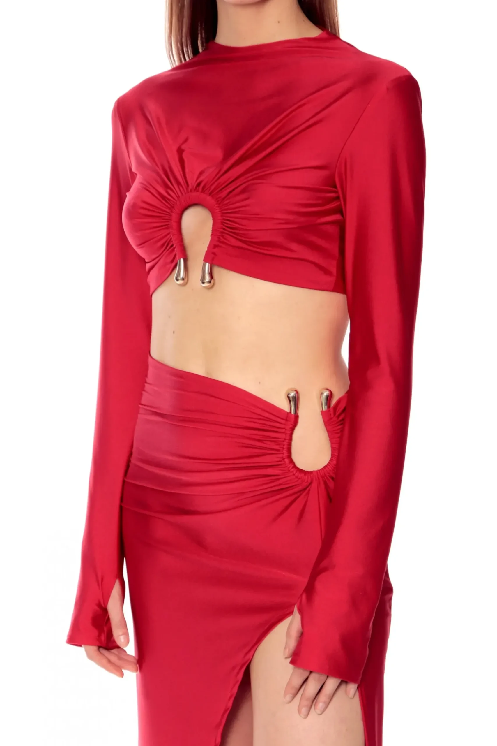 Dopasowany Top Z Dlugim Rekawem Z Otworem Na Kciuk. Wykonany Z Elastycznej Polyskujacej Tkaniny. Marszczony Przod Ozdobiony Bizuteryjna Podkowa W Zlotym Kolorze. Dopelnij Stylizacje Spodnica Cleo Shy Cherry.