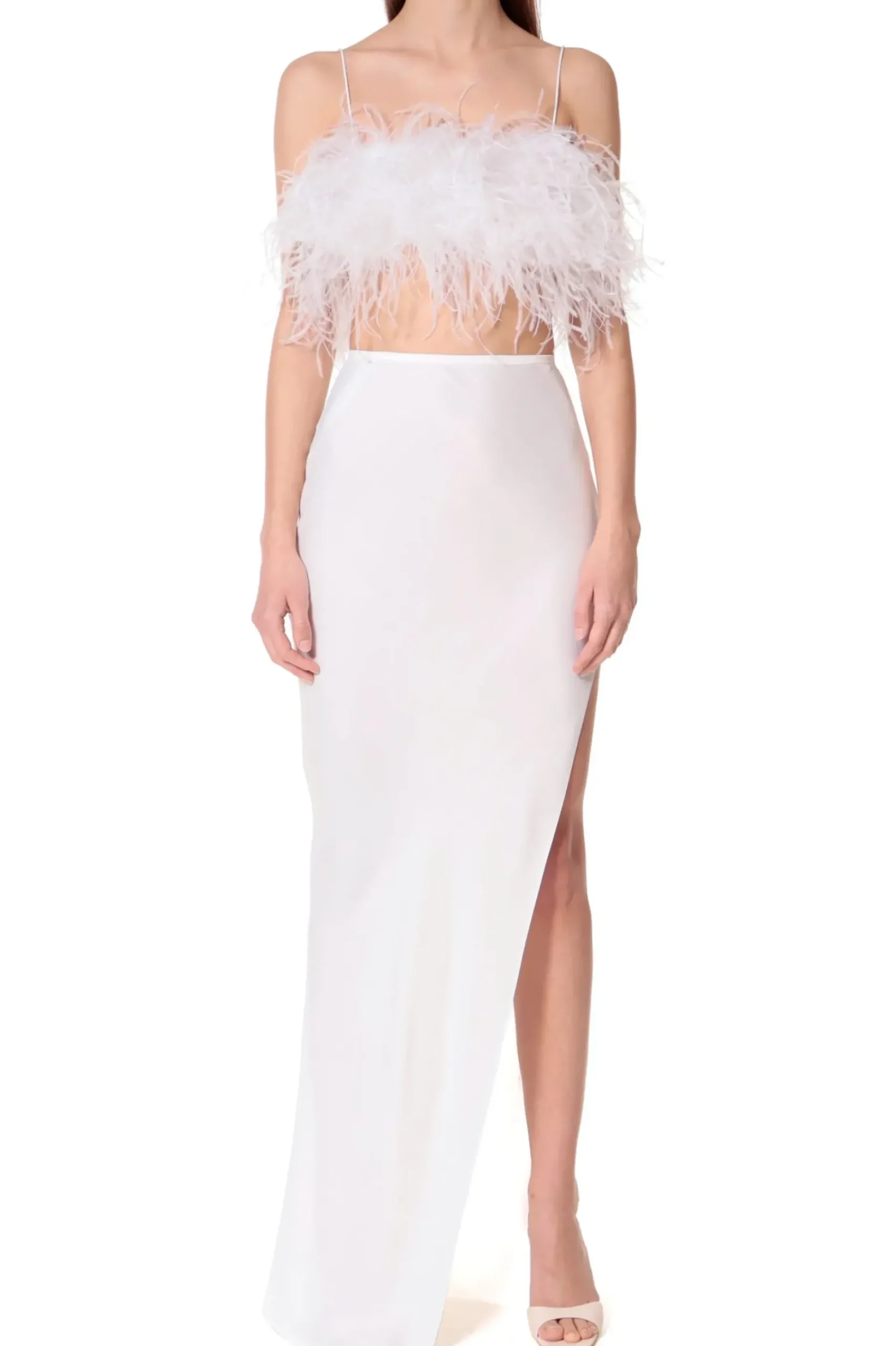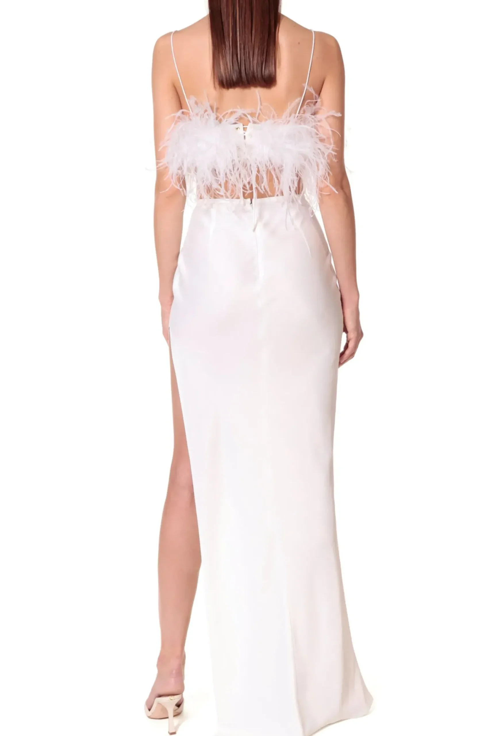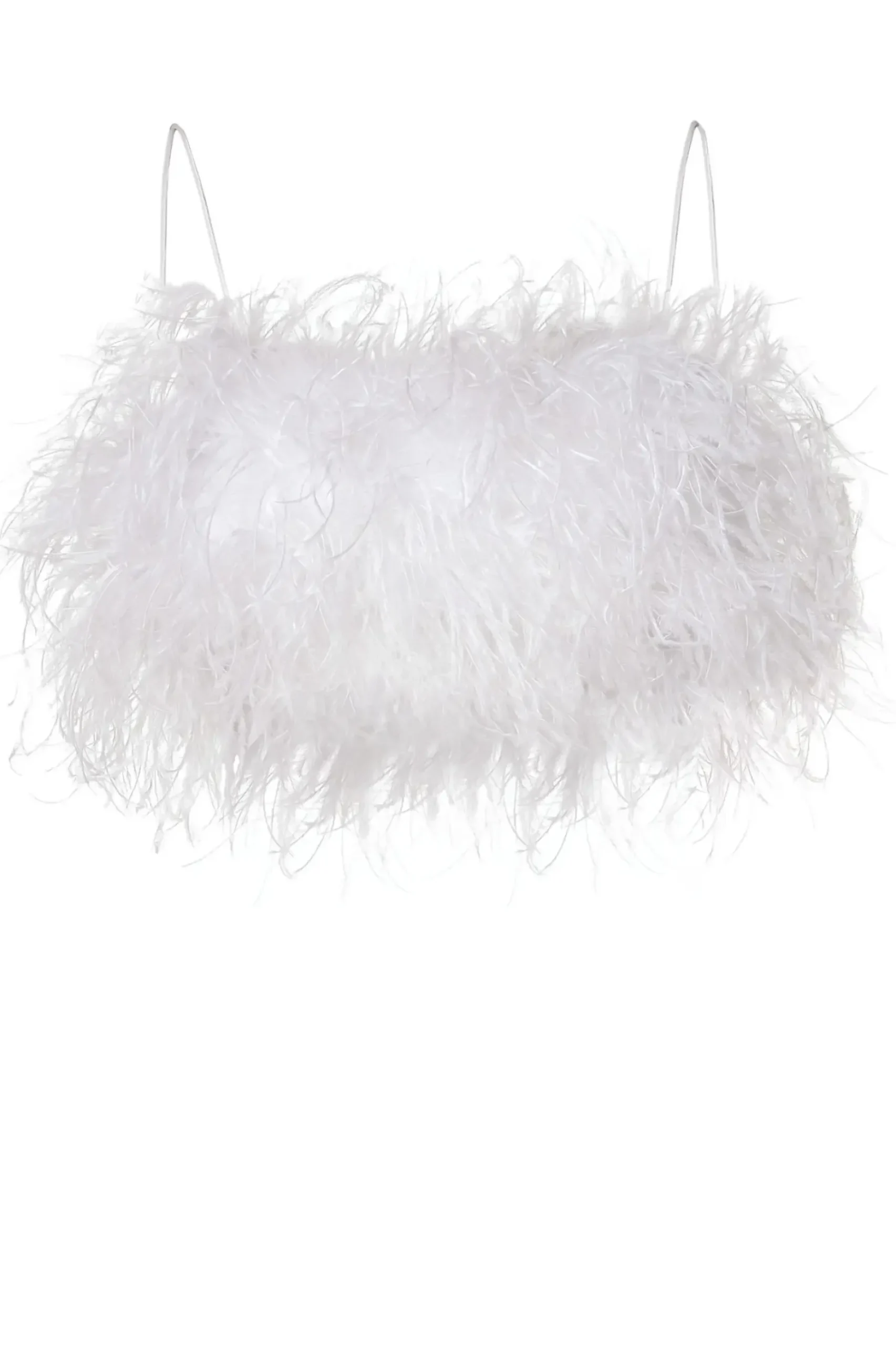 Zmyslowy Wieczorowy Top Uszyty Ze Strusich Pior Na Subtelnych Ramiaczkach Typu Makaroniki.