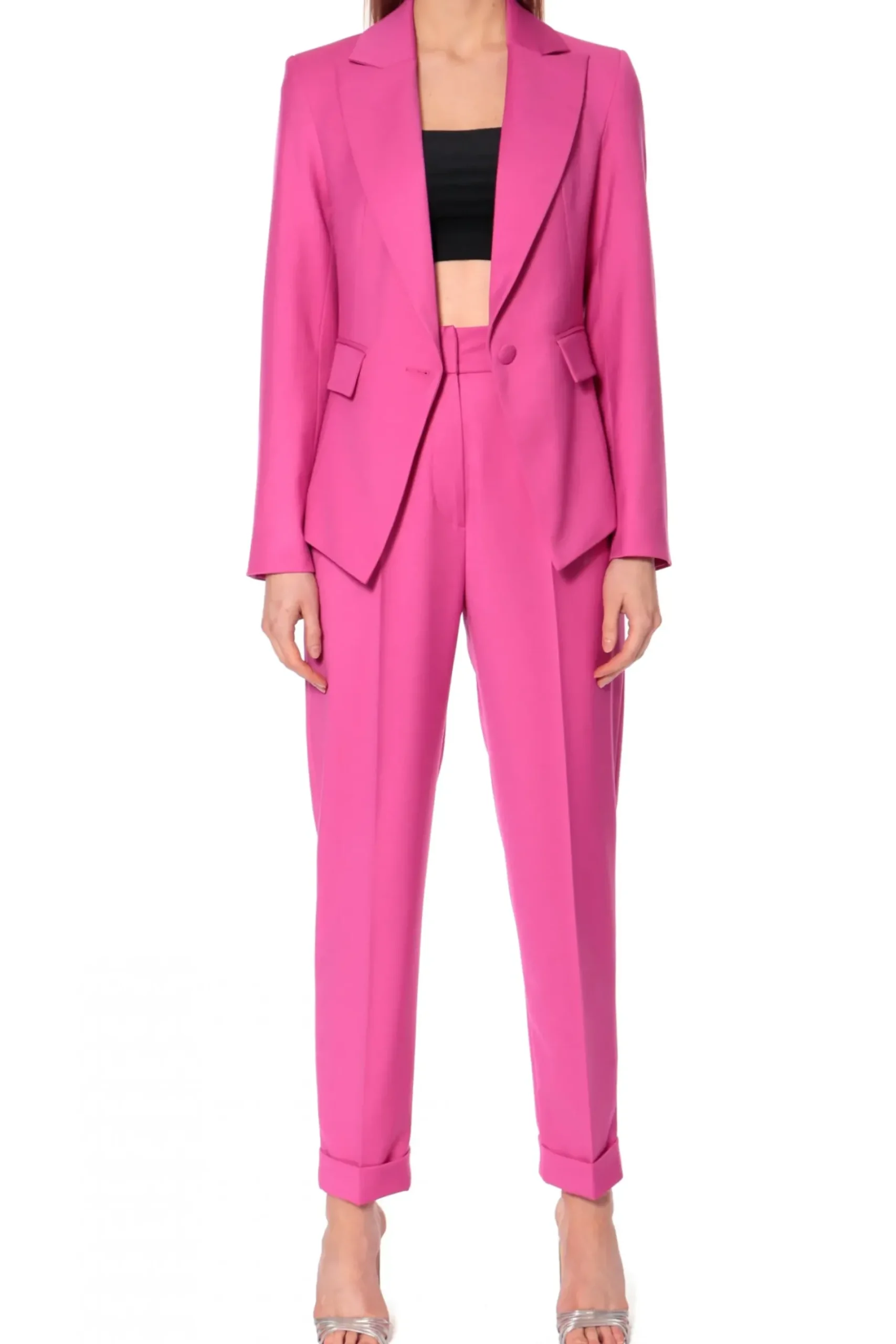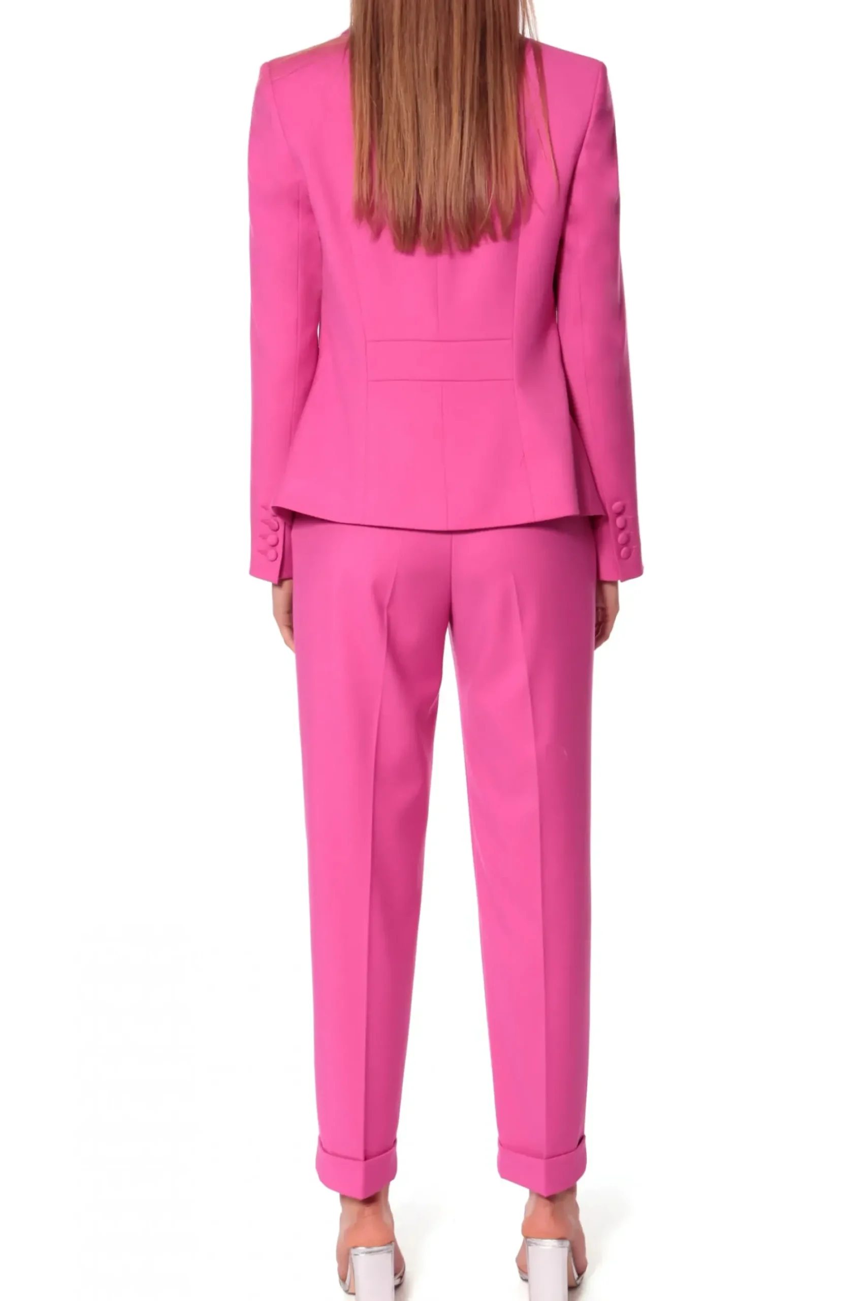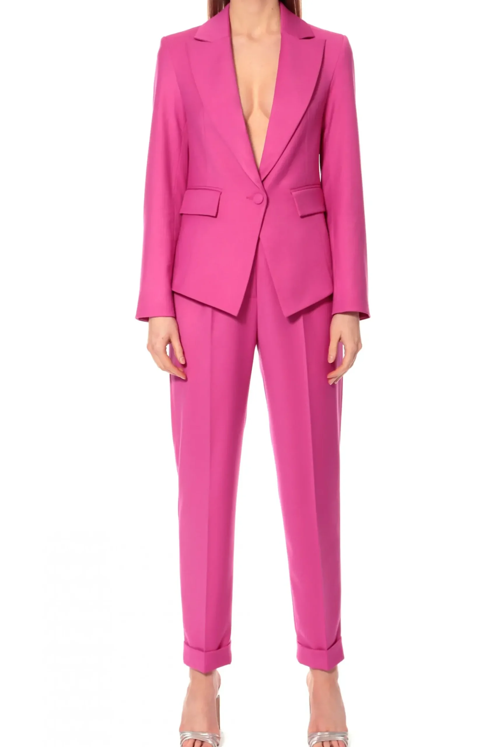 Kobieca Marynarka O Wysmuklajacym, Modelujacym Kroju Zapinana Na Guzik Obleczony Tkanina. Dolne Poly Marynarki O Geometrycznym Kroju Z Wysoko Umieszczonymi Przednimi Kieszeniami Podkreslaja Talie. Skompletuj Ja Ze Spodniami Kelly Very Berry.