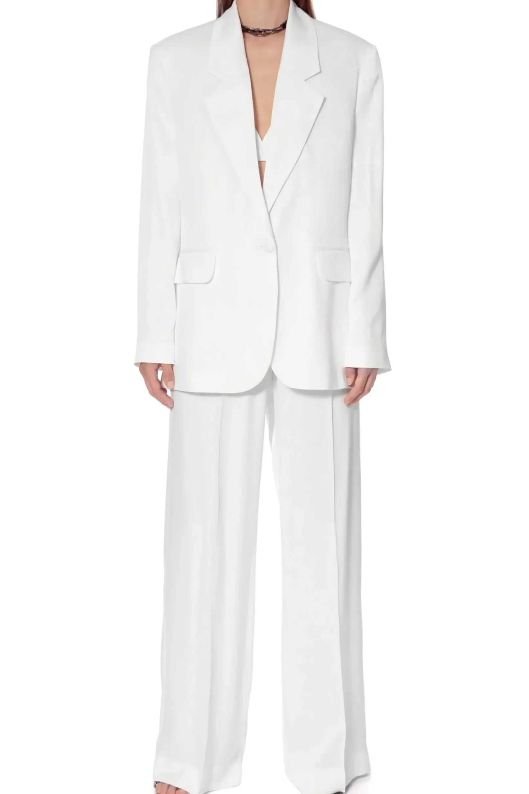Jednorzedowa Atlasowa Marynarka O Luznym, Nieco Nonszalanckim Kroju Kroju Z Charakterystycznym Dla Projektow Aggi Kunsztem Konstrukcyjnym Zaakcentowanym W Mocniejszej, Zdecydowanie Podkreslonej Linii Ramion Oraz Precyzyjnie Wymodelowanych Klapach. Dlugie Rekawy, Miekko Ukladajaca Sie Miesista, Szlachetna Tkanina Atlasowa Pozwala Odkryc W Projekcie Zarowno Dzienny Jak I Wieczorowy Charakter Marynarki. Zestaw Ja Z Satynowymi Spodniami Jessie Satin Bright White I Topem Asha Satin Bright White Lub Zarzuc Na Ramiona Do Dopasowanej Wieczorowej Sukienki. Calosc Na Delikatnej Szyfonowej Podszewce.