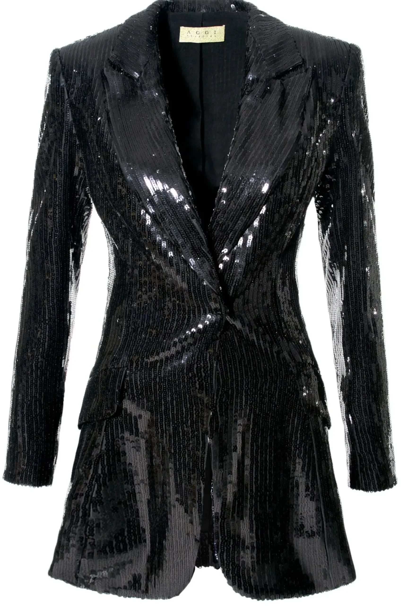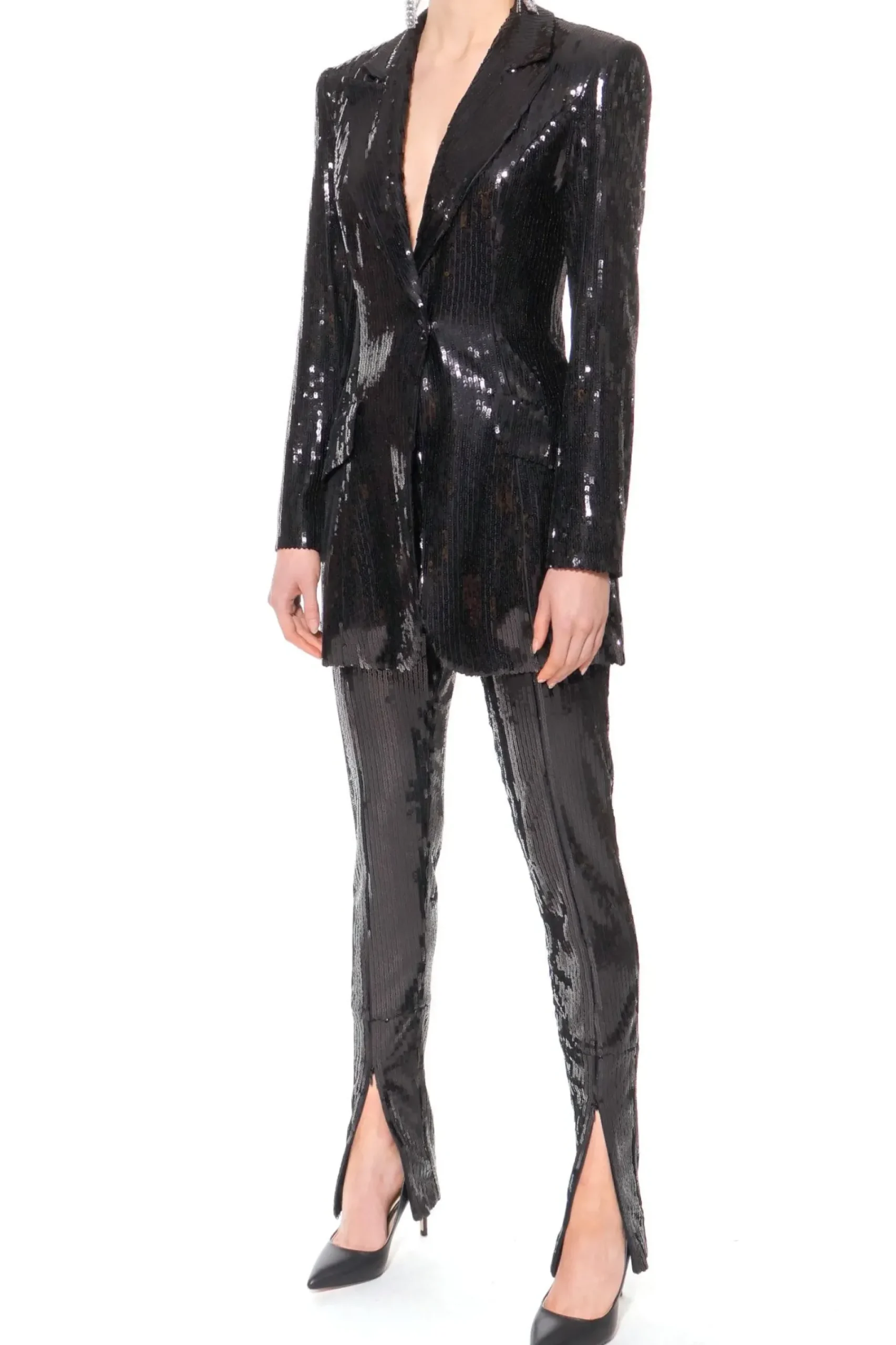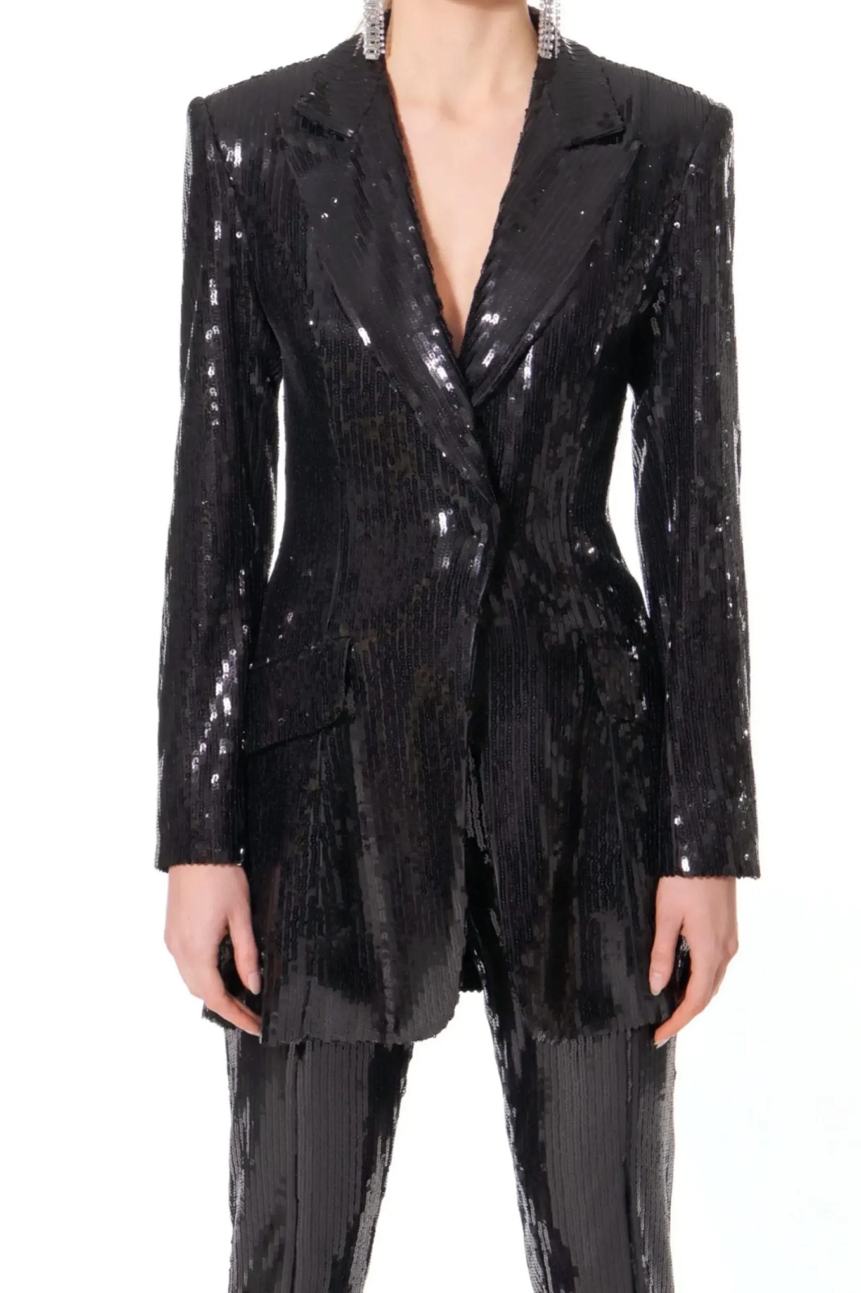 Dluga Wieczorowa Marynarka Cekinowa O Efektownym Mokrym, Lakierowanym Polysku. Smukla Linia Projektu, Zdecydowany Dekolt Wspaniale Eksponuja Atuty Kobiecej Sylwetki. Skomponuj Ja Ze Spodniami Stella Black Onyx I Stworz Oszalamiajacy Wieczorowy Look.
