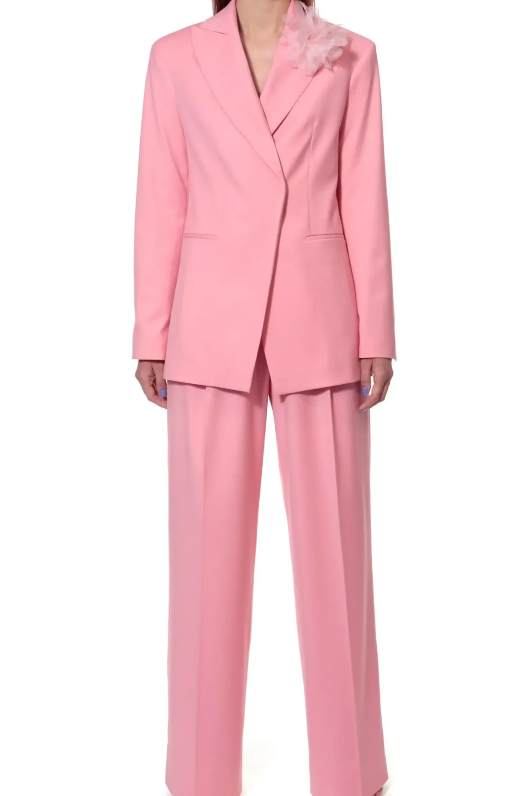 Dwurzedowa Marynarka Wymodelowana Tak Aby Nadac Sylwetce Linie Litery X.Zaakcentowane Szerzej Ramiona I Biodraoraz Ciecia Subtelnie Akcentujace Talie.Szerokie Klapy Z Kwiatem Z Organzy W Butonierce.Calosc Na Zakardowej Podszewce W Drobne Prazki.