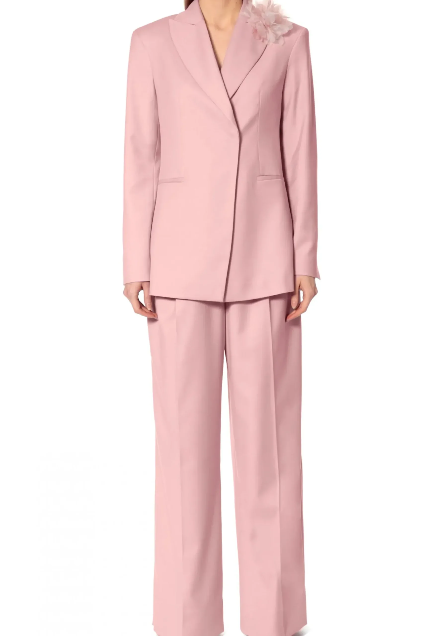 Dwurzedowa Marynarka Wymodelowana Tak Aby Nadac Sylwetce Linie Litery X.Zaakcentowane Szerzej Ramiona I Biodraoraz Ciecia Subtelnie Akcentujace Talie.Szerokie Klapy Z Kwiatem Z Organzy W Butonierce.Calosc Na Zakardowej Podszewce W Drobne Prazki.