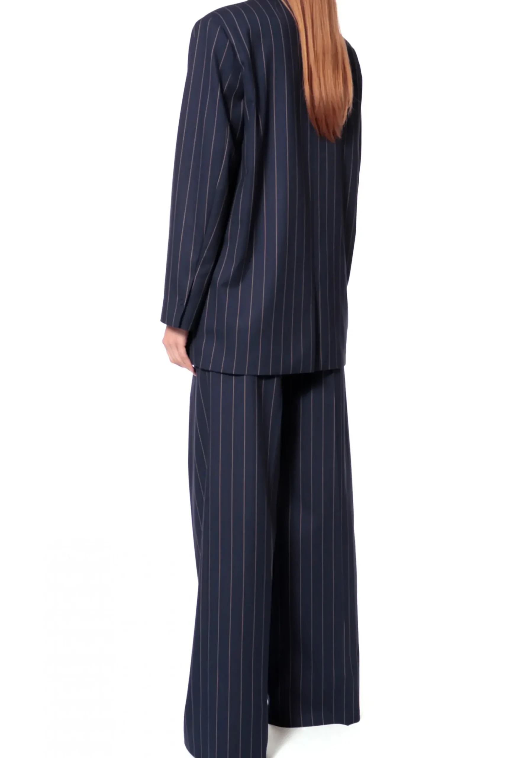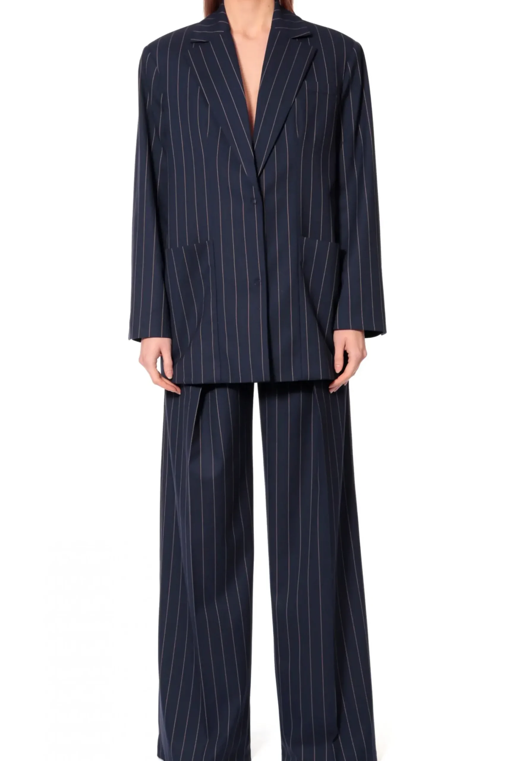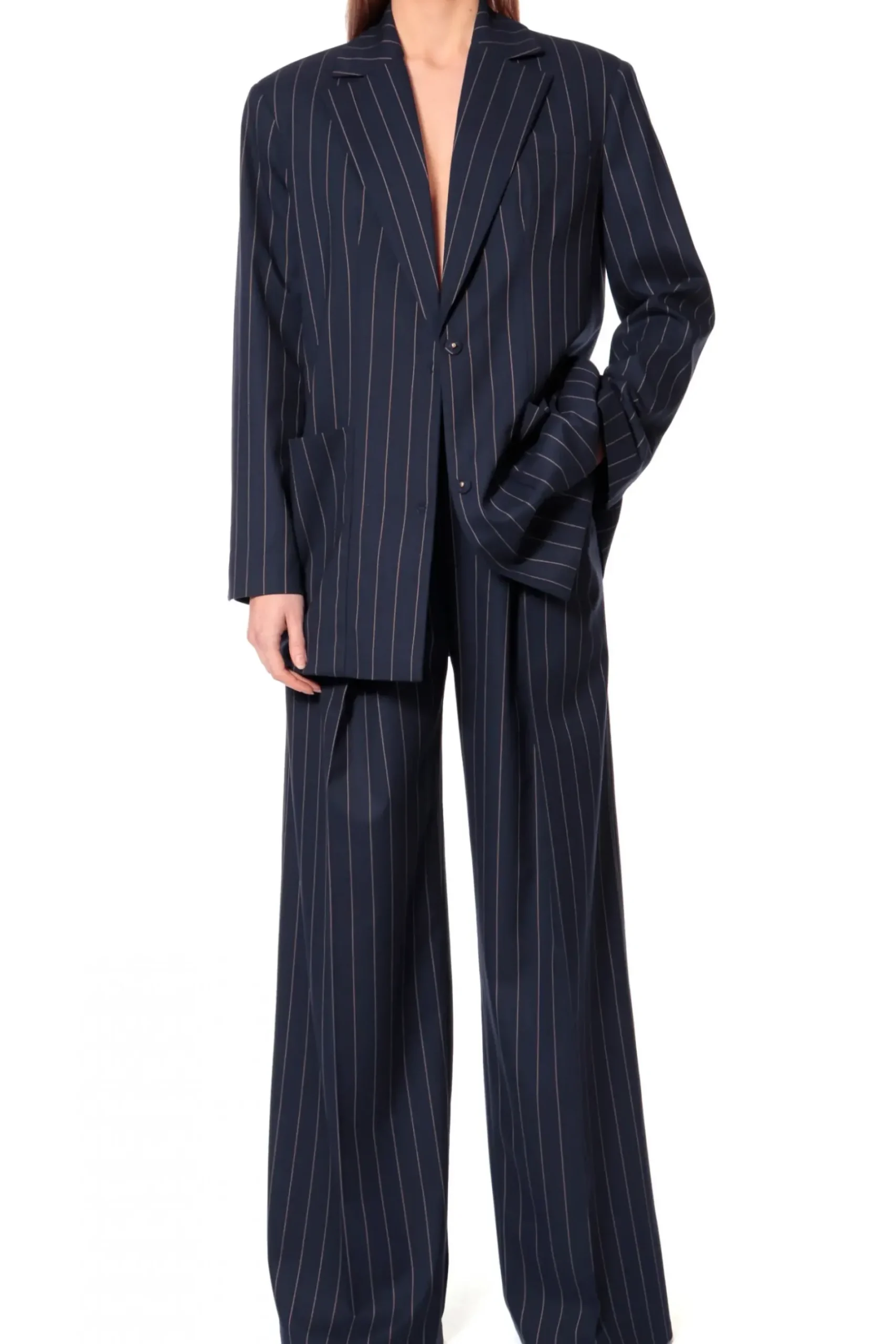 Dluga Jednorzedowa Marynarka W Tenisowy Prazek. Szeroka Linia Ramion Oraz Obszerne Nakladane Kieszenie Wtapiajace Sie We Wzor Koresponduja Z Mocno Oversizowym Krojem Marynarki . Nos Ja Ze Spodniami Stacey Mood Indigo.