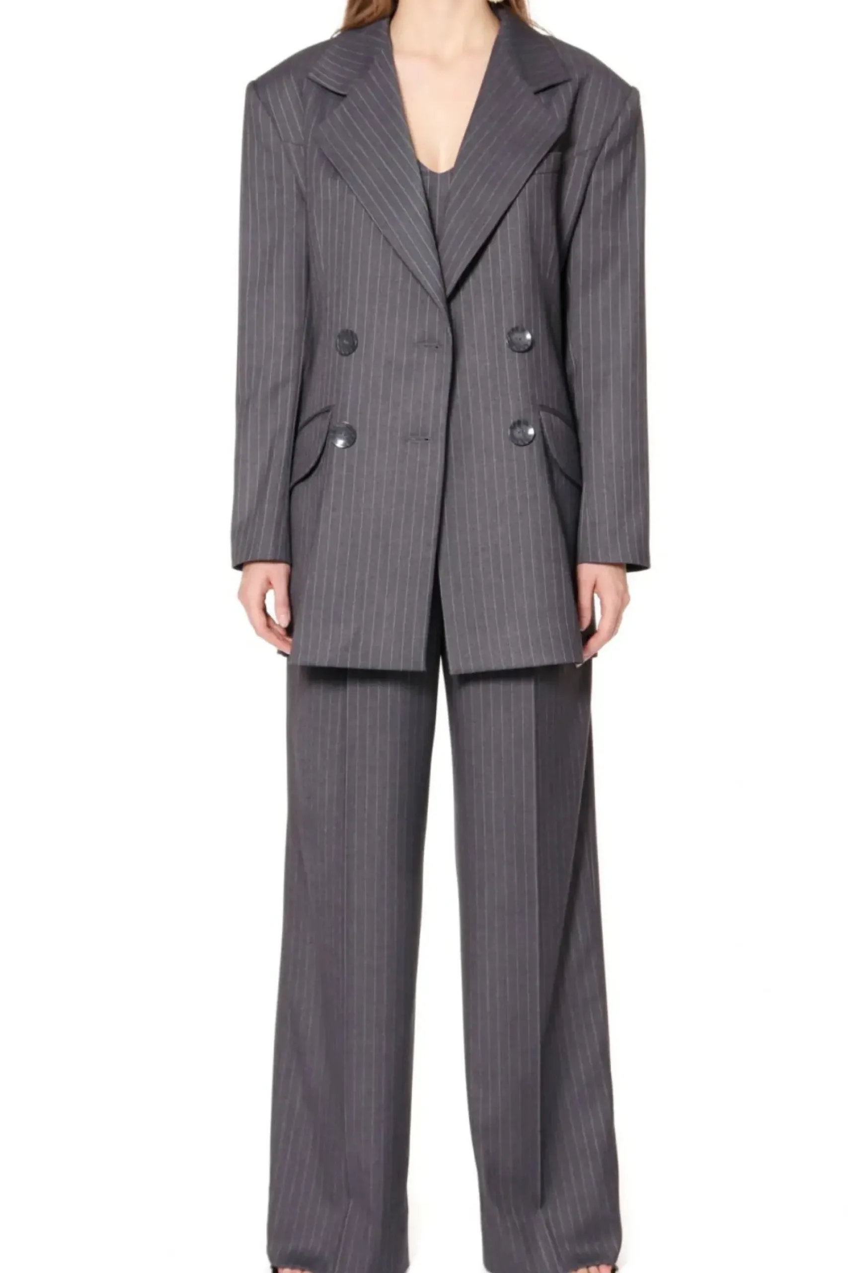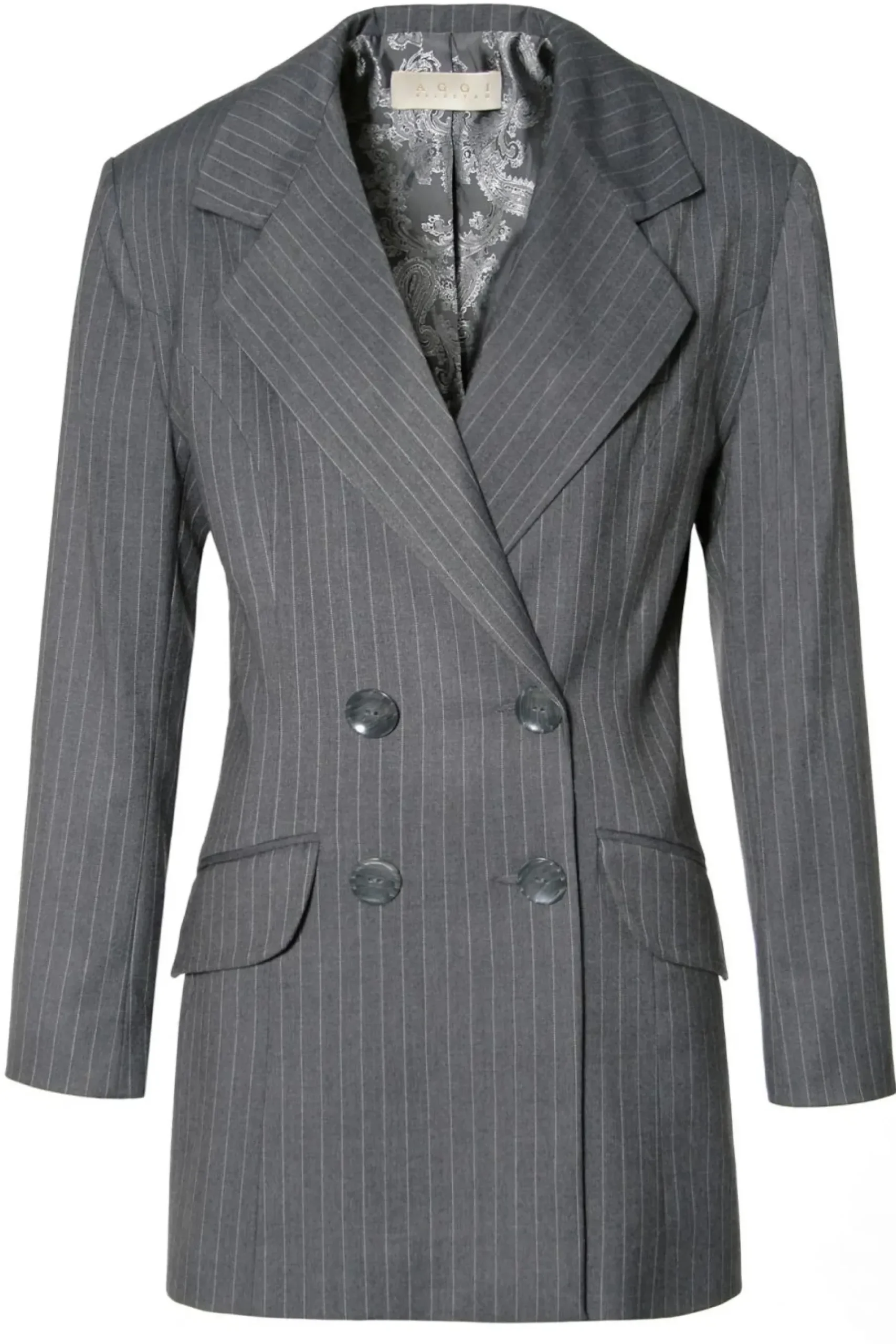 Dluga Marynarka W Tenisowy Prazek Z Mocno Zaznaczona, Nieco Przerysowana Linia Ramion. Dwurzedowe Zapiecie Na Piekne Duze Perlowo-Szare Guziki, Ktore Przelamuja Maskulinistyczny Charakter Projektu. Calosc Na Pieknej Zakardowej Podszewce We Wzor Paisley. Projekt Stanowi Jeden Z Elementow Czteroczesciowego Garnituru – Skomponuj Go Ze Spodniami Gwen, Kamizelka Sienna I Gorsetem Lara.