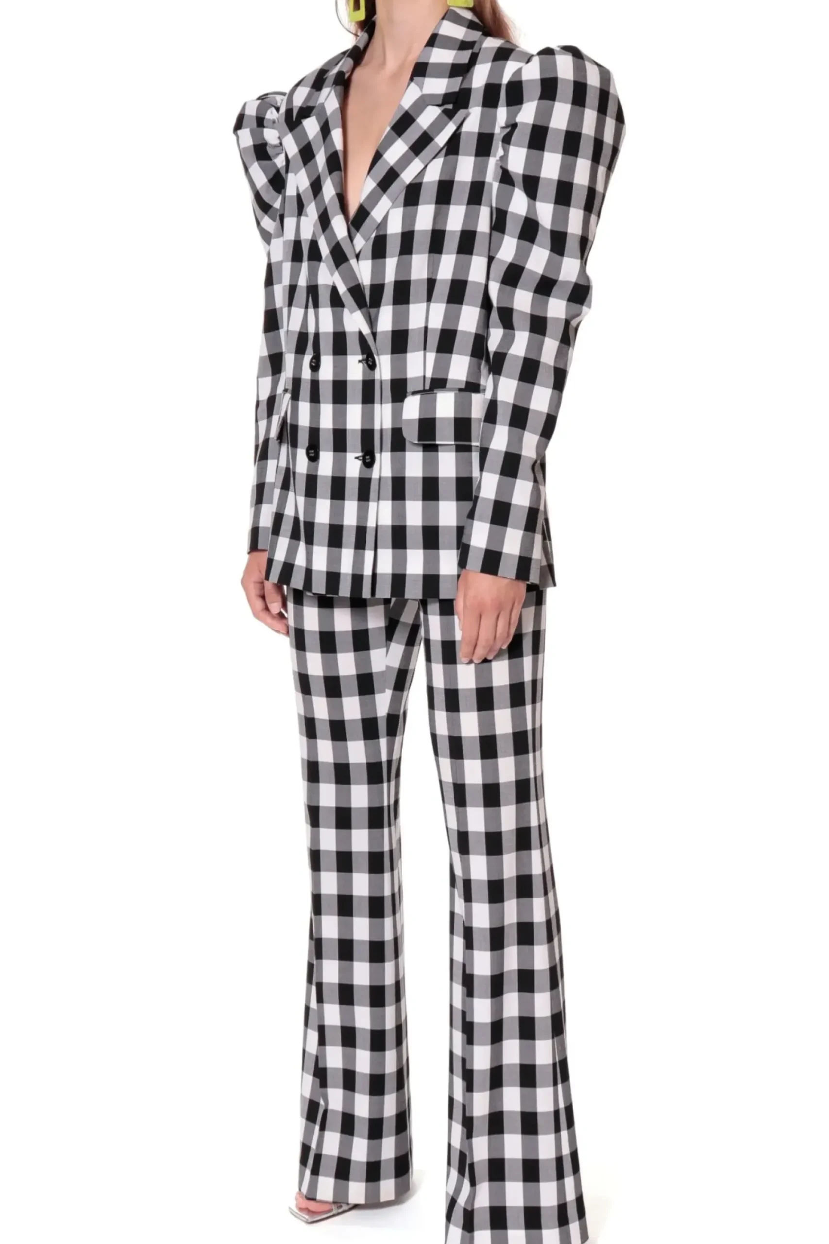 Dwurzedowa Marynarka Z Duzymi Bufami. Eklektyczny Fason W Monochromatyczna Bialo-Czarna Krate Gingham Wykonczony Z Dbaloscia O Detal – Czarne Ebonitowe Guziki Ze Srebrnymi Dziurkami Zdecydowany, Mocny Wzor Skupia Uwage I Bedzie Glownym Elementem Twojej Stylizacji. Nos Ja W Zestawie Ze Spodniami Lexi.