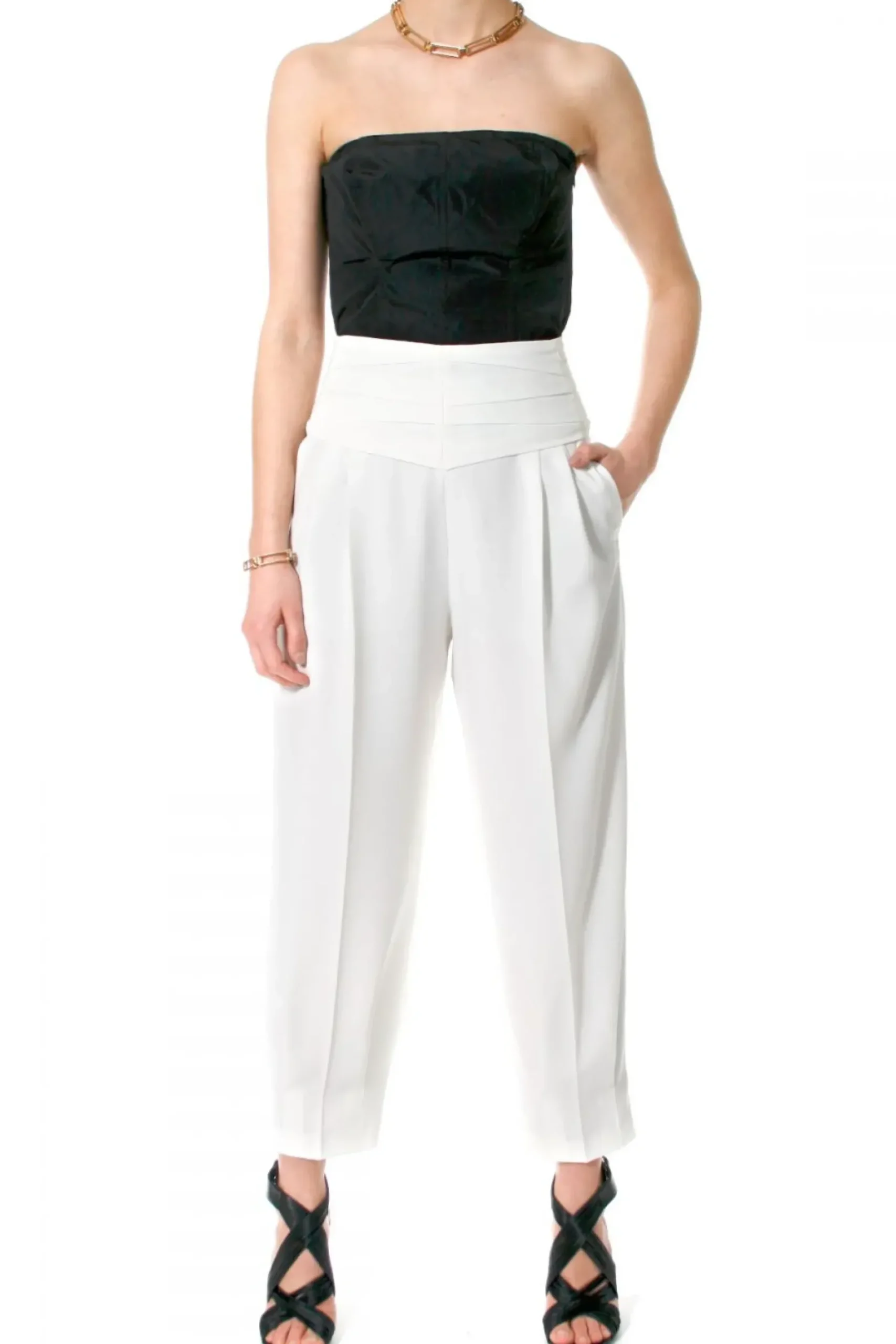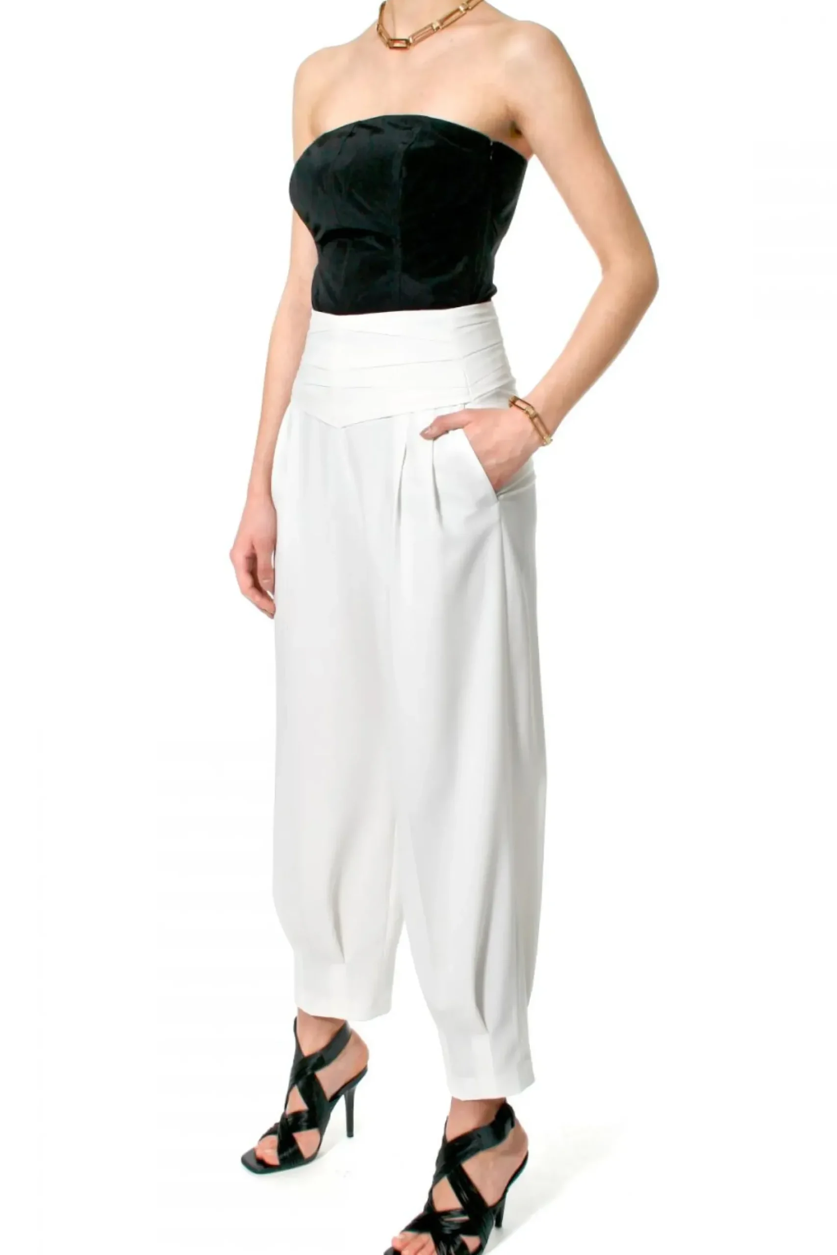 Spodnie Z Misternie Plisowanym Karczkiem I Zakladkami. Zakladki Tworza Efekt Przestrzennych, „Napompowanych” Nogawek.