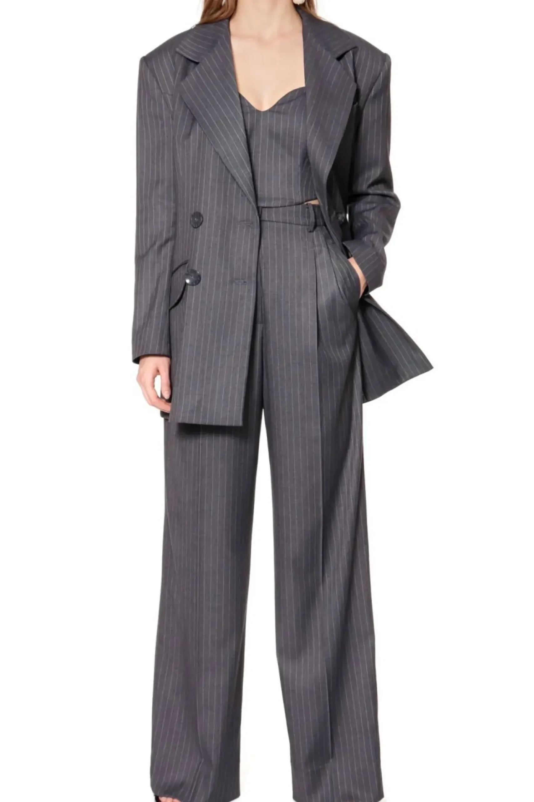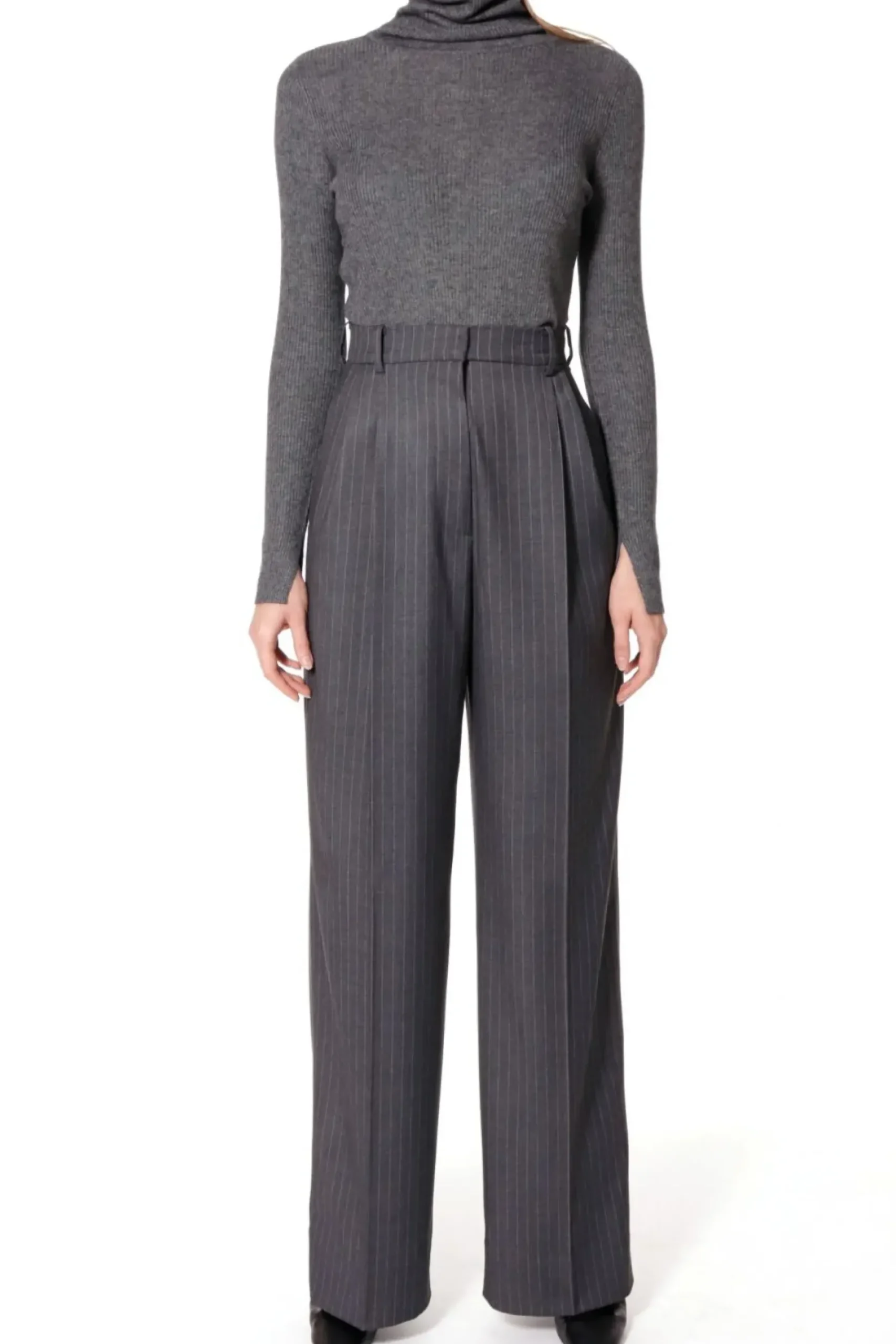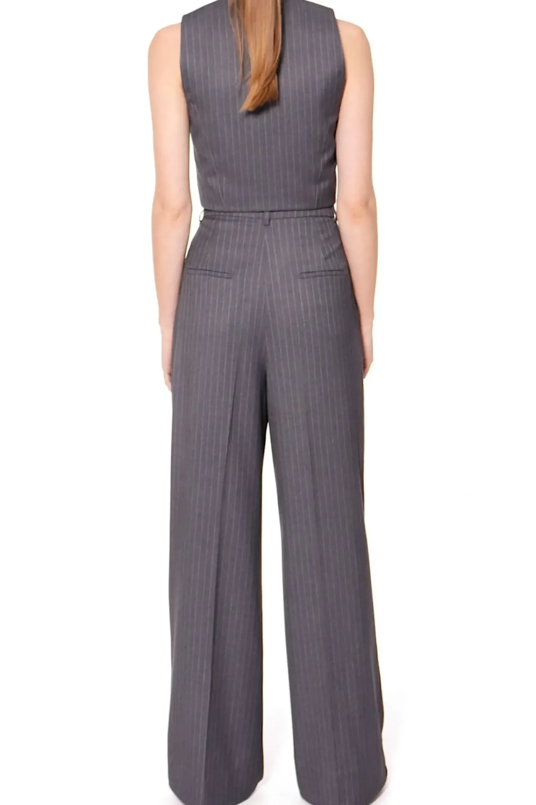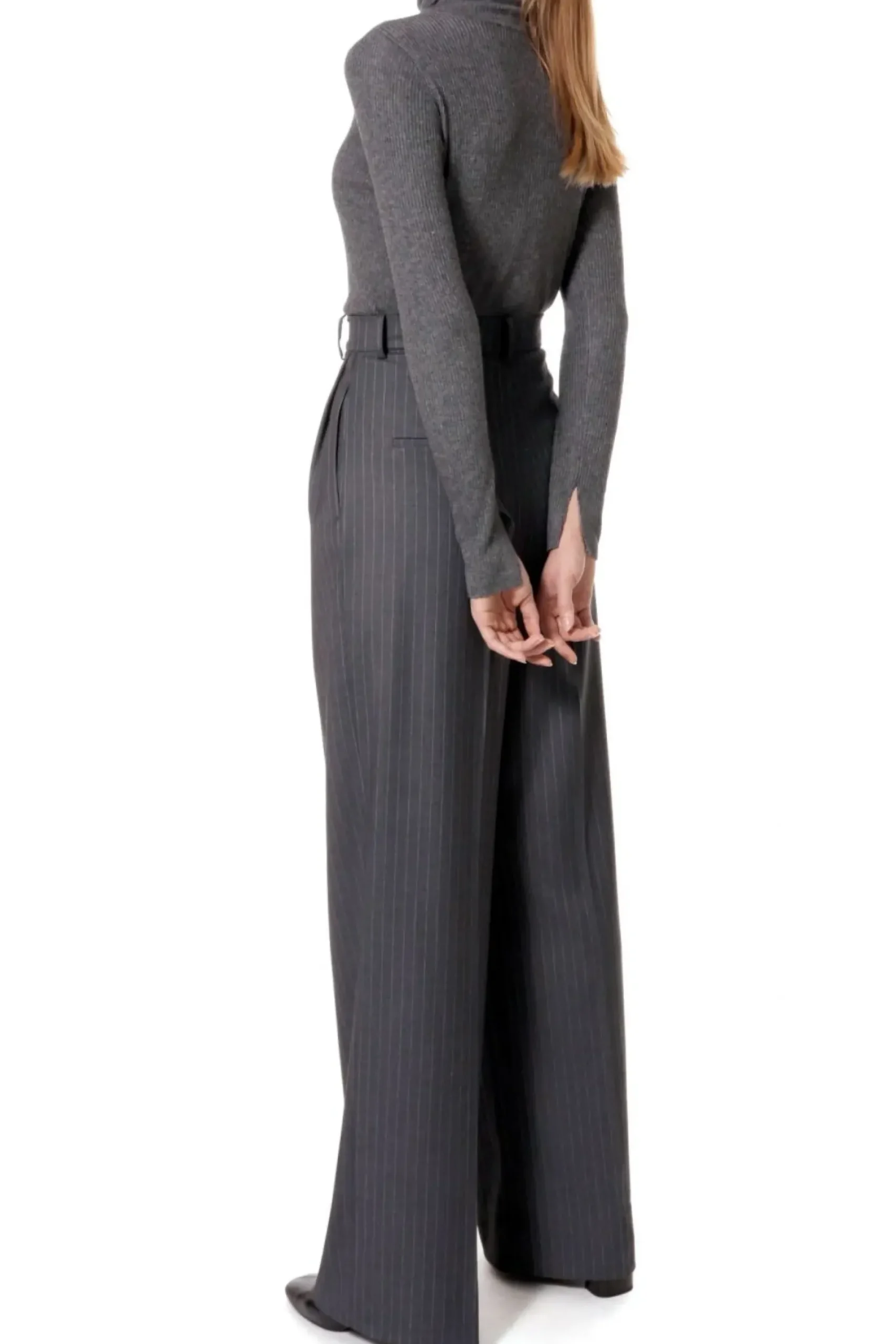 Szerokie Spodnie W Tenisowy Prazek. Wysoka Dopasowana Talia Z Zakladkami Pozostajaca W Kontrascie Z Szerokimi Nogawkami. Projekt Stanowi Jeden Z Elementow Czteroczesciowego Garnituru – Skomponuj Go Z Marynarka Tiffany , Kamizelka Sienna I Gorsetem Lara.