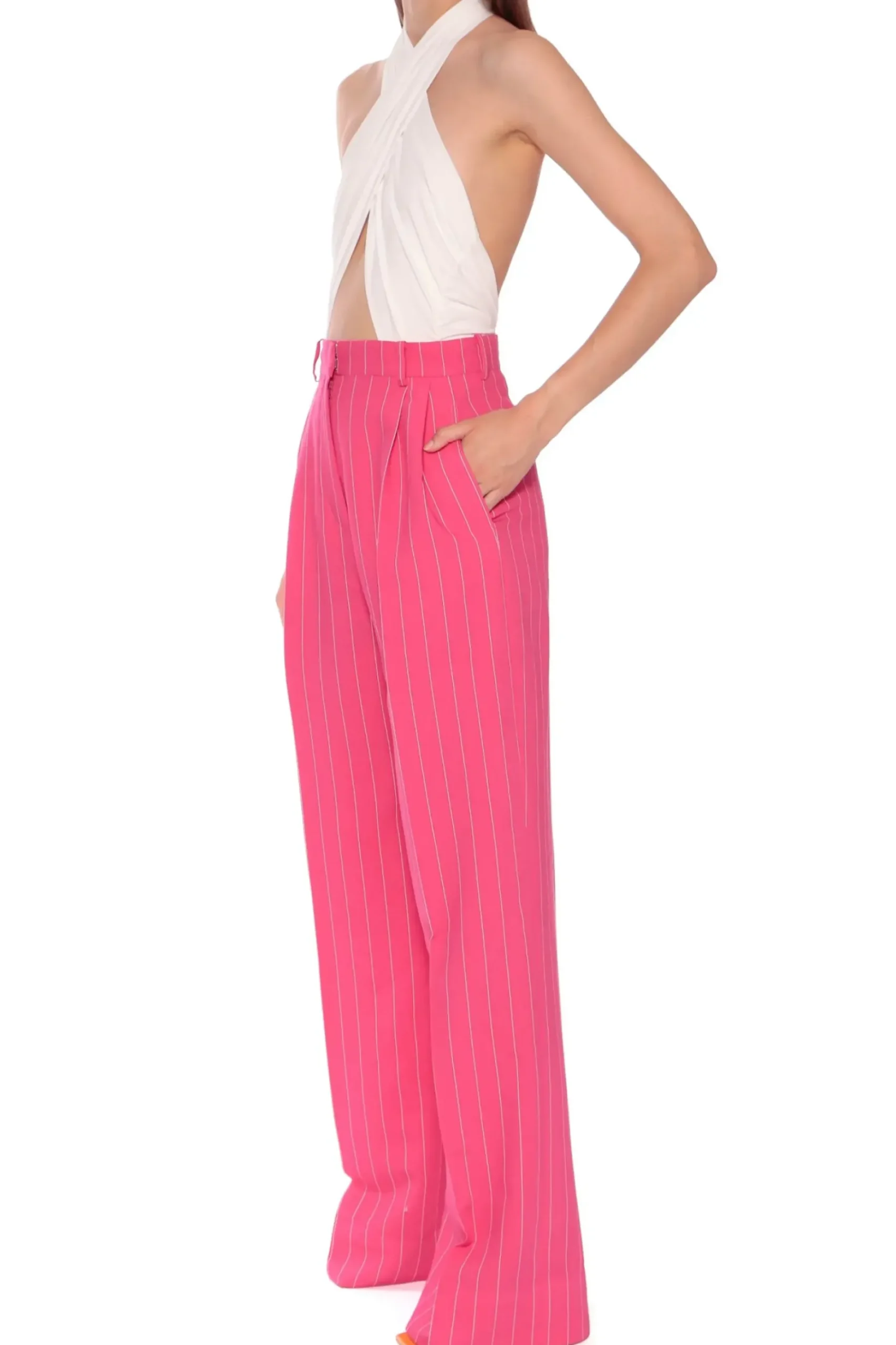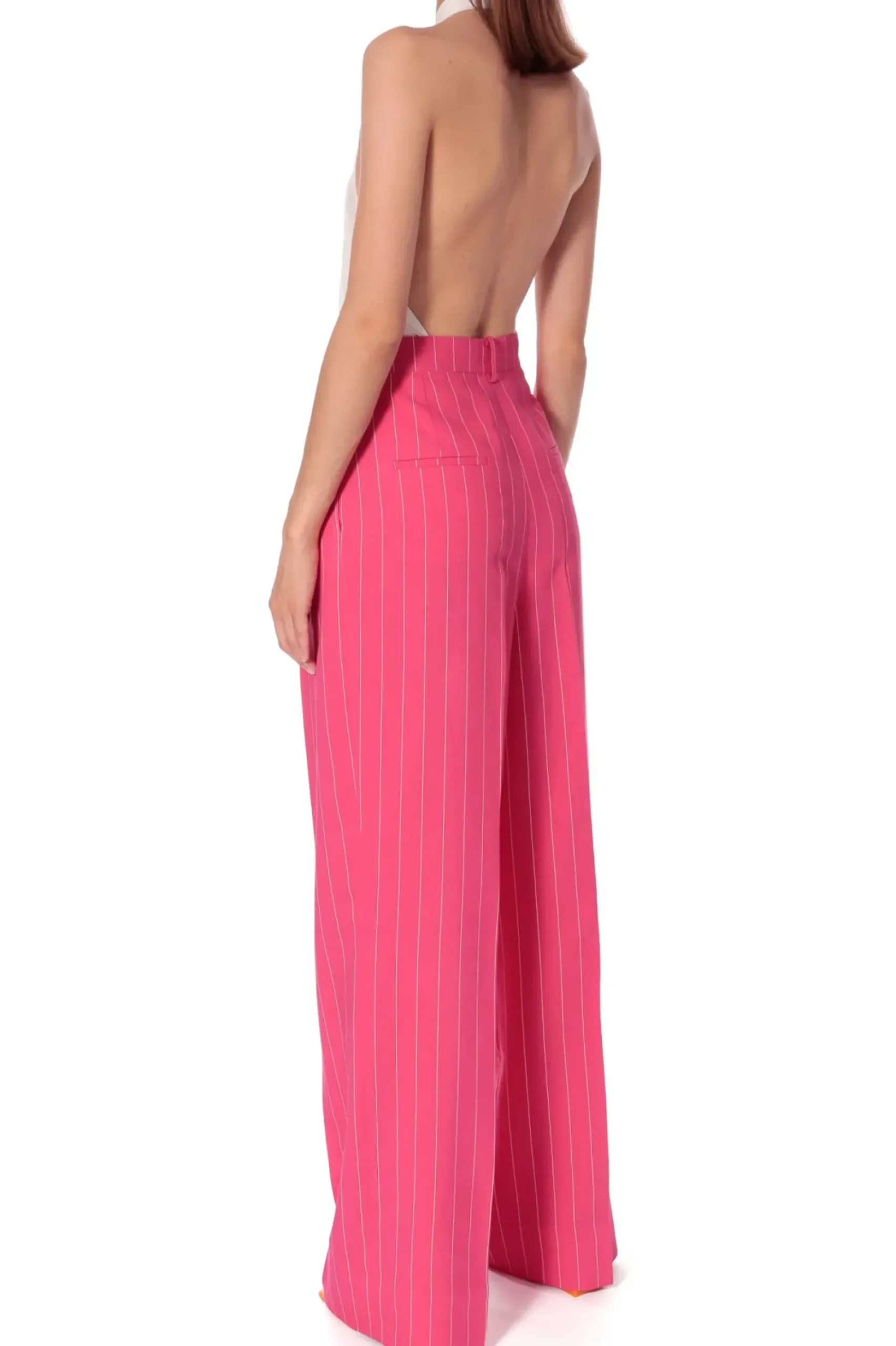 Szerokie Spodnie W Kolorze Intensywnego Rozu W Bialy Tenisowy Prazek. Wysoka Dopasowana Talia Z Zakladkami Pozostajaca W Kontrascie Z Szerokimi Nogawkami. Nos Je Z Marynarka Tiffany Hot Pink.
