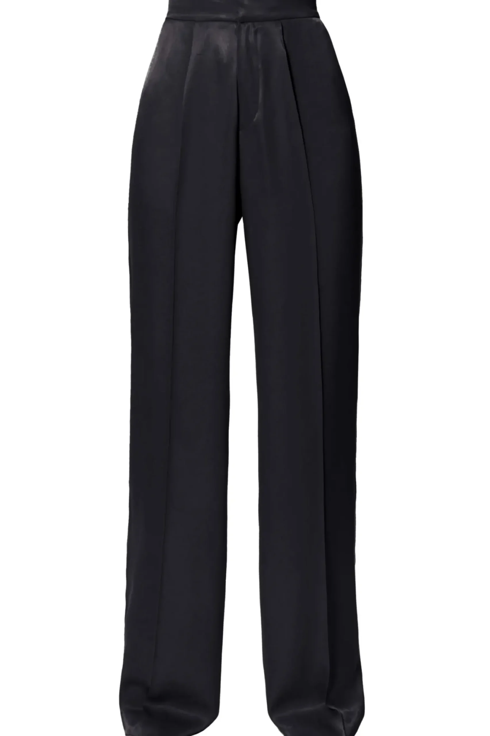 Atlasowe Spodnie Z Wyzszym Stanem Uszyte Z Miesistej, Szlachetnej, Miekko Ukladajacej Sie Tkaniny. Szerokie Proste Nogawki Nadaja Strzelistosci Sylwetce. Nos Je W Elegancki Sposob Do Klapek Na Obcasie Jako Wieczorowa Stylizacje Lub Swobodnie Do Klapek Birkenstock Lekko Obnizajac Je W Talii Tworzac Pozornie Niedbaly Pizamowy Styl. Spodnie Posiadaja Wygodne Boczne Kieszenie I Elastyczny Tyl Paska.