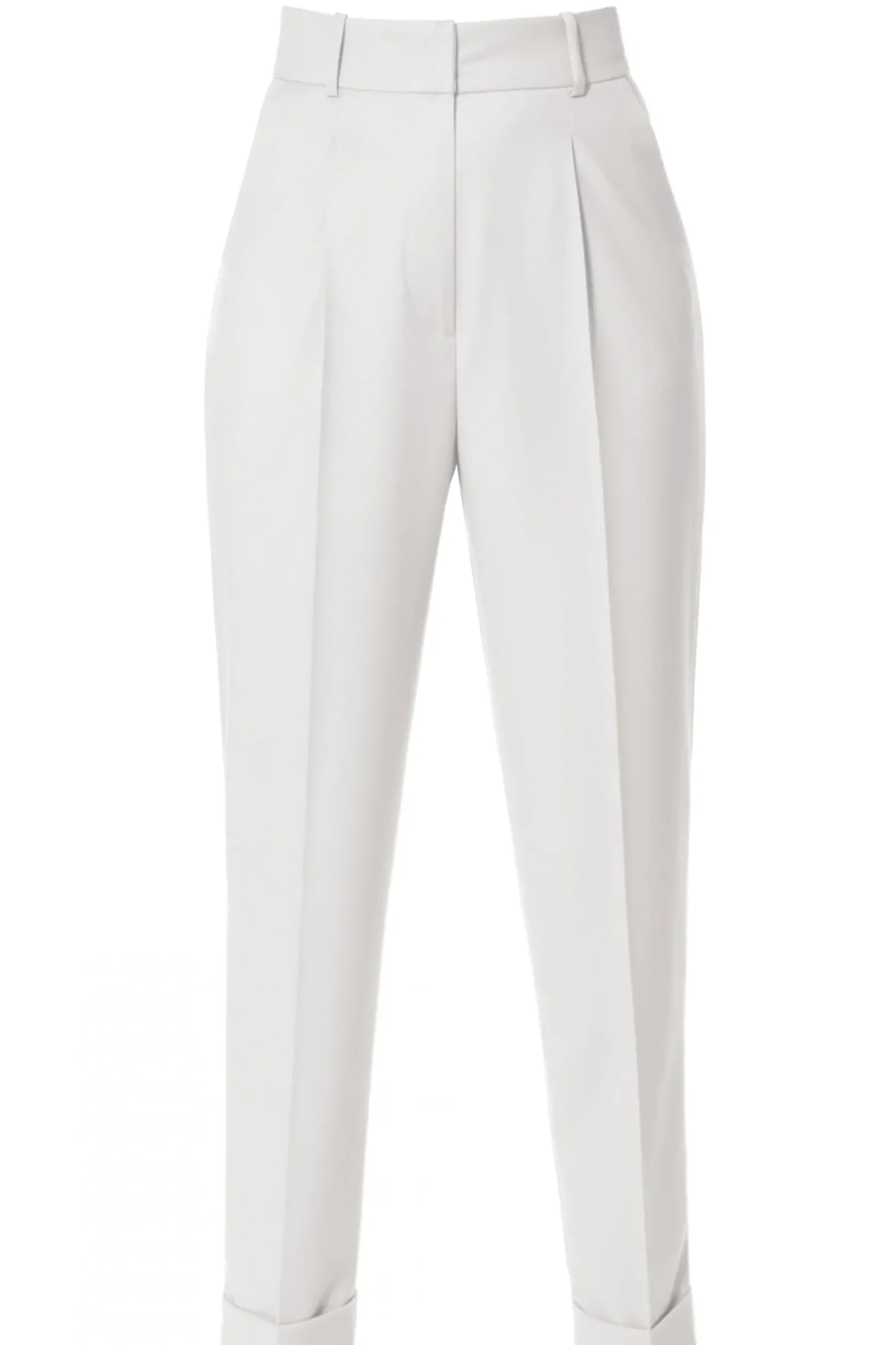 Garniturowe Spodnie Z Wysokim Stanem. Boczne Kieszenie, Szlufki W Pasie, Nogawki Zwezajace Sie Ku Dolowi Zaakcentowane Kantka Zakonczone Mankietem. Polacz Z Marynarka Angela Aesthetic White.