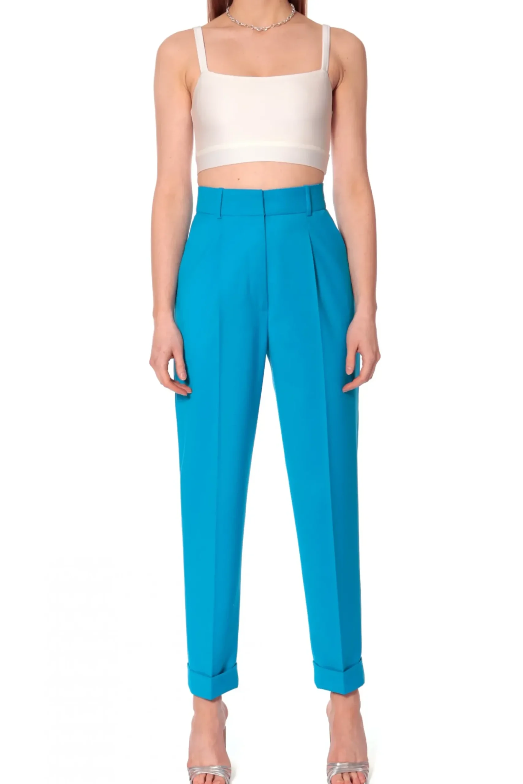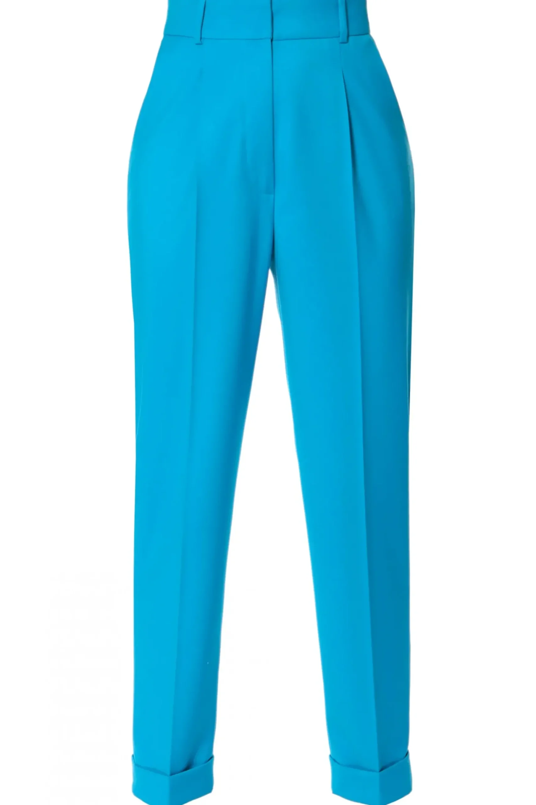Garniturowe Spodnie Z Wysokim Stanem. Boczne Kieszenie, Szlufki W Pasie, Nogawki Zwezajace Sie Ku Dolowi Zaakcentowane Kantka Zakonczone Mankietem. Polacz Z Marynarka Angela Blue Jewel.