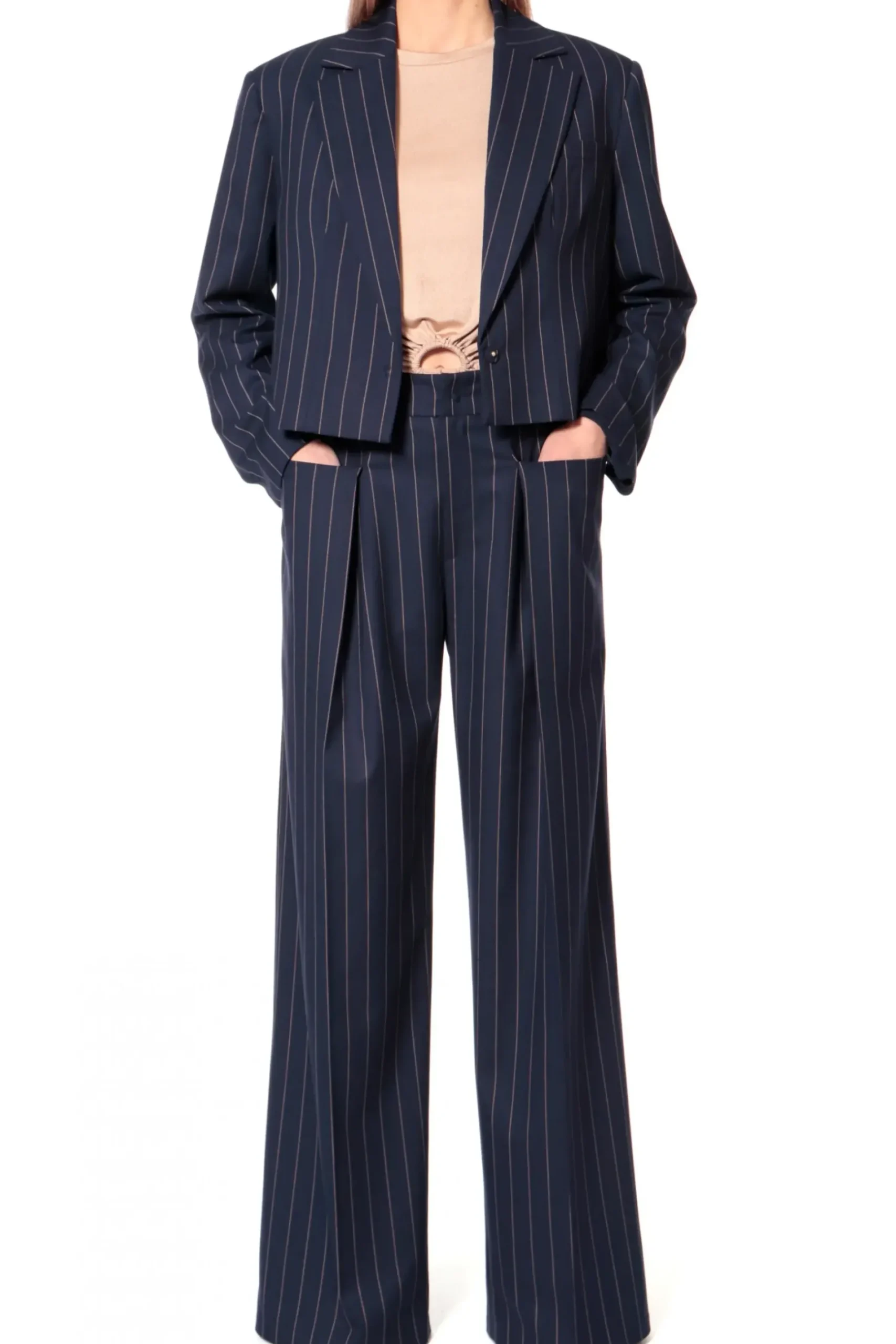 Szerokie Spodnie W Tenisowy Prazek. Wysoka Dopasowana Talia Z Zakladkami Pozostajaca W Kontrascie Z Szerokimi Nogawkami. Boczne Kieszenie Ukryte W Zakladkach Stanowia Ciekawy Element Ozdobny. Projekt Stanowi Jeden Z Elementow Garnituru – Skomponuj Go Z Krotka Marynarka Lora Mood Indigo Lub Oversizowa Marynarka Dora Mood Indigo.